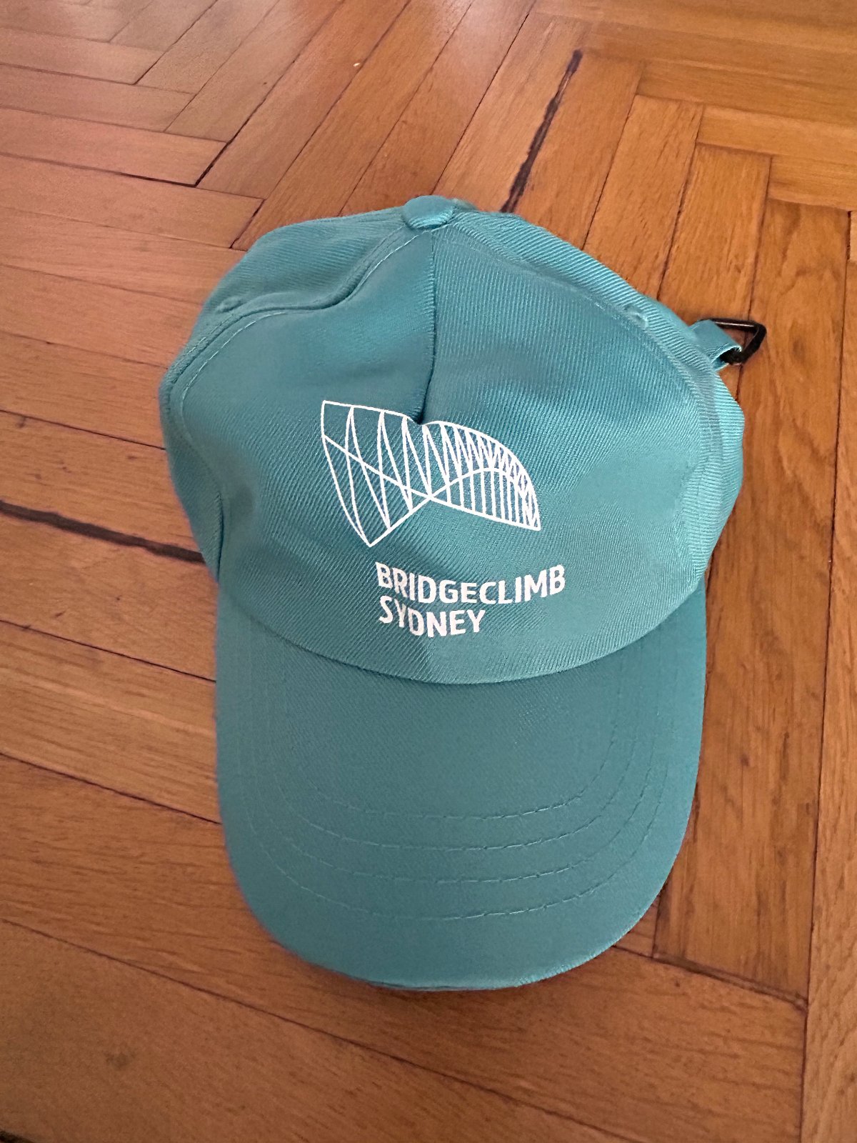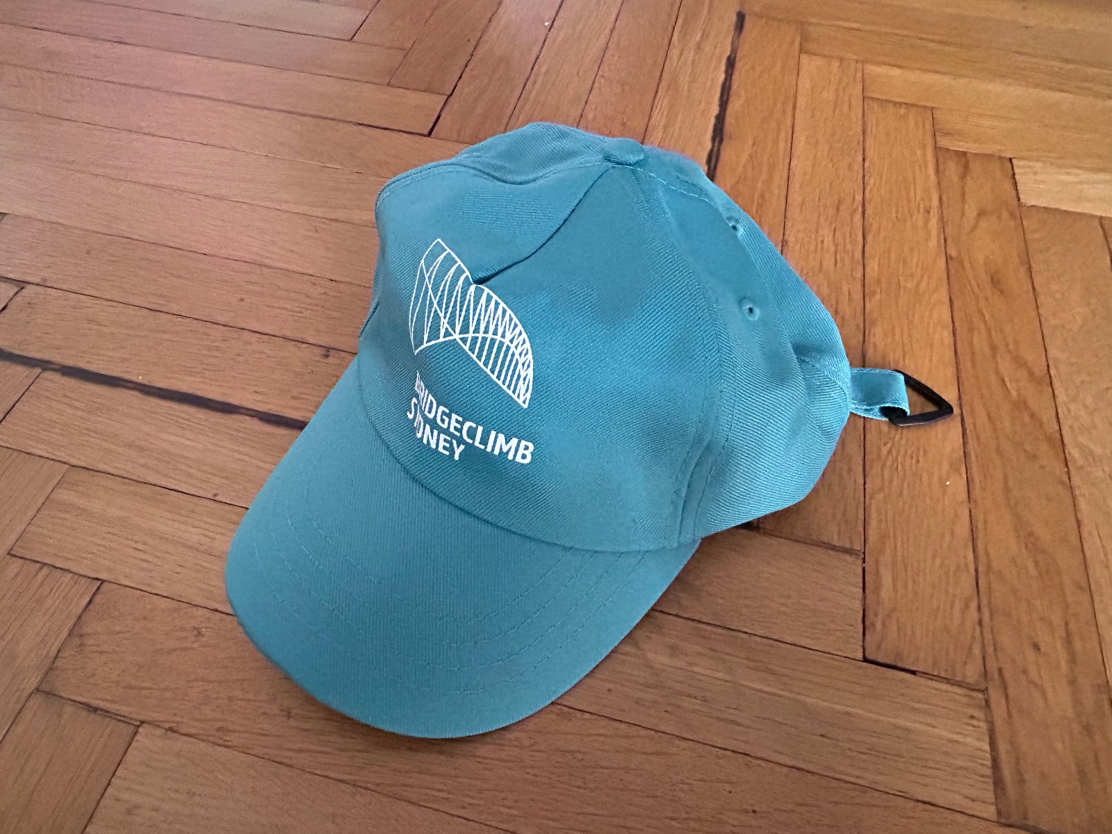 tyrkysovej farby s bielou potlačou mostu v sydney, vzadu nastaviteľná s putkom na pripnutie .