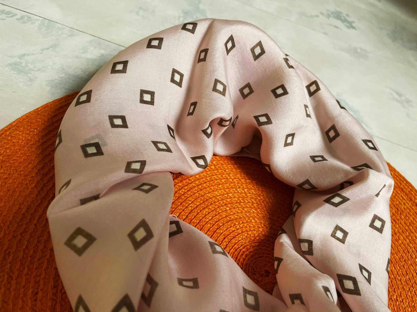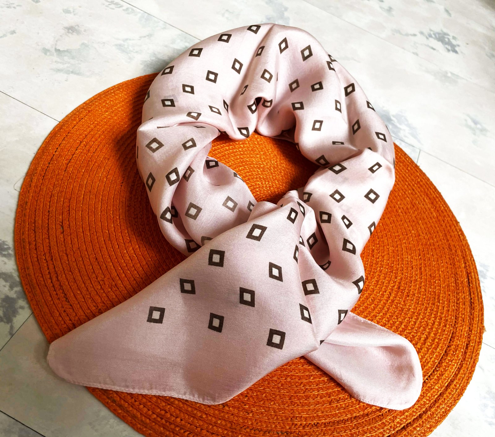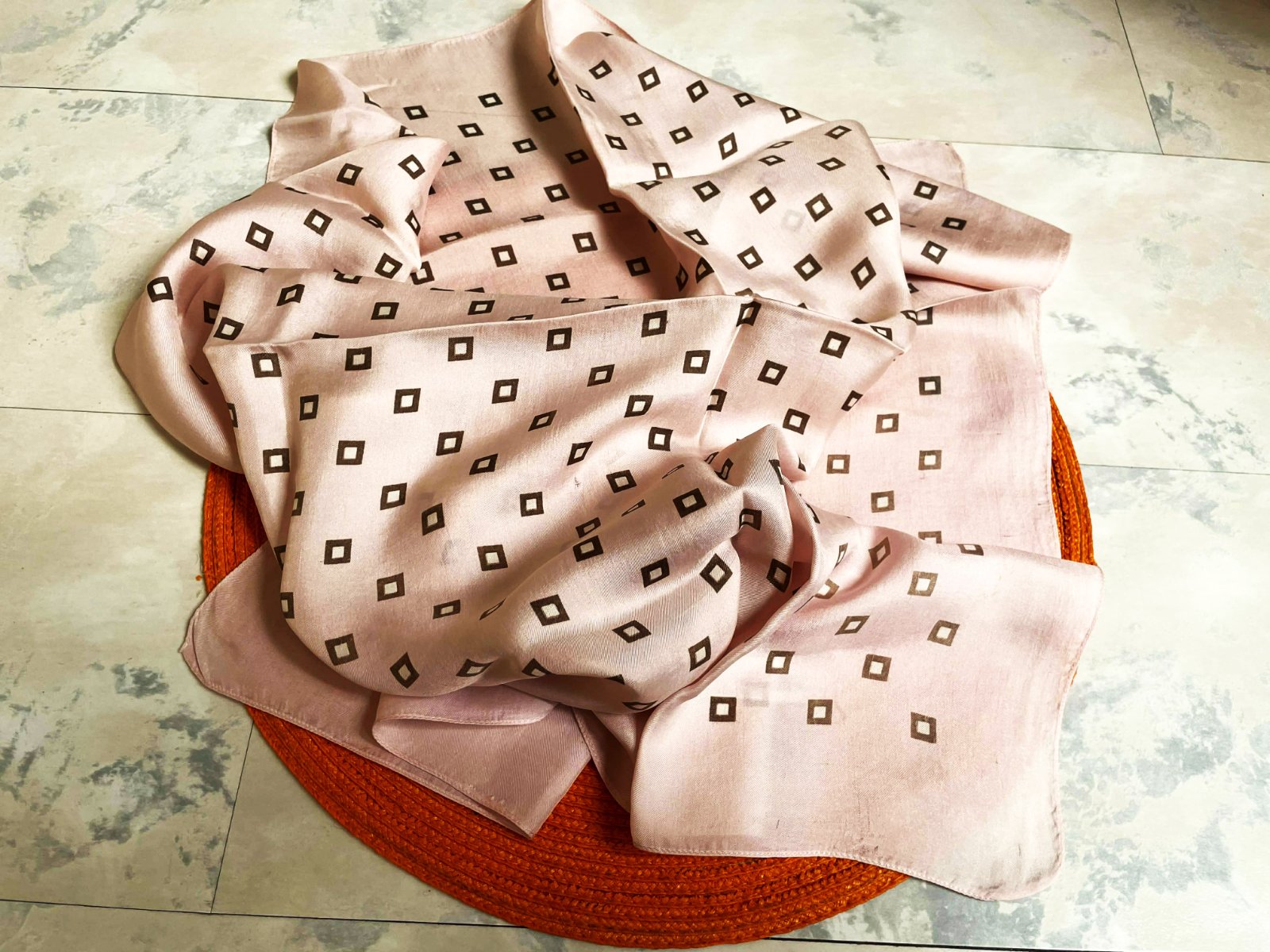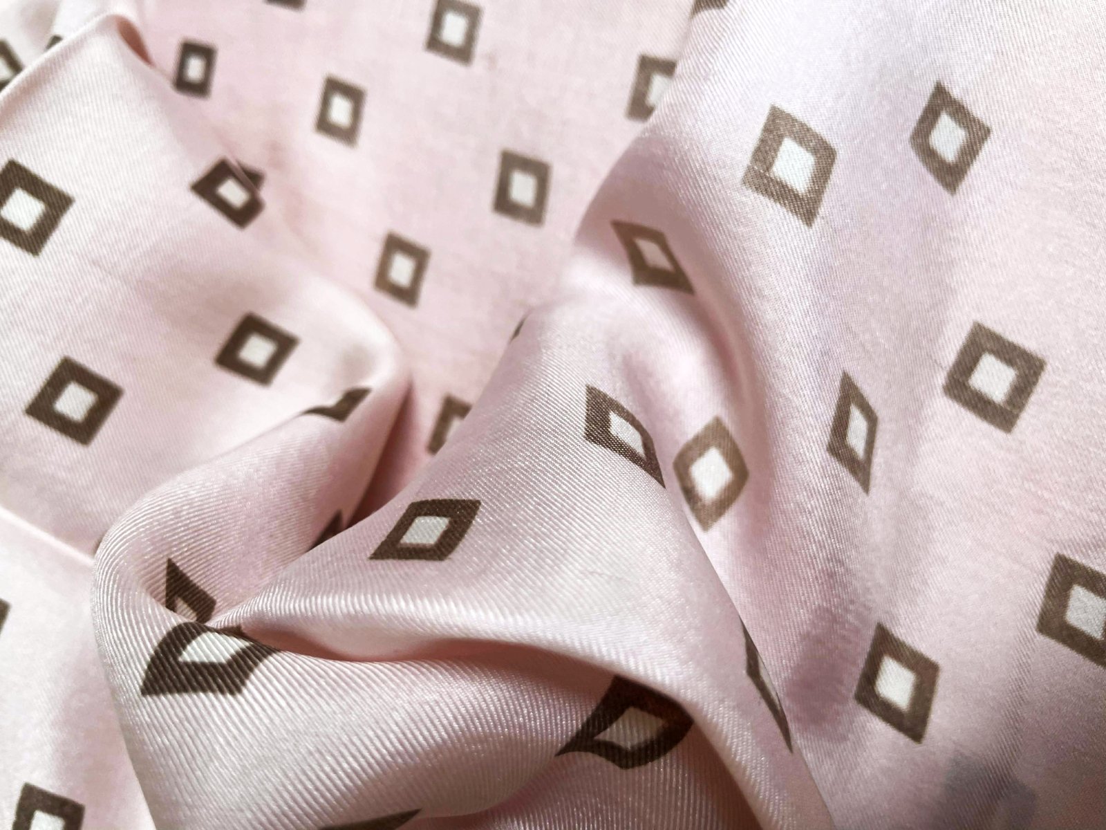 hodvábna ľahúčka šatka v púdrovo ružovej kombinácii s bledohnedou,neviem presne určiť či sa jedná o pravý alebo syntetický hodváb,má jemný atlasový odlesk