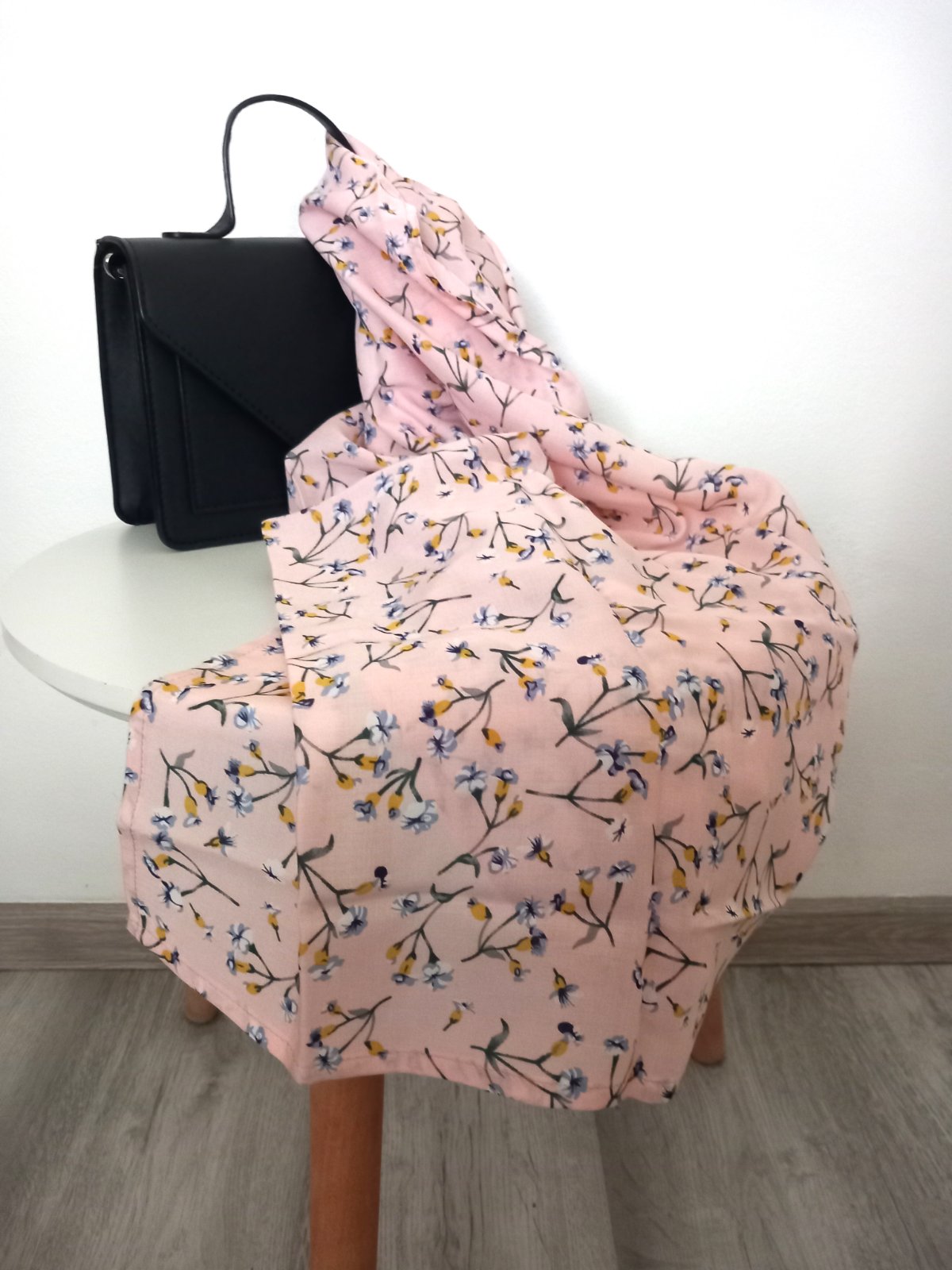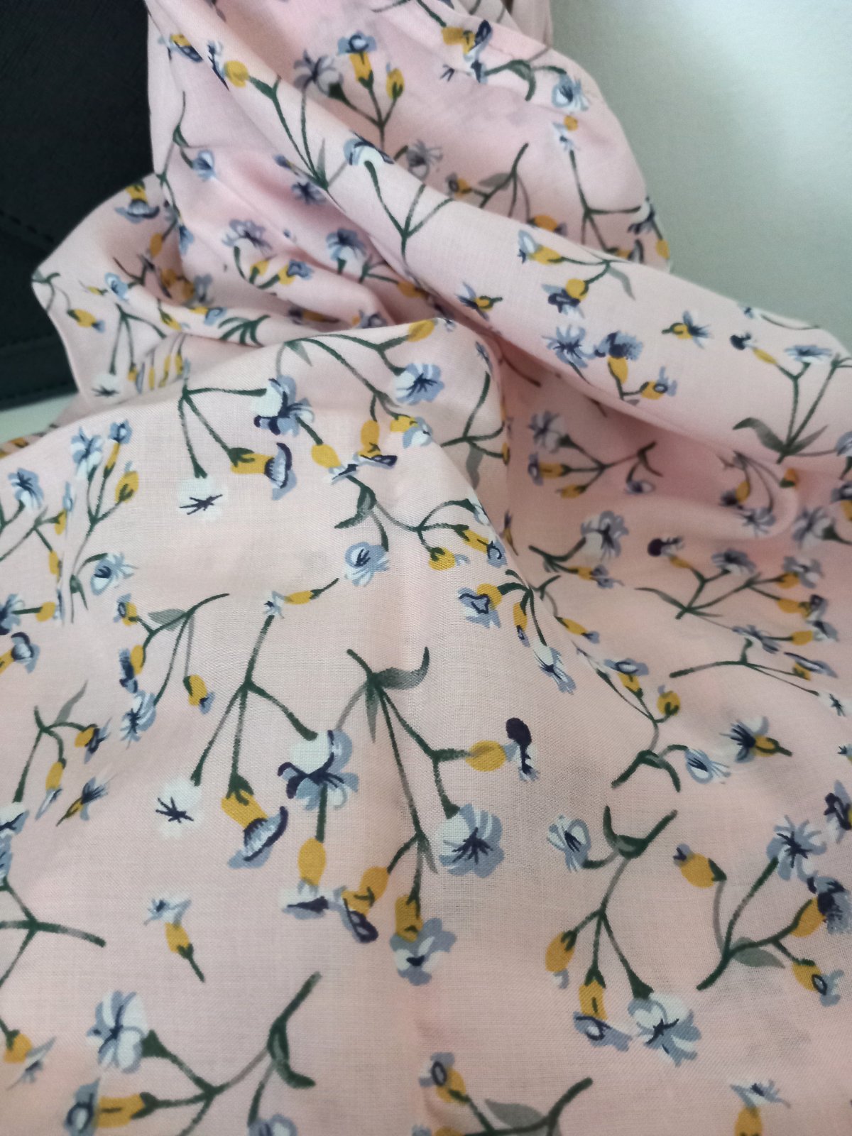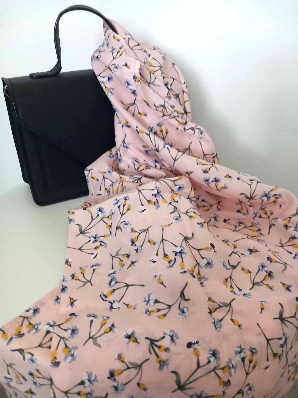 Dámska šatka na krk kvety na rúžovom Dámske šatky na krk vždy patrili ku každej žene ako doplnok .Táto šatka so vzorom malých kvetov na bledoružovom podklade , je elegantná dámska šatka ,ktorá bola pre vás ušitá z tenkej viskózy ktorá je vzdušná , ľahká , padáva a zároveň veľmi príjemná. Dámska šatka je obdĺžnikového tvaru s rozmerom 140 x 50 cm Ponúkaný materiál je vzdušná tenká viskóza .