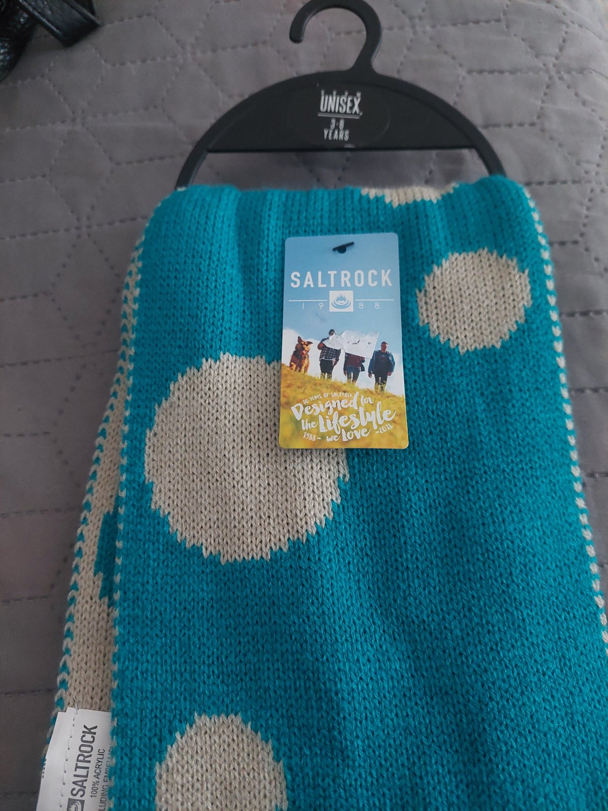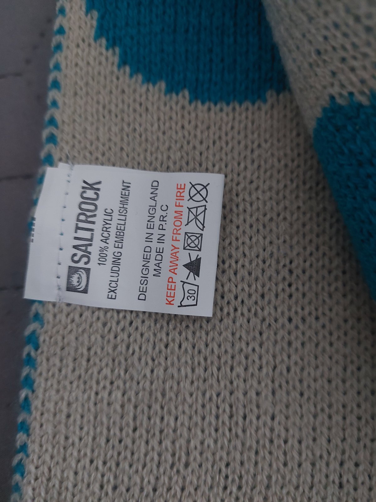 modrý pletený šál s farebnými čiarkami, bez poškodení, v dobrom nosenom stave. Miery: šírka = 24 cm, dĺžka = 170 cm.