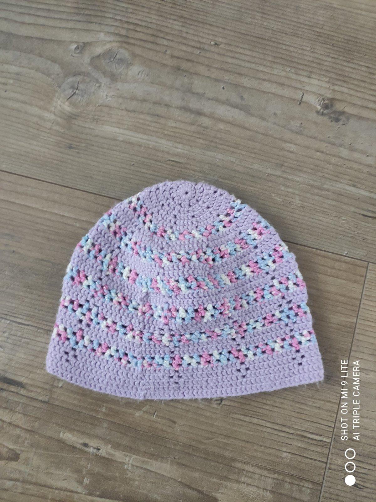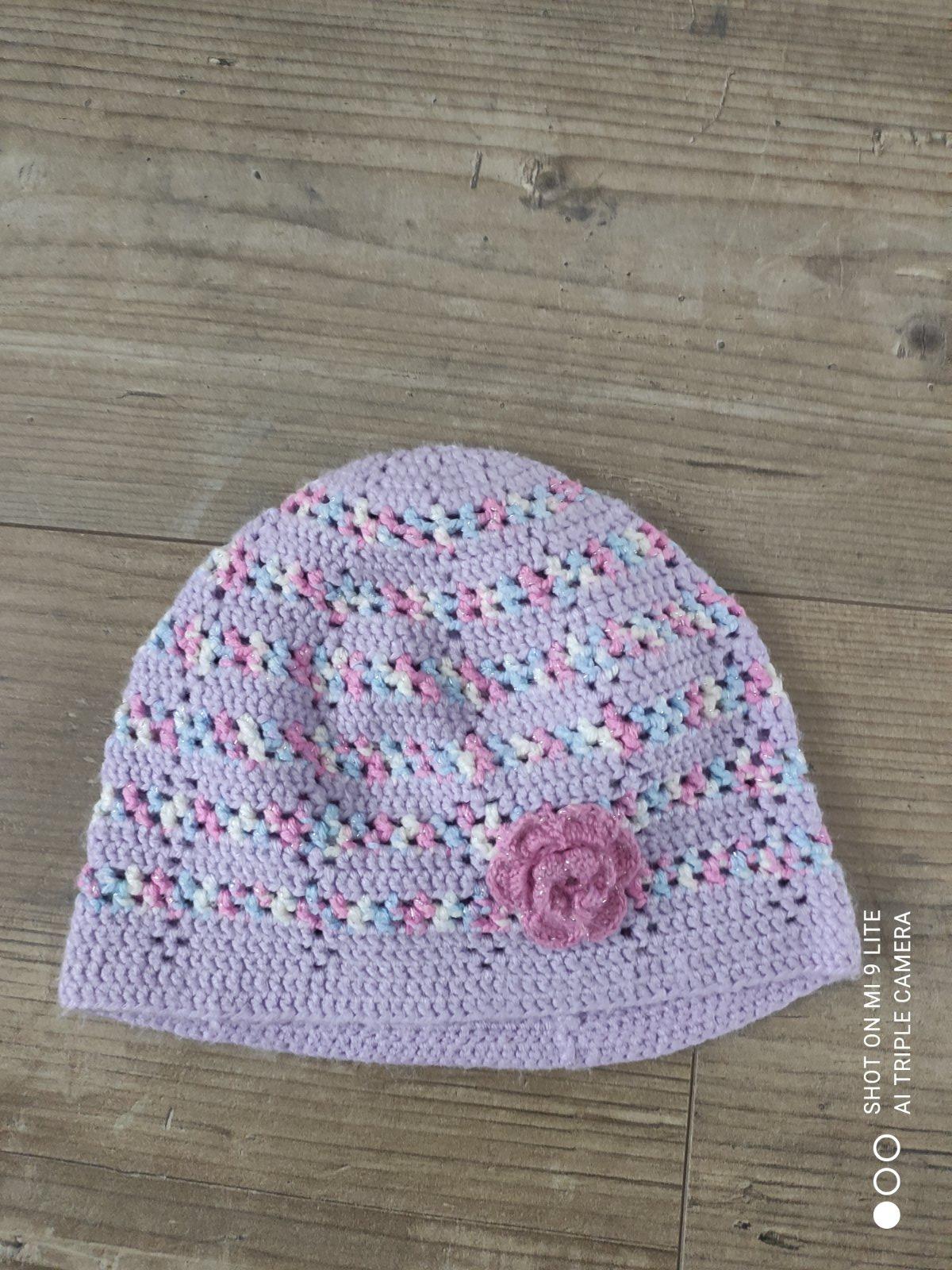 krasna rucne robena ciapka s kvetinkou . odtiene fialovej, ruzovej