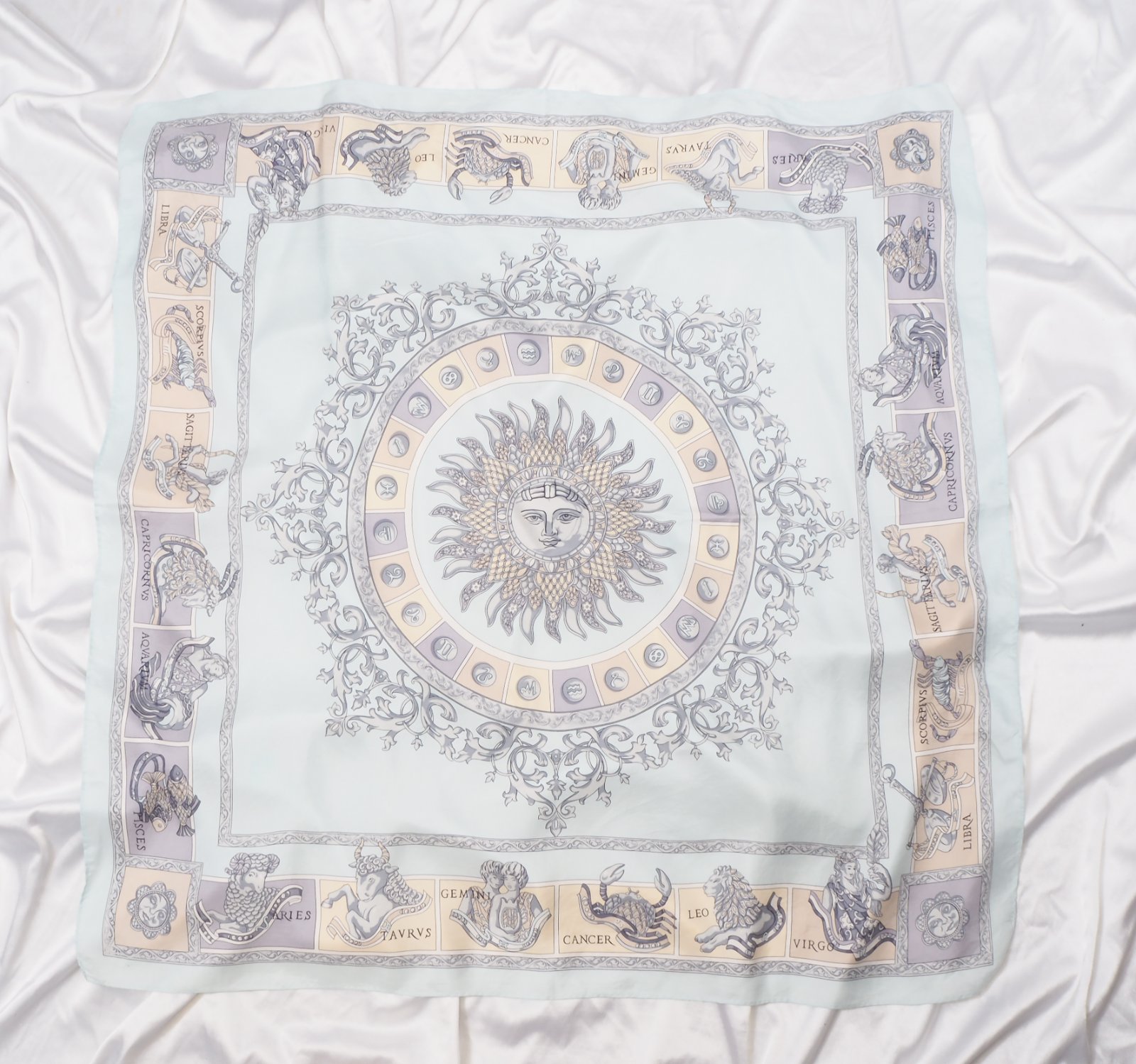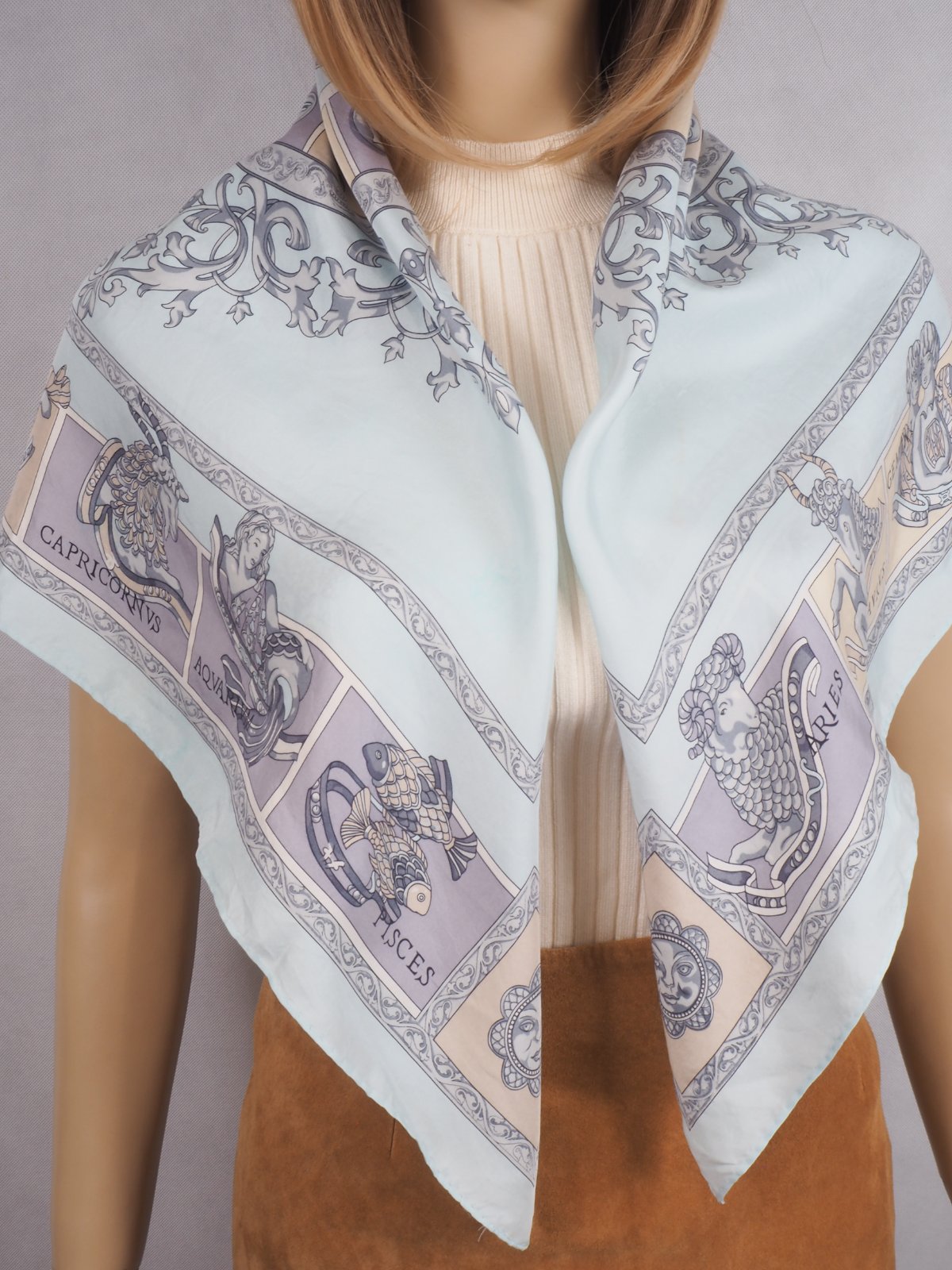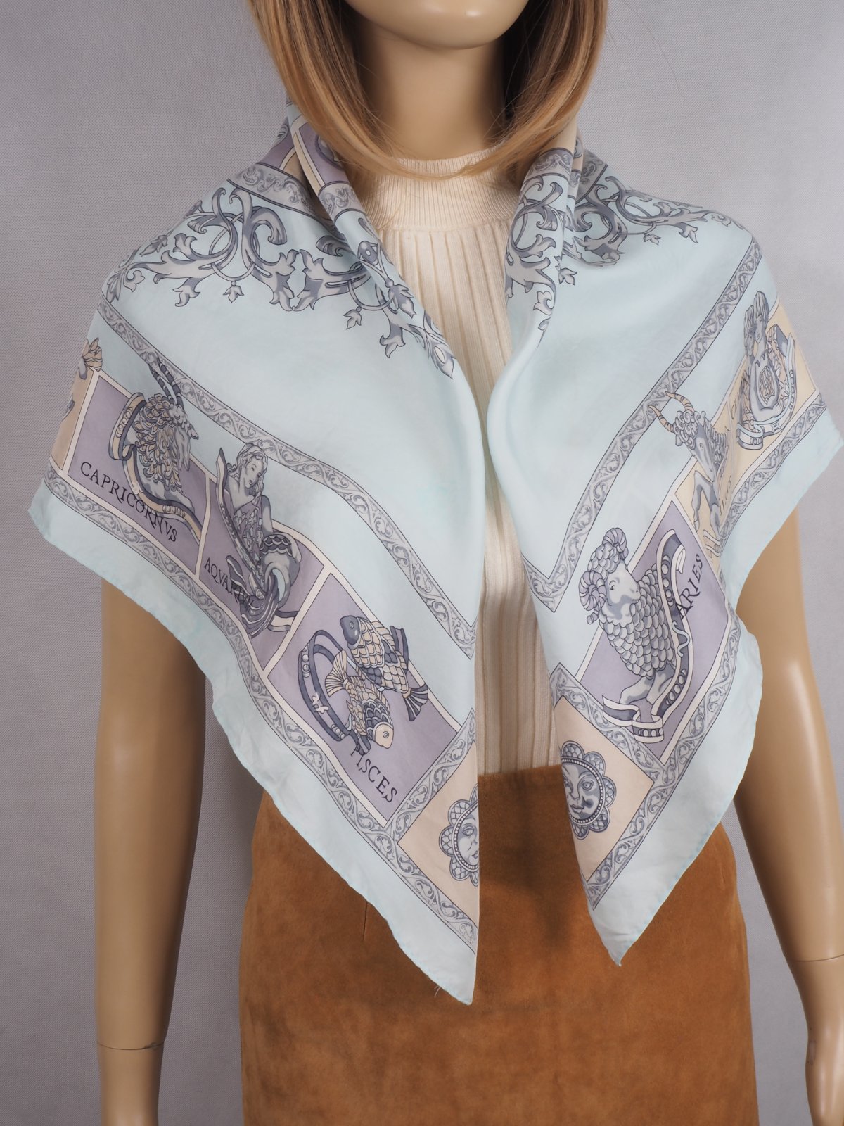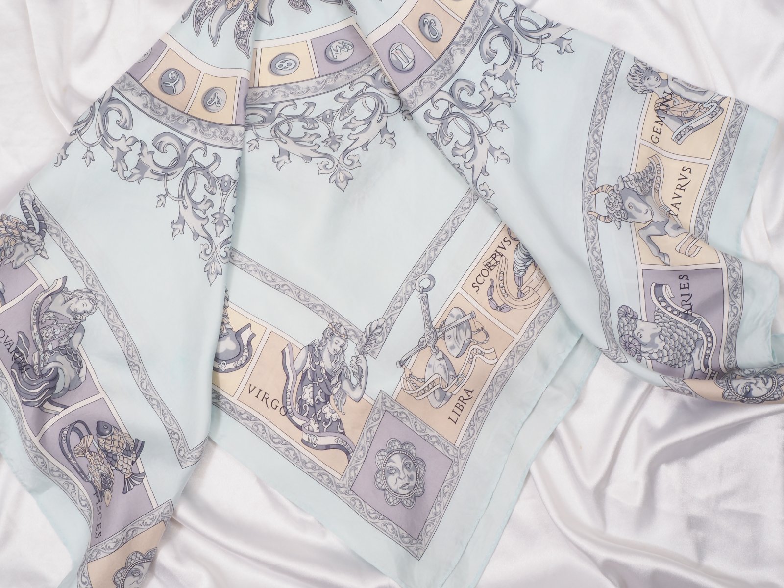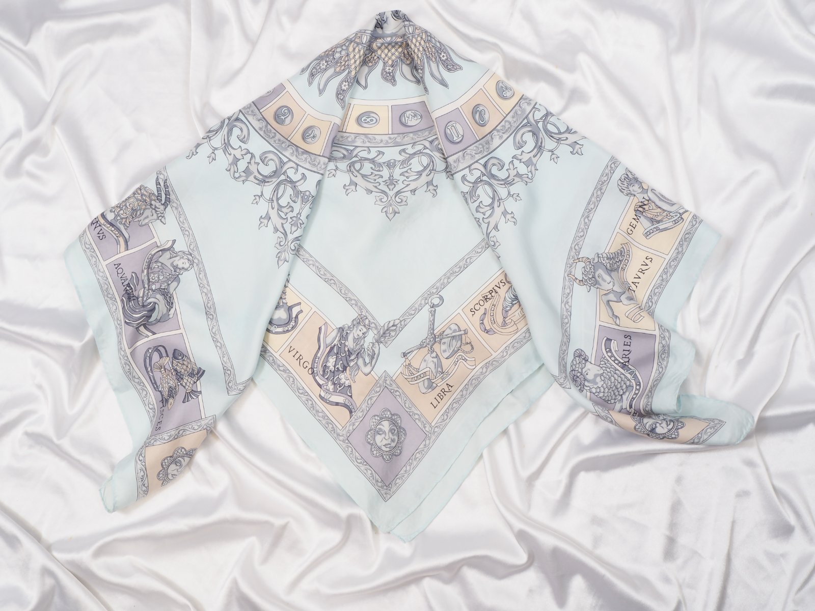 Luxusná hodvábna šatka belasomodrej farby, s krásnou potlačou, rozmer 86x88 cm....super stav.