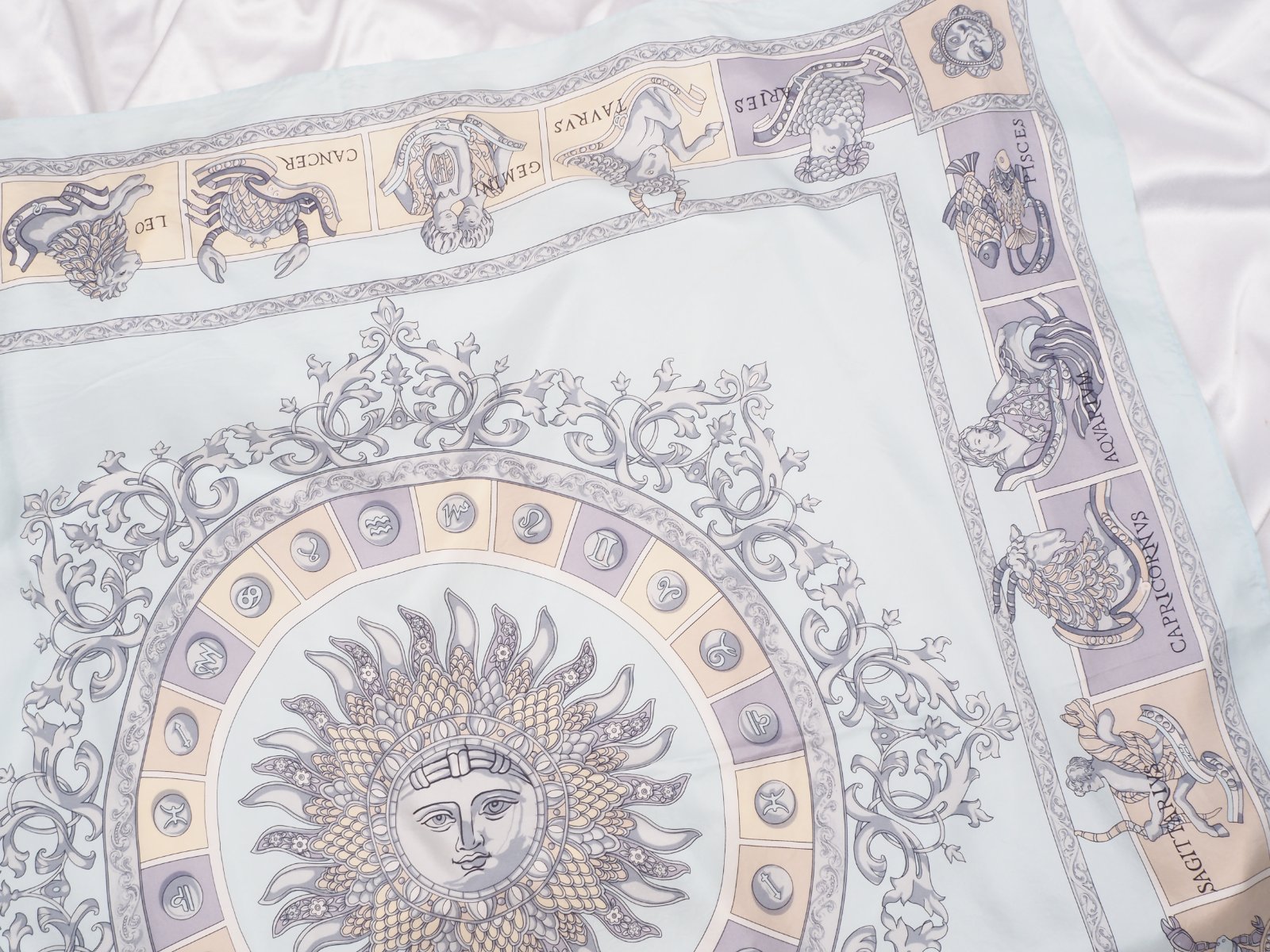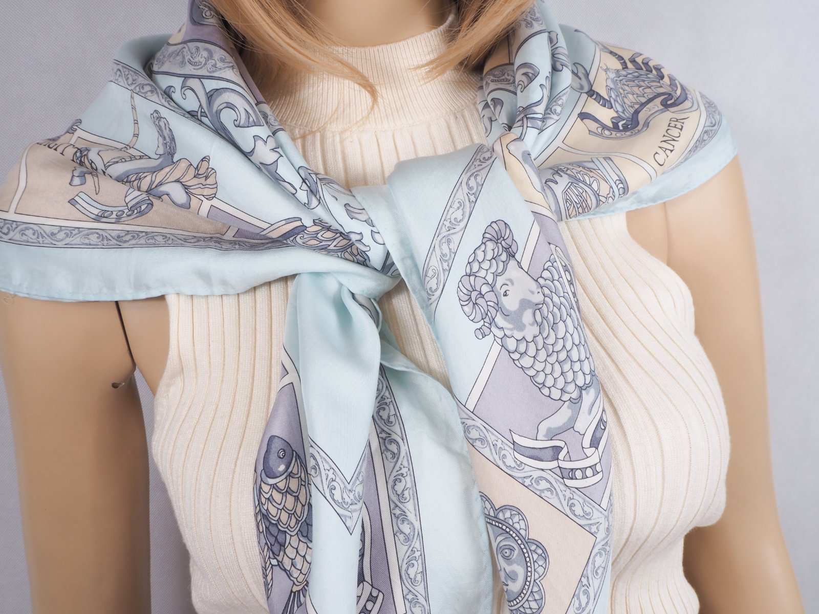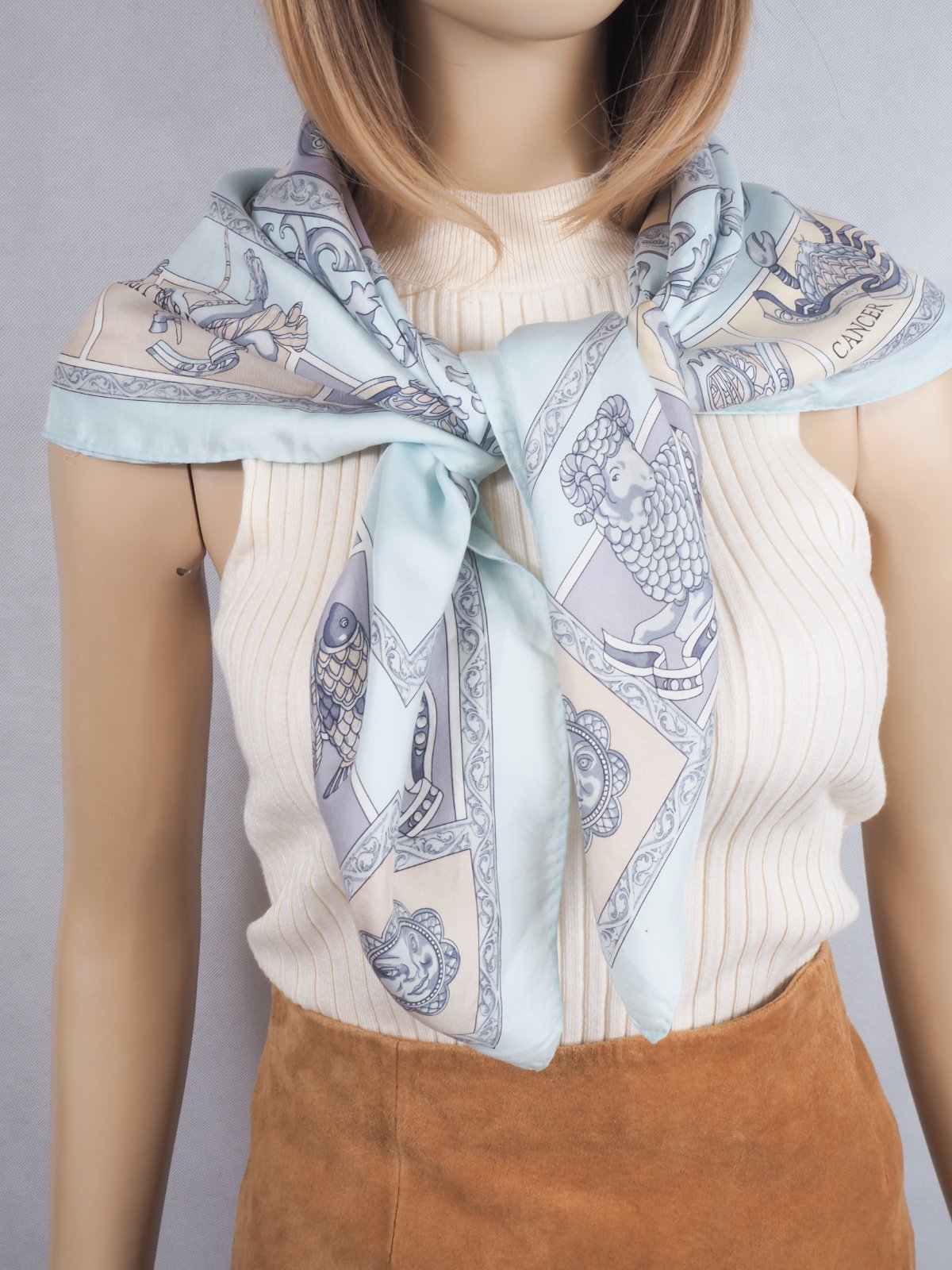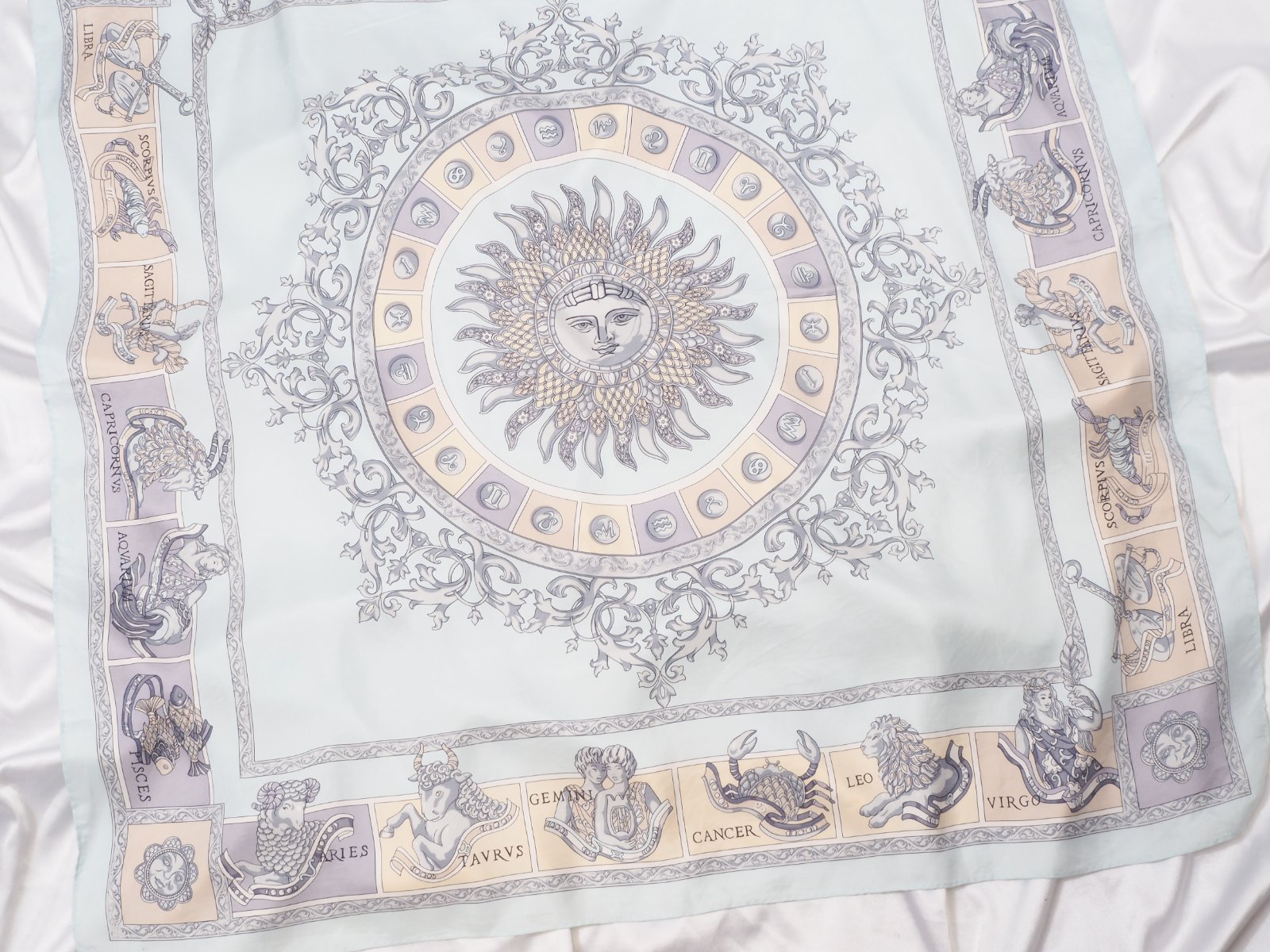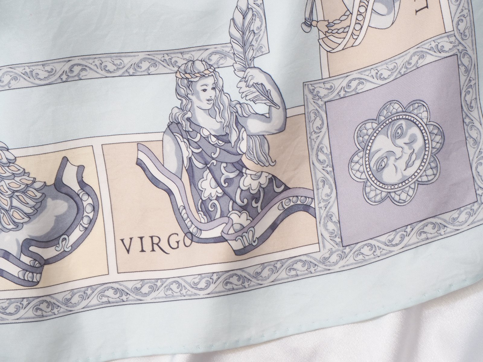Luxusná hodvábna šatka belasomodrej farby, s krásnou potlačou, rozmer 86x88 cm....super stav.