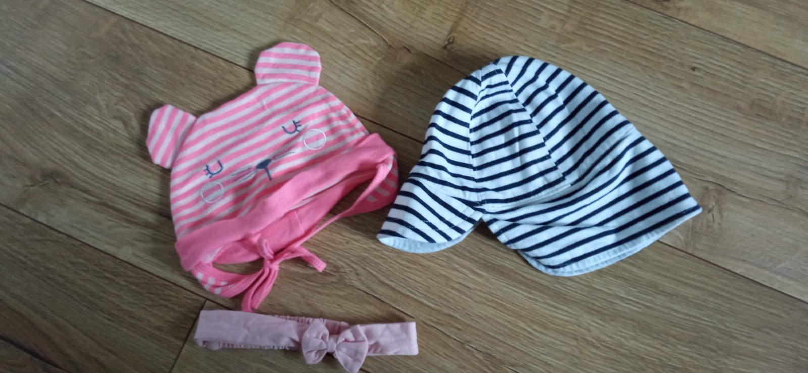 Predám málo nosené čiapky pre bábätko. Ako nové. Pasikovana čiapka je teplejšia vhodná do prechodného obdobia veľkosť pre bábätko od 6-12 mesiacov. Ružová tenšia čiapka a čelenka majú veľkosť 74. Predávam to ako set.