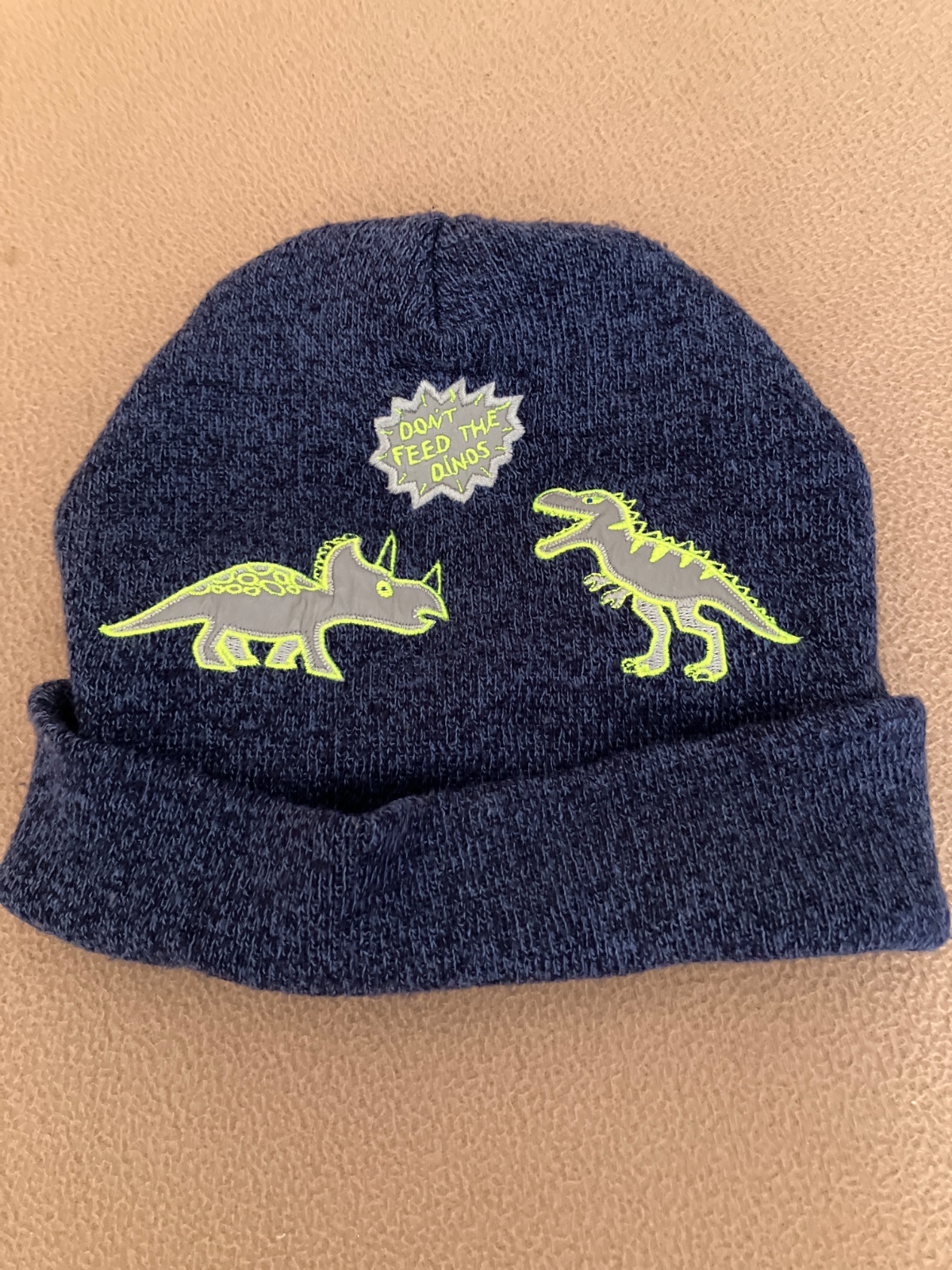 Hrubá teplá čiapka s reflexnými dinosaurami. Nepoškodená