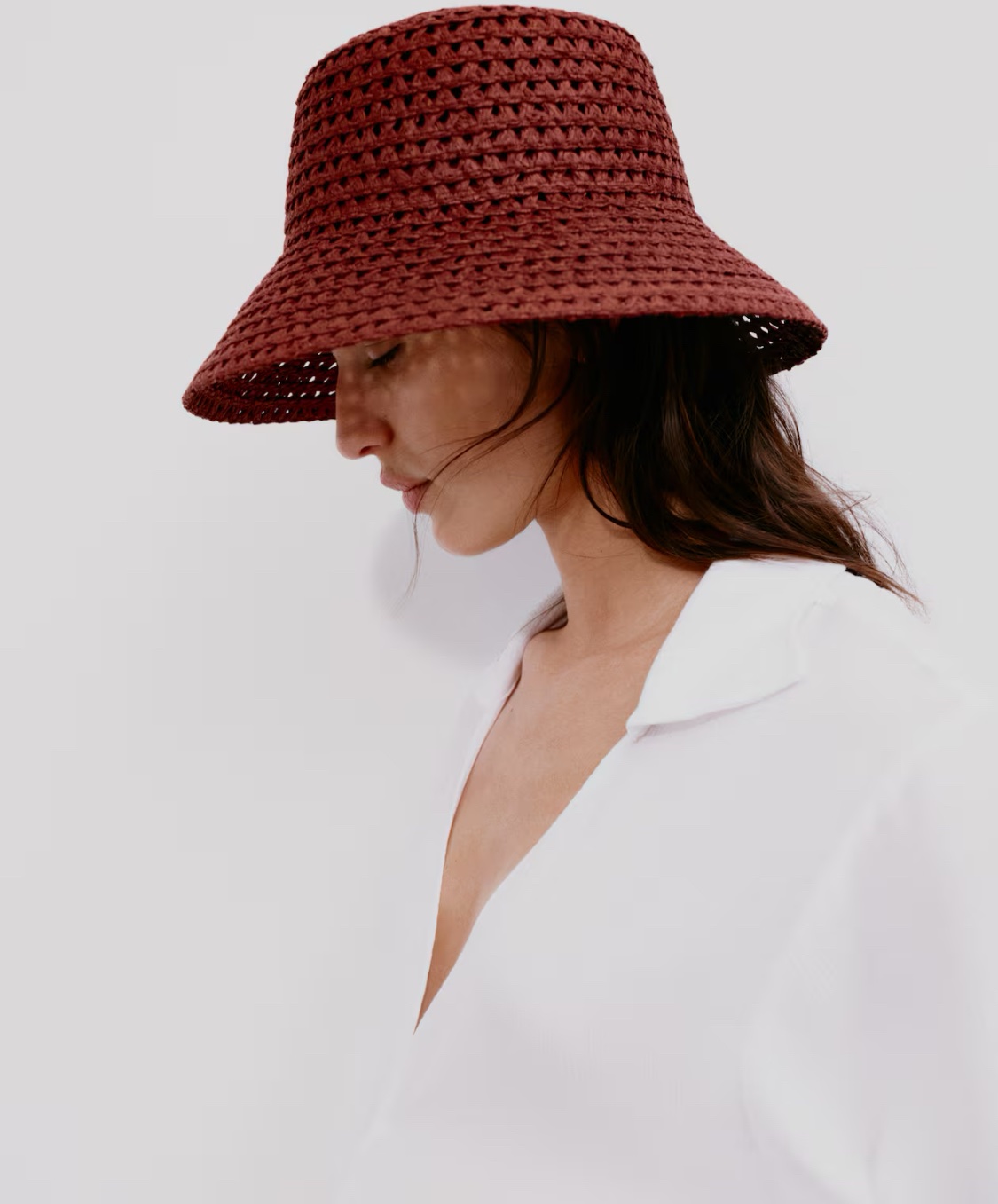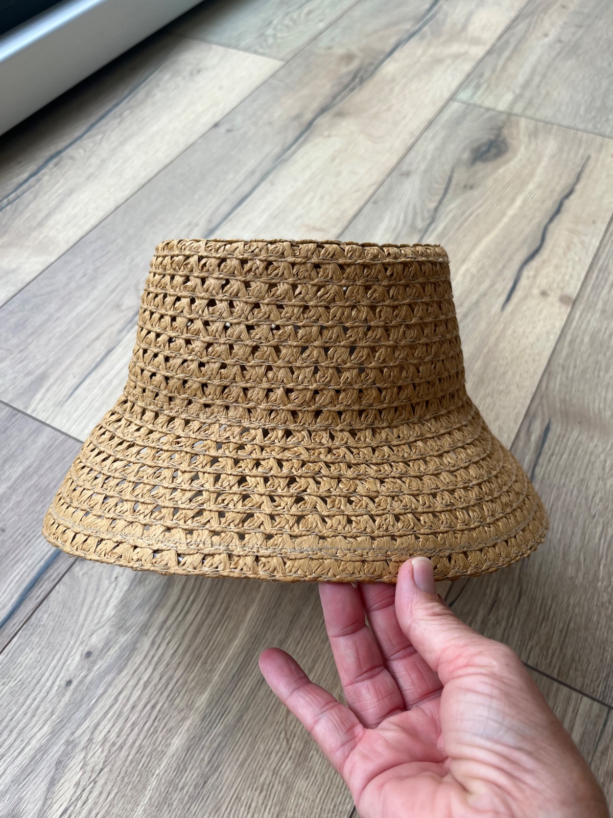 Klobúk zo spletenej papierovej slamy so širokou sikmou strieškou a potnou páskou - velkost 56 - aktuálna kolekcia / mnou použitý max 2x aj to iba chvíľku - potna páska jemne prečistena / stav ako nový