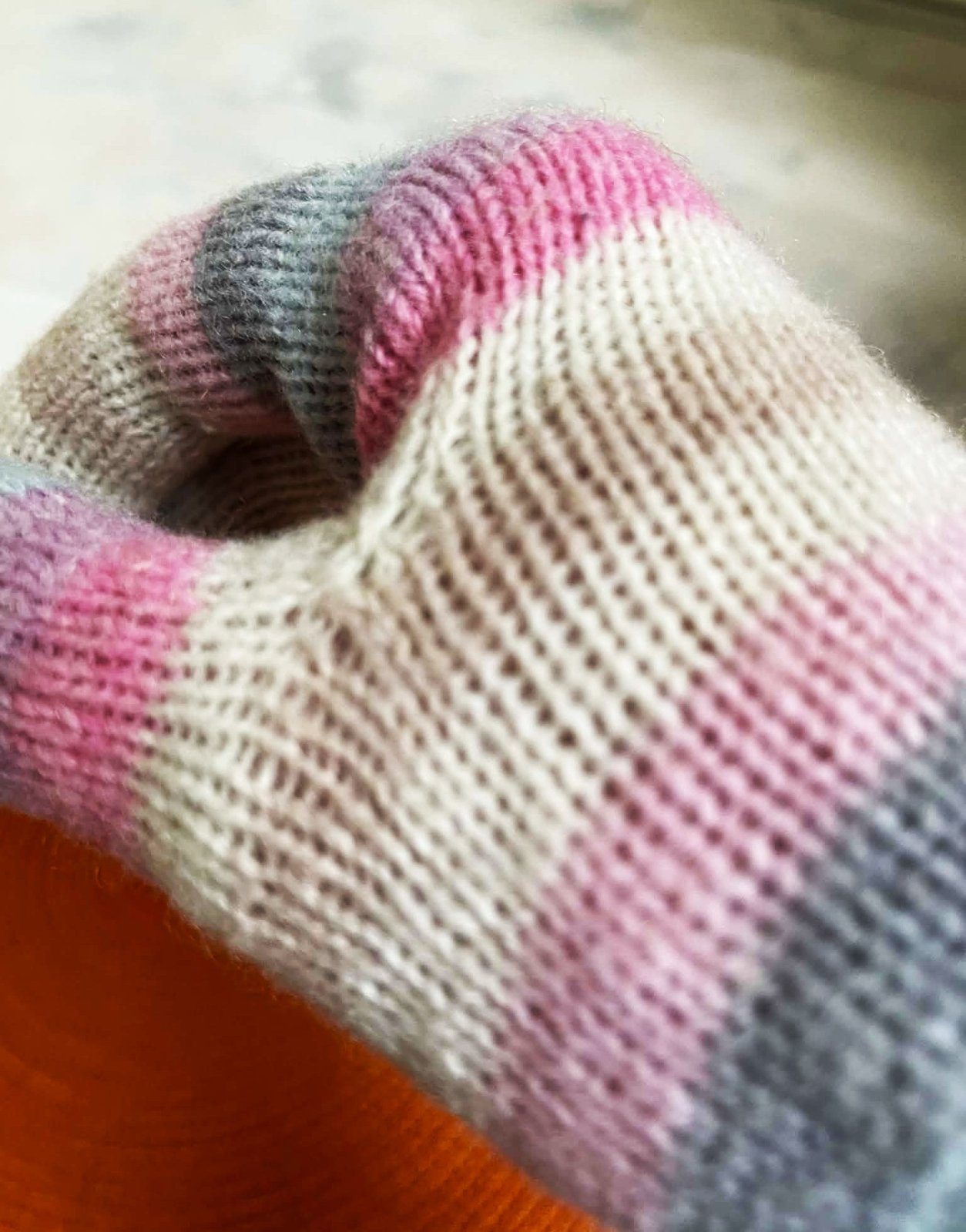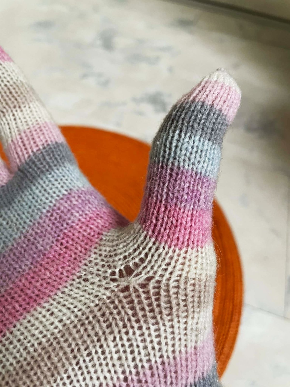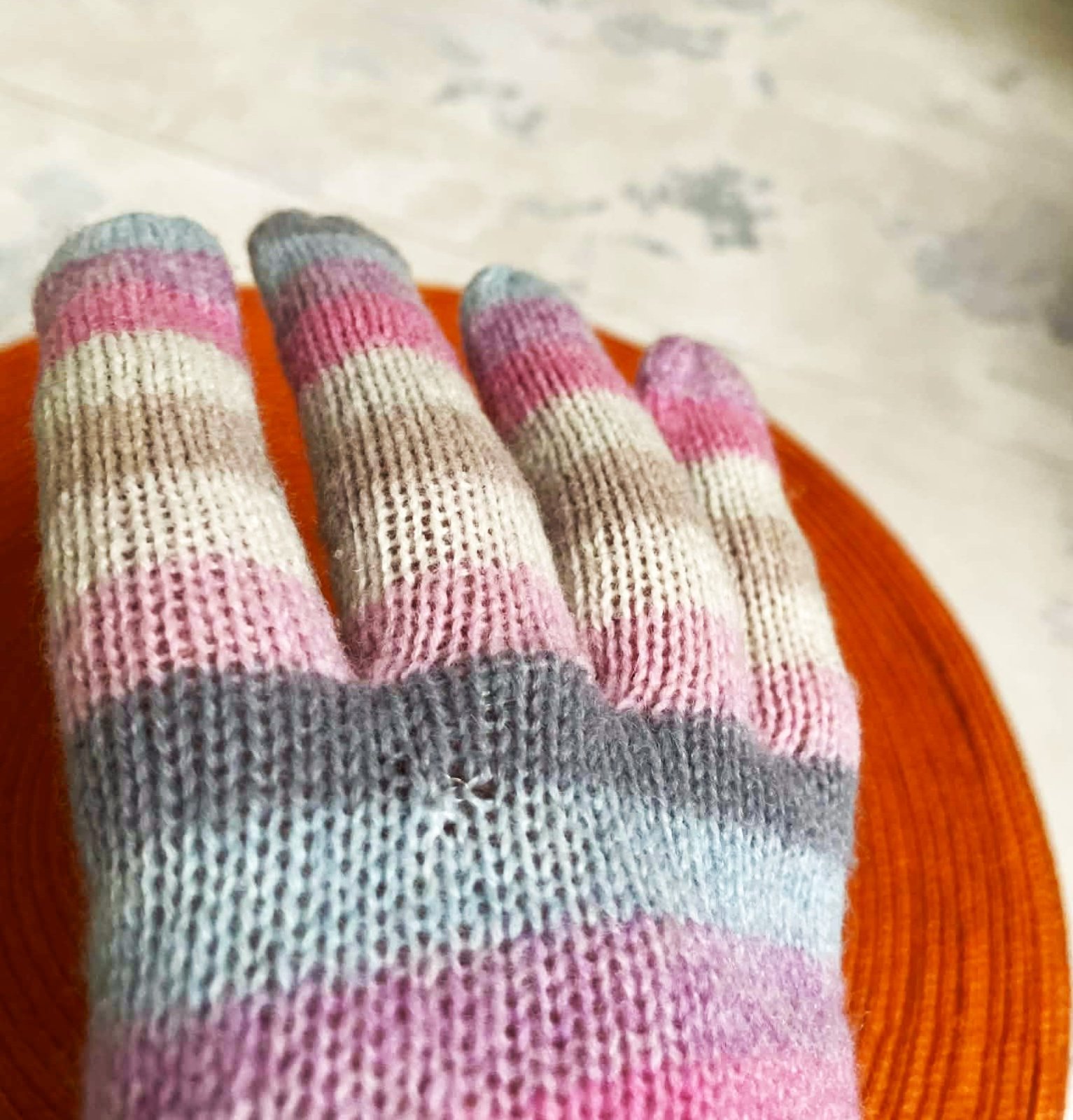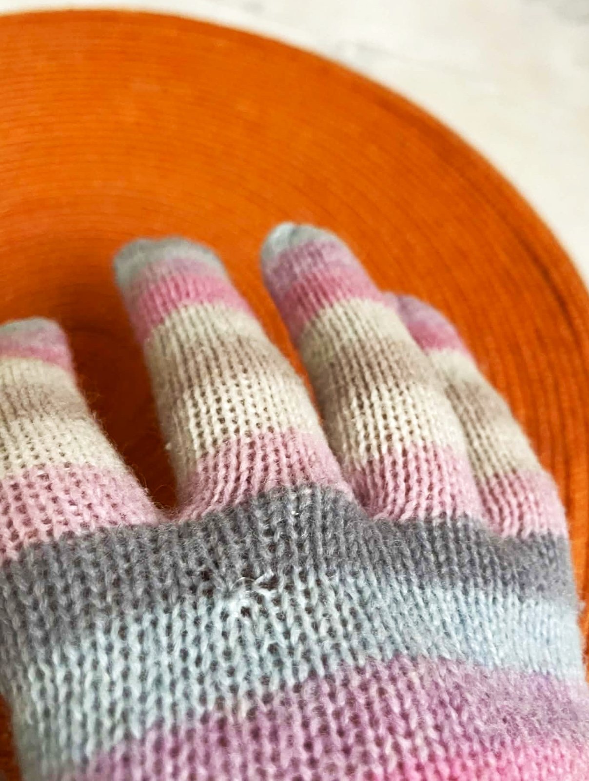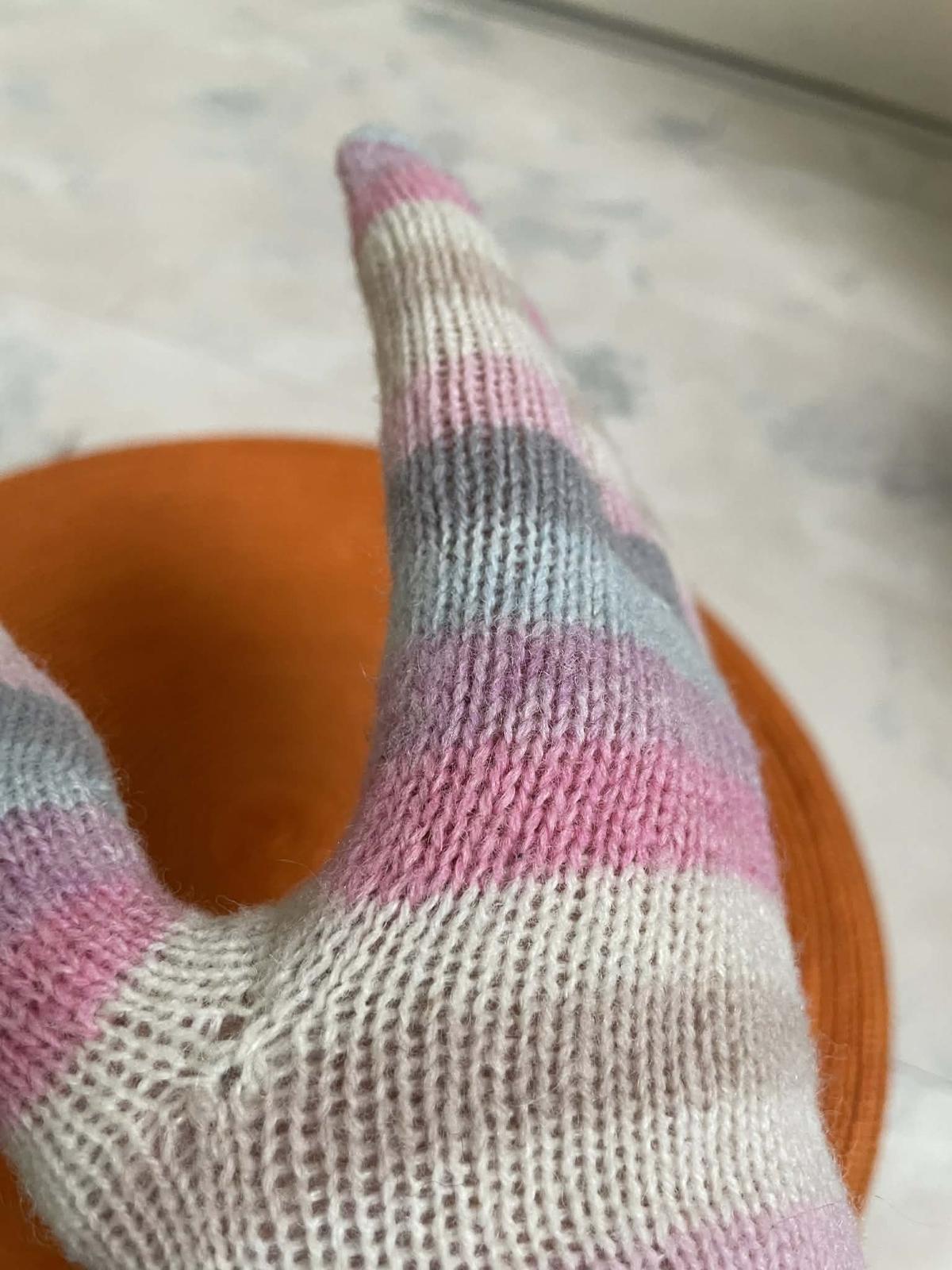 z vnút. strany majú uvoľnené očká,predpokladám,že od moľov,tak som to s priesvitným silonom zachytila,nie je to moc vidieť - ale som to nafotila,inak sú rukavice krásne a nezvyčajné