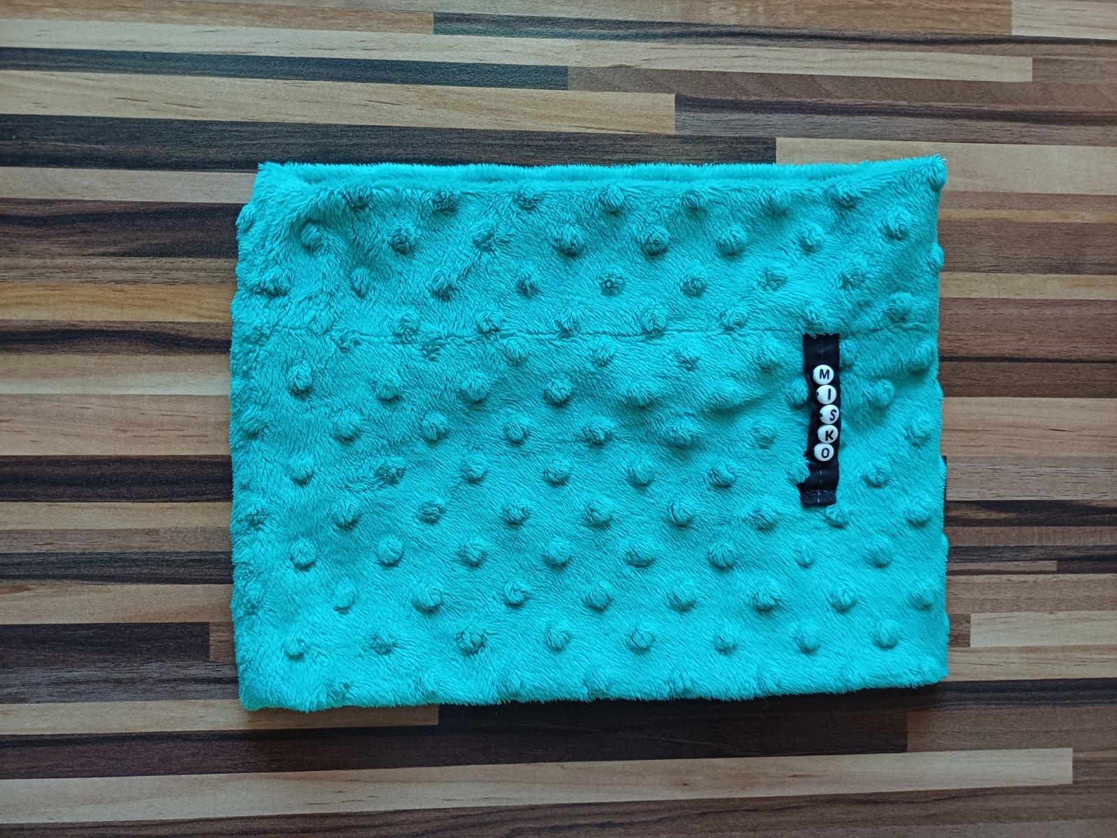 Flísový šál, farba tyrkysová (bledomodrá). Navlieka sa cez hlavu. Veľkostne tak na vek 6-10 rokov. Rozmery v kľude: obvod 25 cm x 2, výška 18 cm.