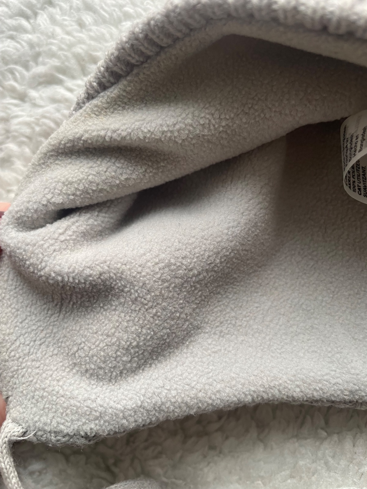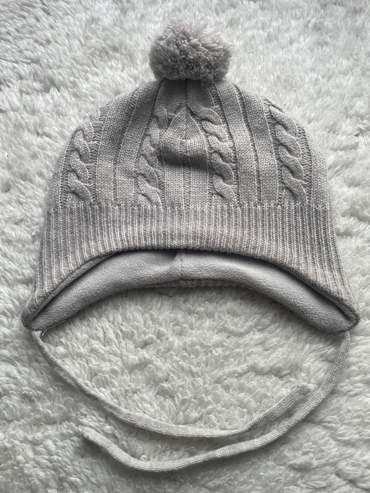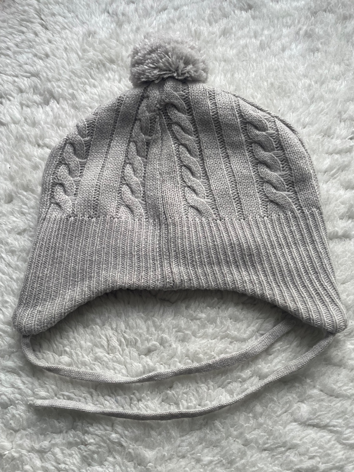 Seda pletena ciapka s brmbolcom so snurkou na uvazovanie, podsita dekovinou, velkost 62/68, 3-6m, raz vzata