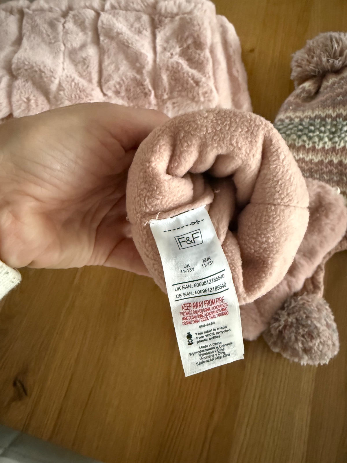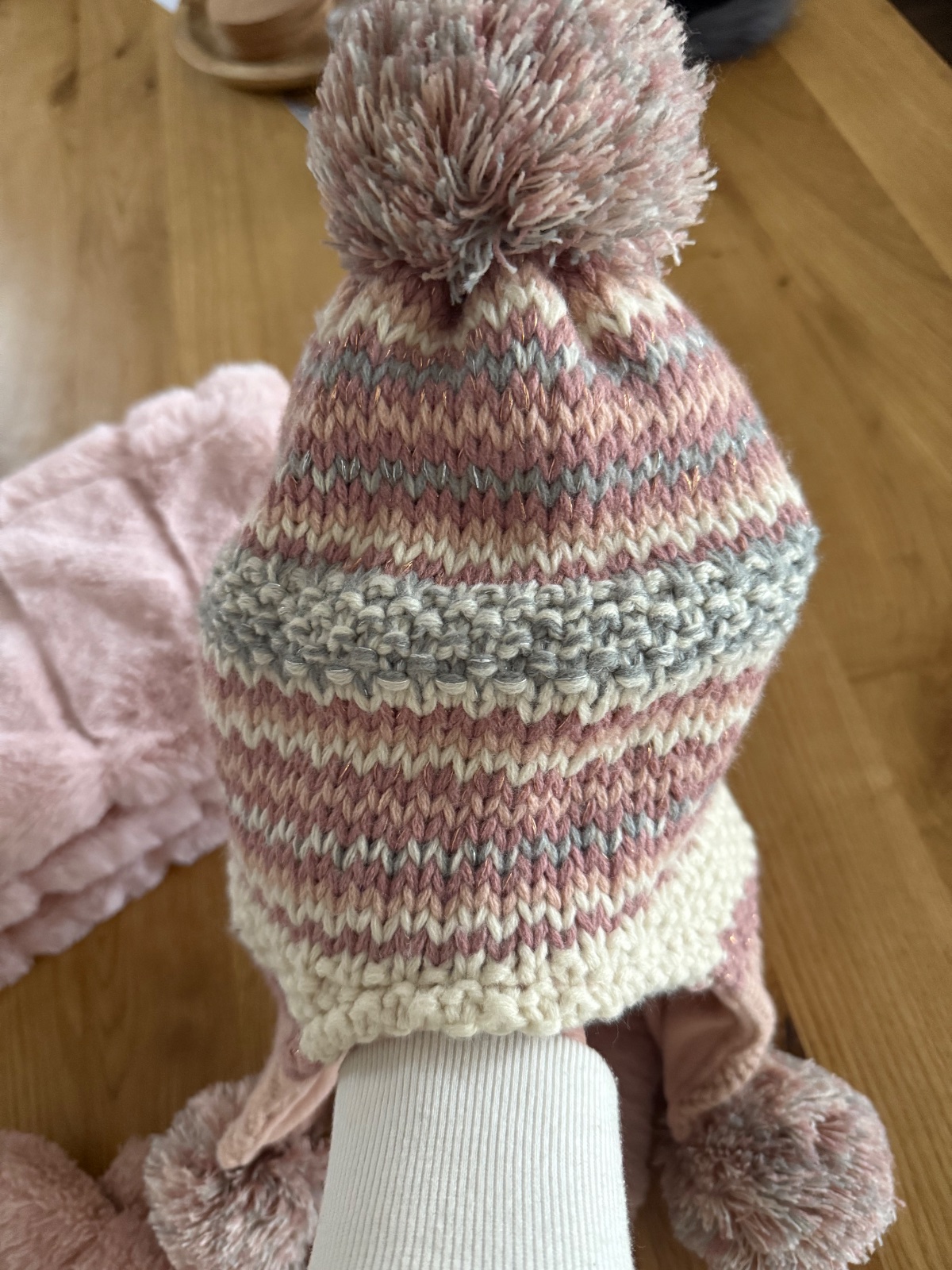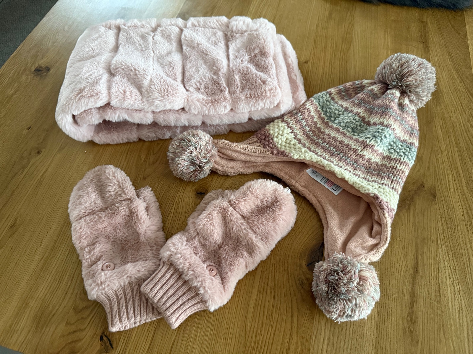 Teplá huňatá súprava, kožušinkový šál s rukavicami, ktoré sa dajú zapat o gombík, aby prsty boli vonku a čiapka s brbmolcami. Top stav.
