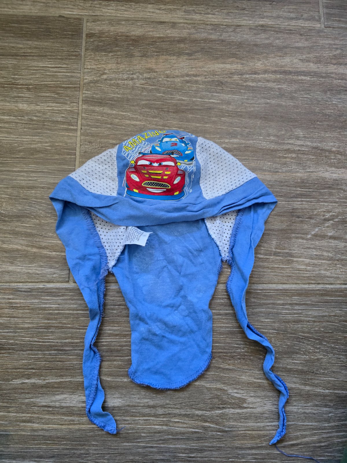 Klobucik so siltom a predlzenim na krk. Dizajn dinosaura. Velkost 3-6 mesiacov. Stahovanie za hlavickou. Bez poskodeni.