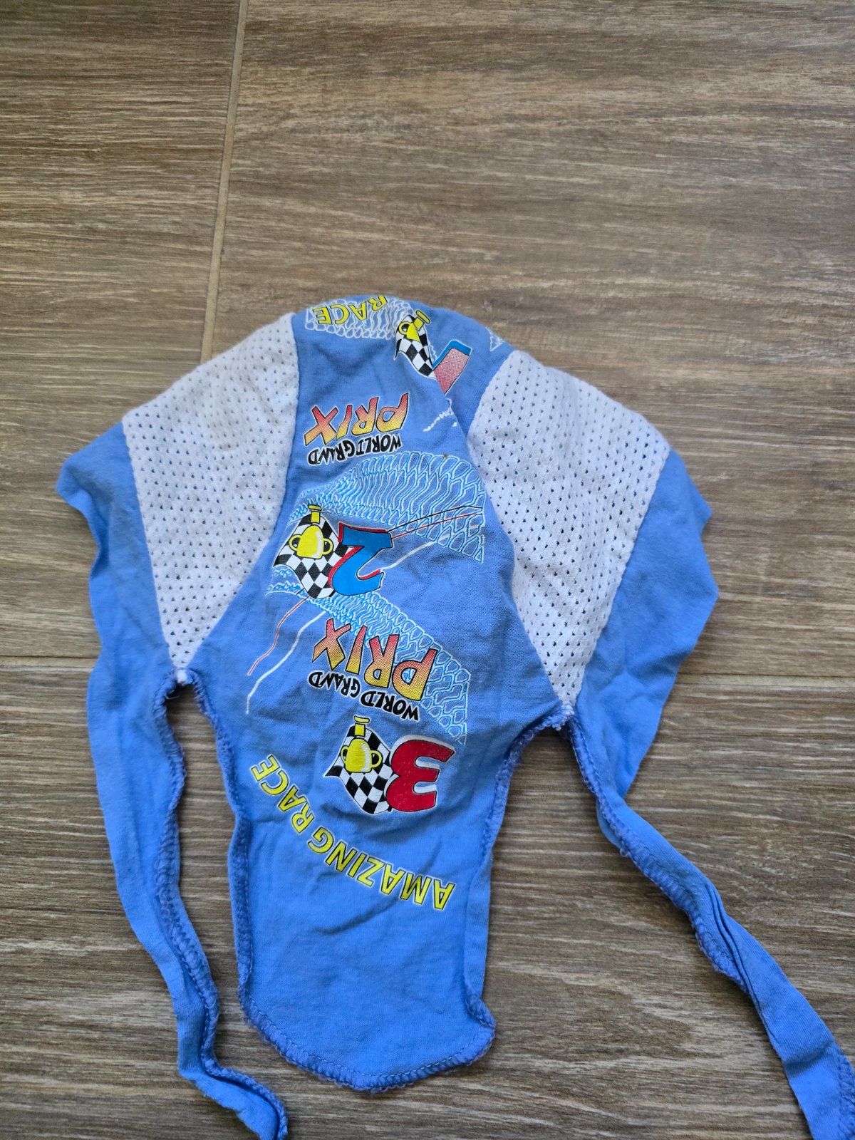 Bavlnena piratka na hlavu,vzadu na viazanie s krytim krku. Oznacenie velkosti 1 - moj syn nosil vo veku 3 mesiace. Posledna fotka uvadza velkosti ciapok v porovnani s obvodom hlavy. Cena + posta