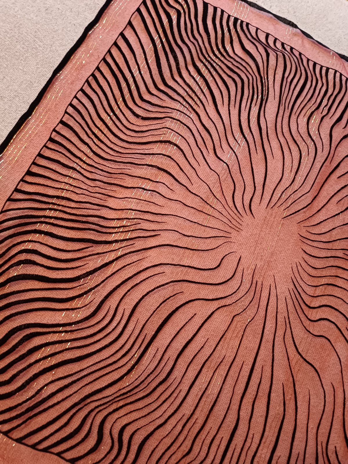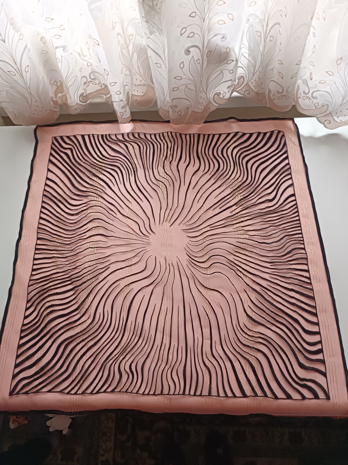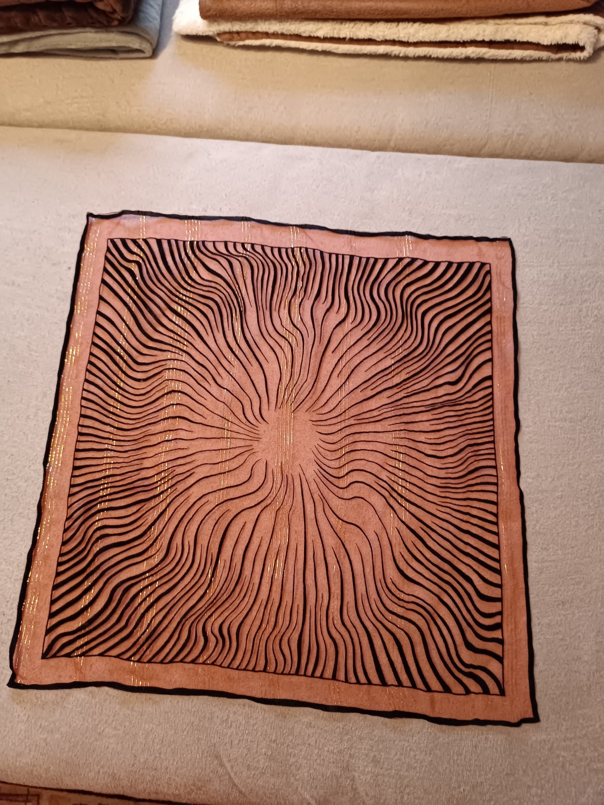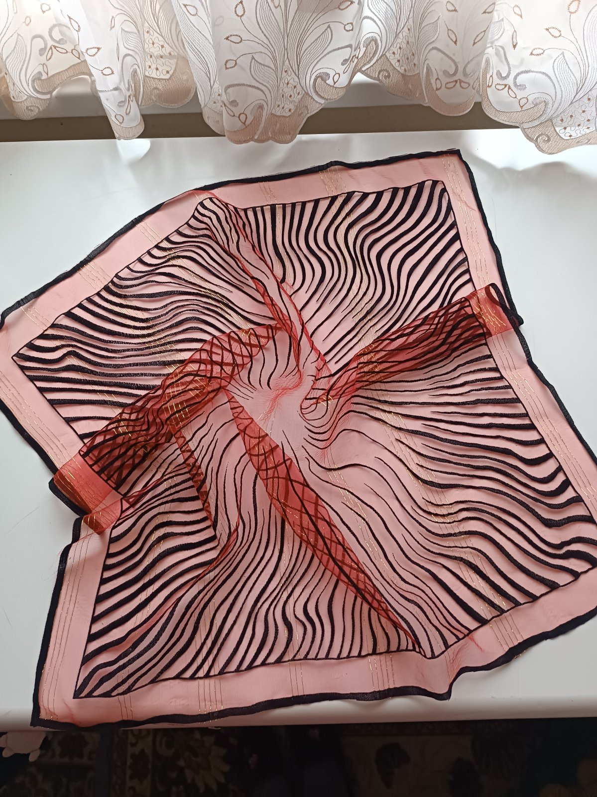 Minimálne nosená, rozmery cca 62x64 cm. Je to ľahká, priesvitná a jemne klzká tkanina.