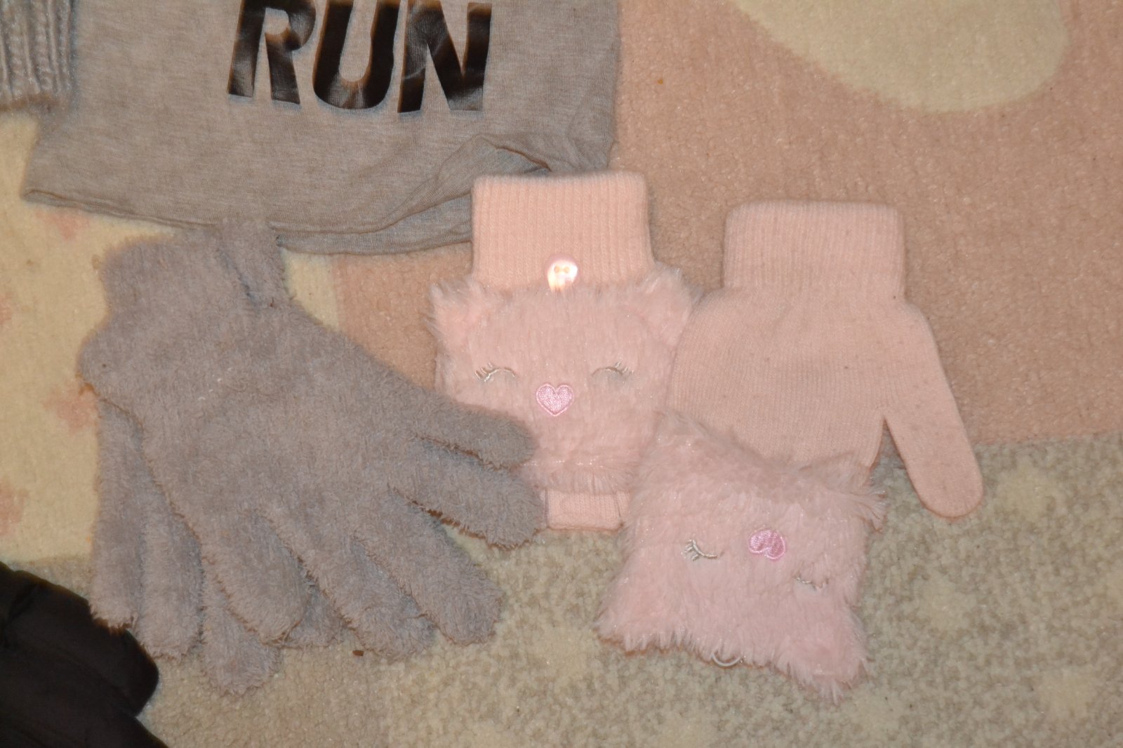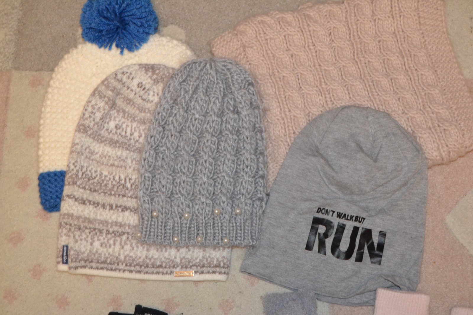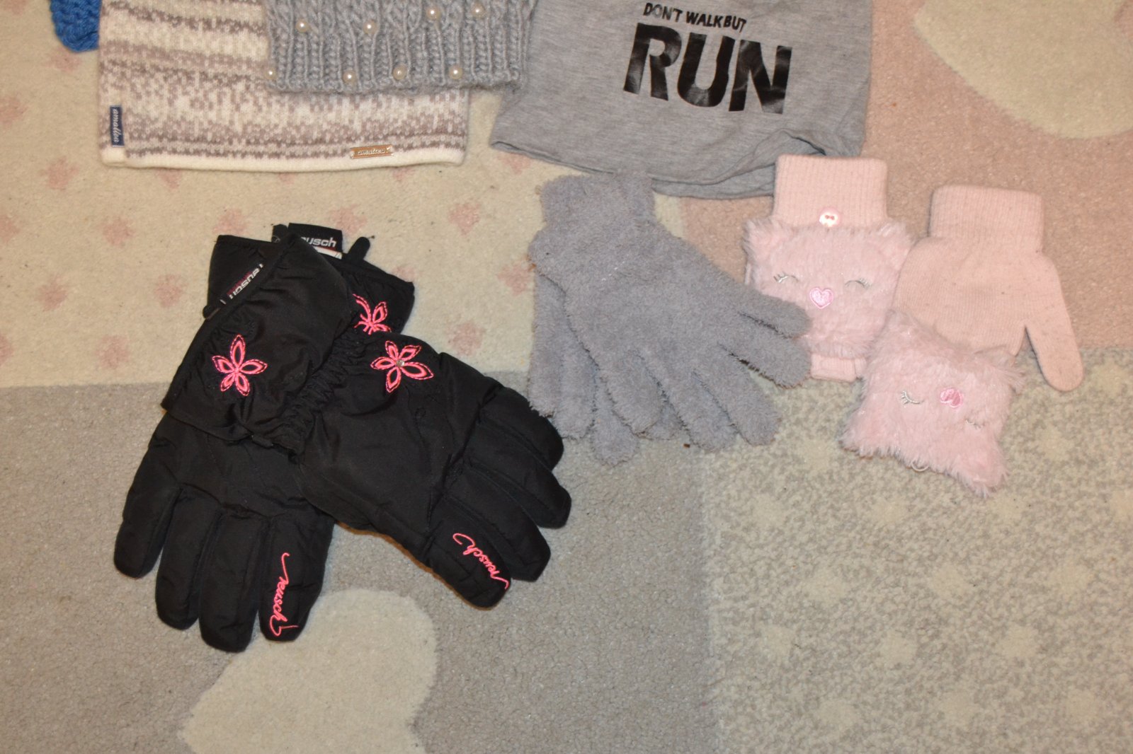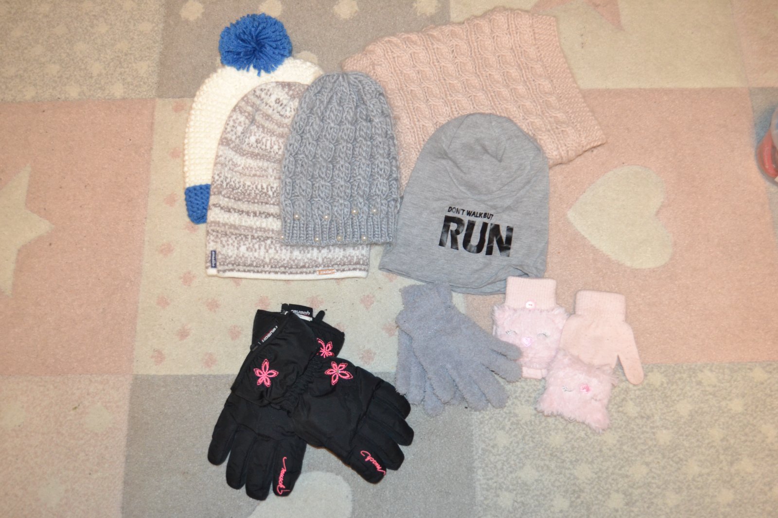 Čiapky 4ks, nákrčník hrubý 1ks, rukavice 2ks, lyžiarske rukavice 1ks. cena komplet 10€.
