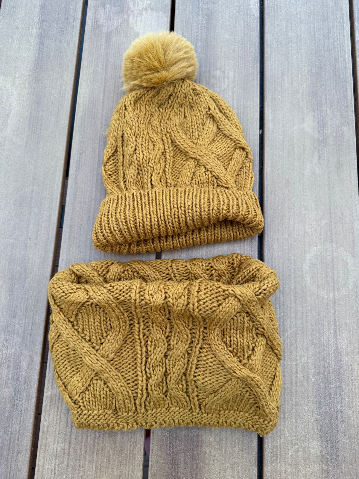 K tomu rovnaký tunelovy pleteny šál, nepodsity. Nosí sa ohrnuty na polovicu.