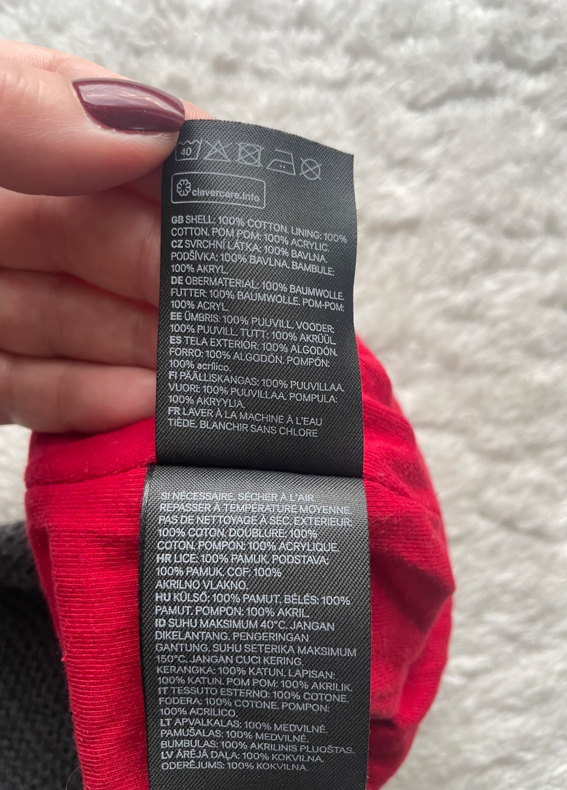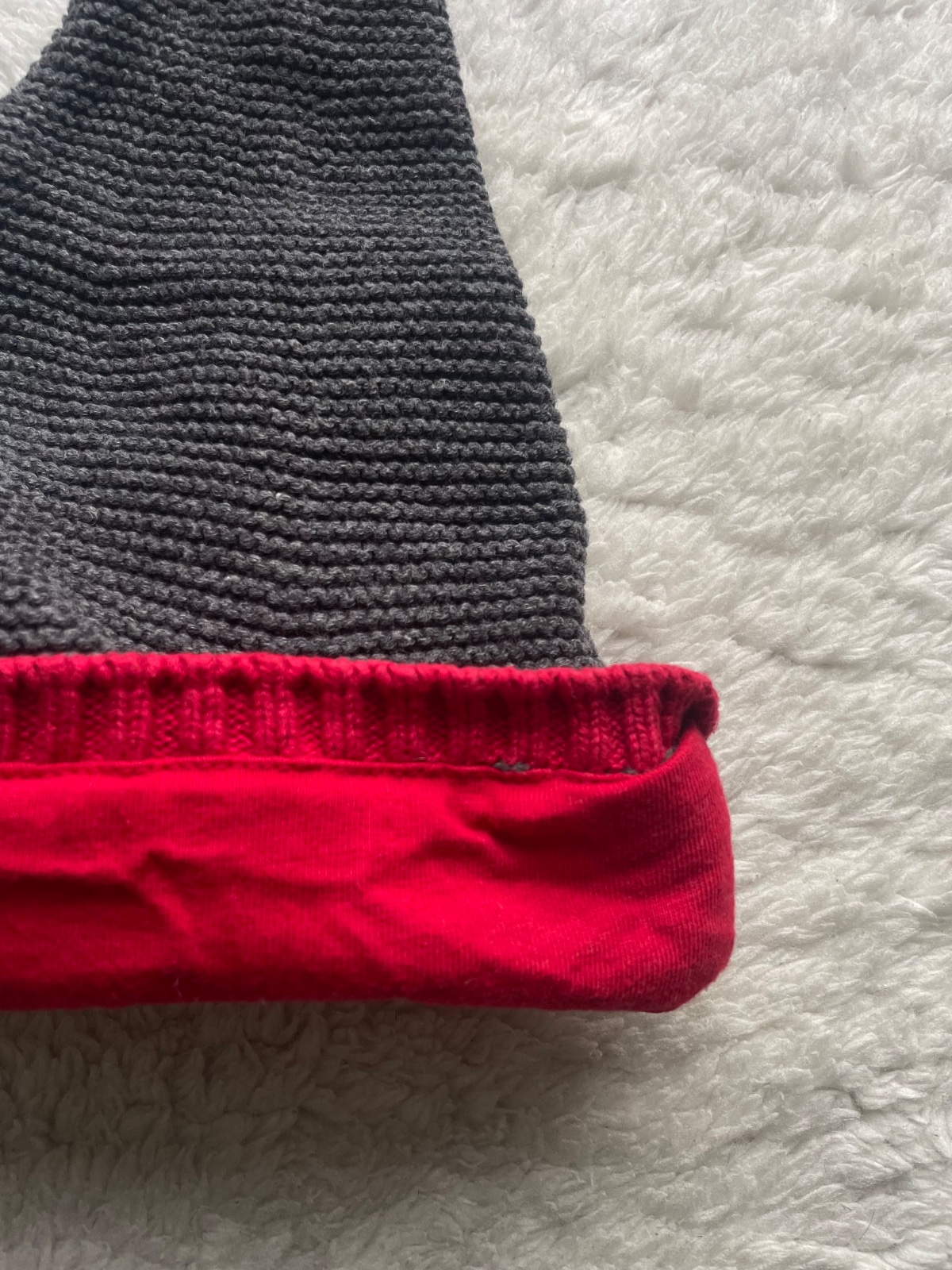 Tmavoseda pletena ciapka v kombinacii s cervenou, skriatkovsky tvar s brmbolcom, velkost 62/68 2-6m, neposkodena
