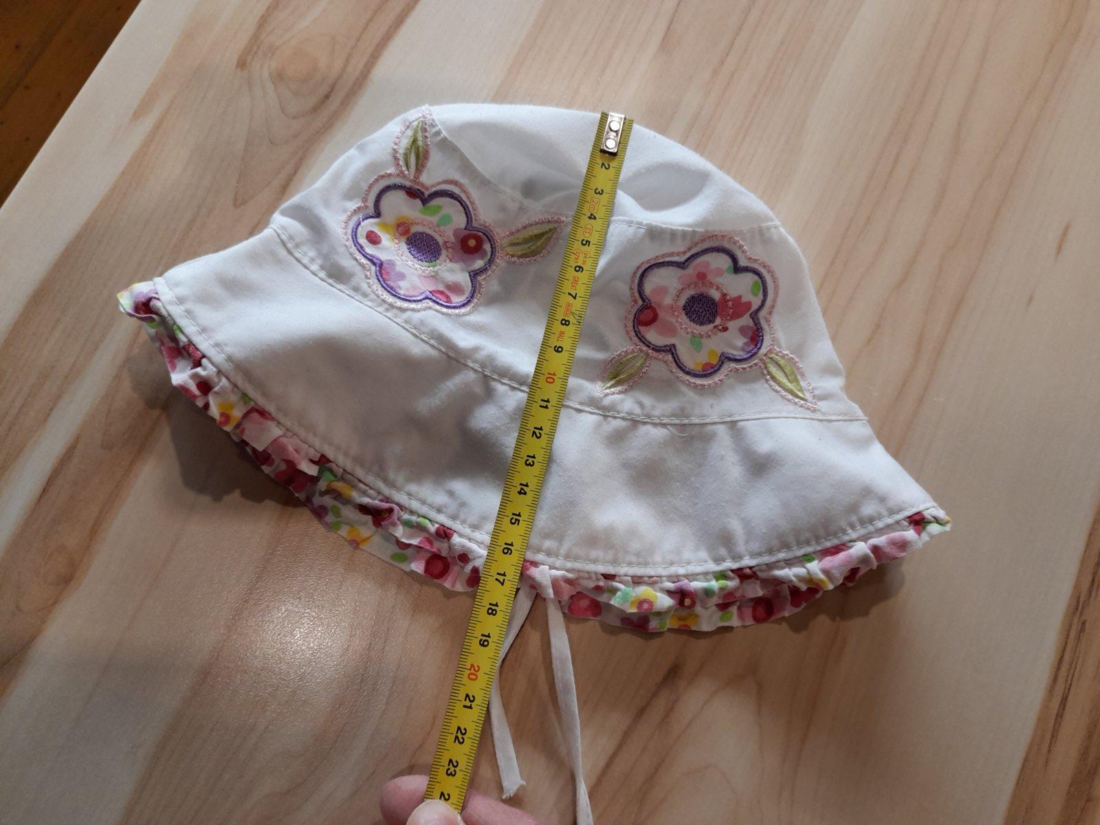 Biely klobúčik s bledomodrou aplikáciou po obvode - materiál 90% rastlinné vlákno, 10%pes. Vnútri po obvode páska, aby klobúčik pekne sedel na hlave. Nosený málo, vo výbornom stave, čistý. rozmery:...