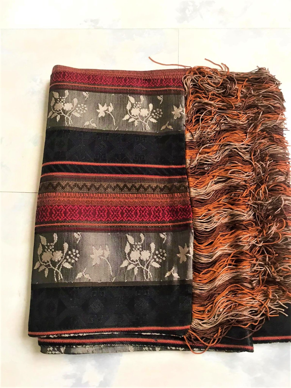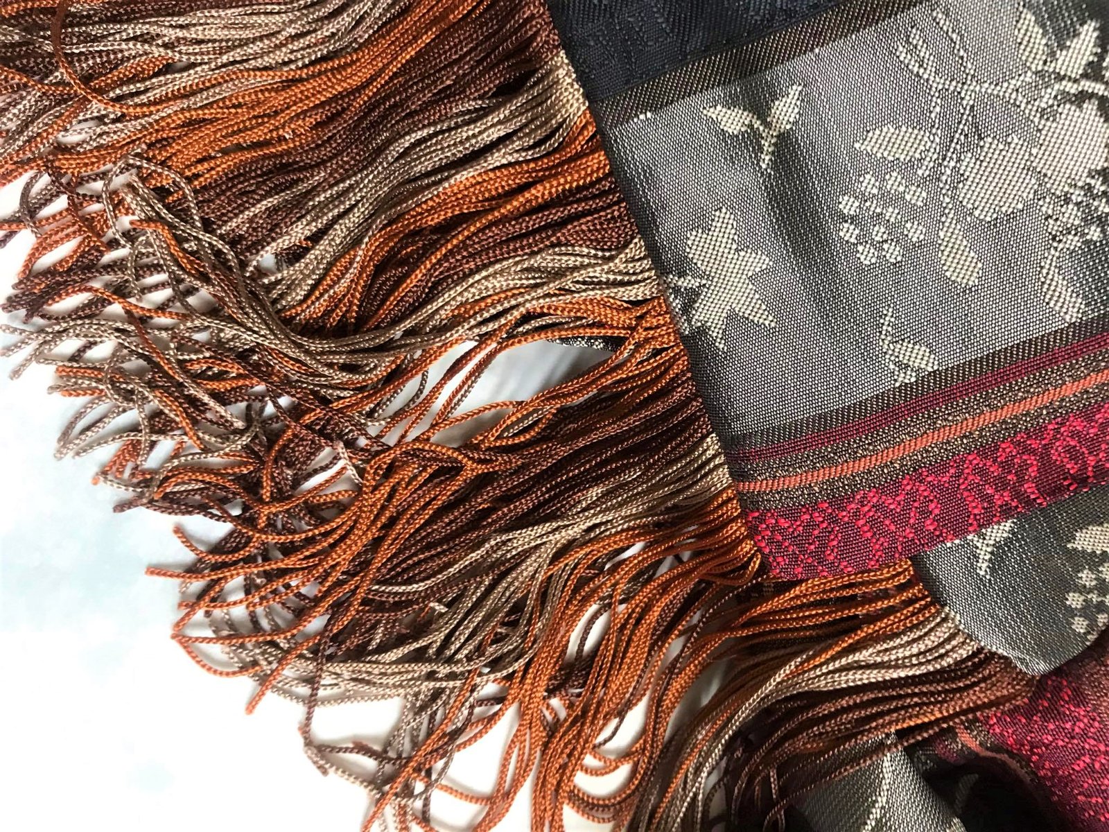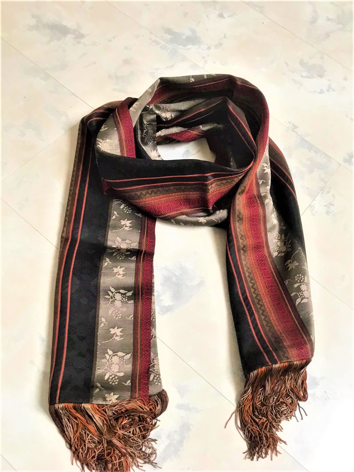 zaujímavá nevšedná šatka na krk so strapcami,dovezená z Talianska,zaujímavý doplnok,je duplovaná,24 x 160 cm,materiál je klzký šmýkľavý brokát,krásne oživí aj jednoduché spoločenské šaty,alebo kostým