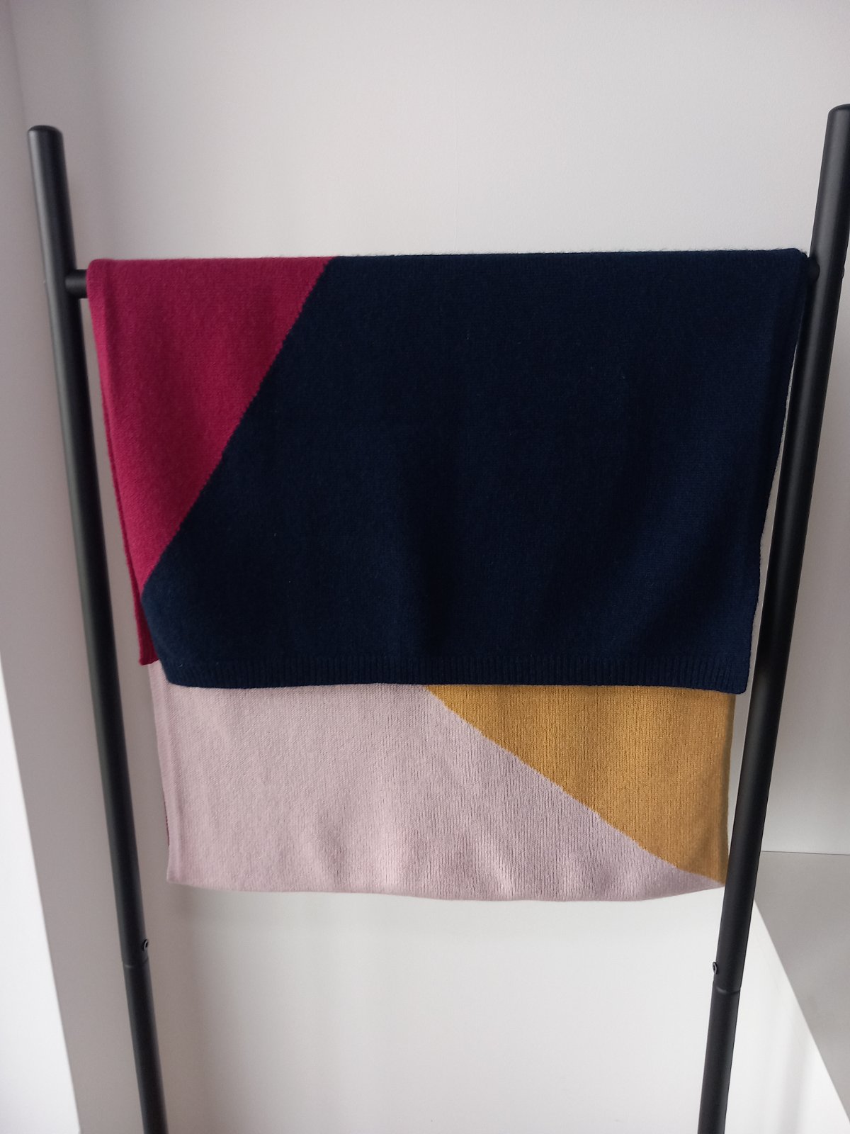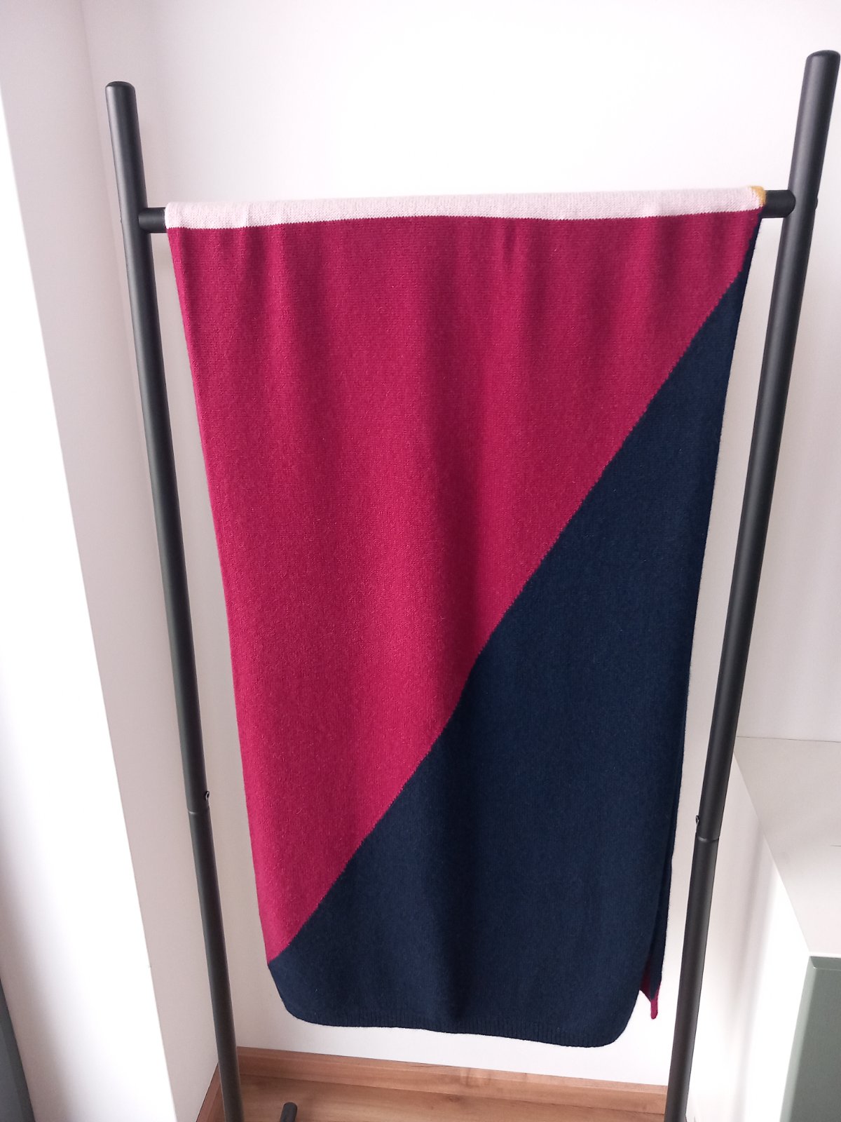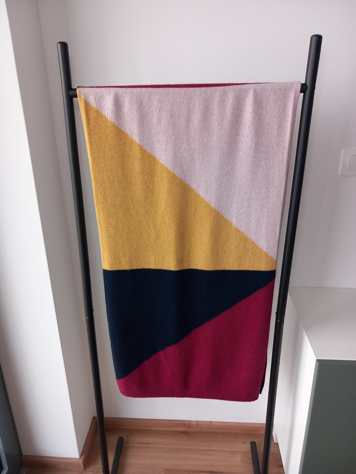 Šál je zaujímavej kombinácii farieb: tmavomodrá, magenta, žltá a púdrová. Vďaka svojim rozmerom najde uplatnenie ako šál, pled / prehoz ale i kardigán (prehodený cez plecia a uviazaný opaskom). Je vo vynikajúcom stave a hodí sa aj ako darček.