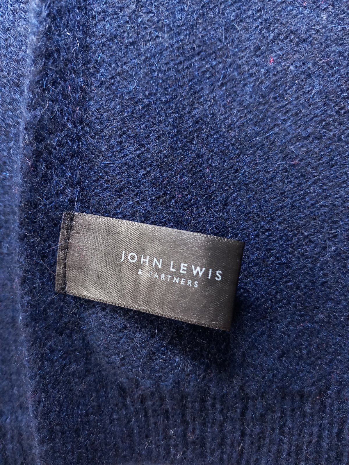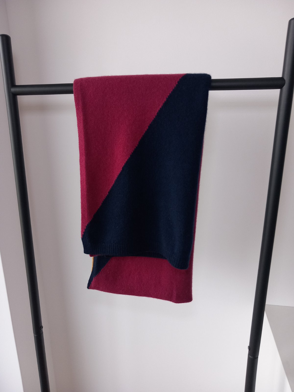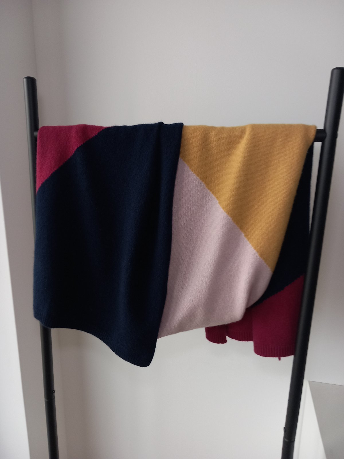 Šál je zaujímavej kombinácii farieb: tmavomodrá, magenta, žltá a púdrová. Vďaka svojim rozmerom najde uplatnenie ako šál, pled / prehoz ale i kardigán (prehodený cez plecia a uviazaný opaskom). Je vo vynikajúcom stave a hodí sa aj ako darček.