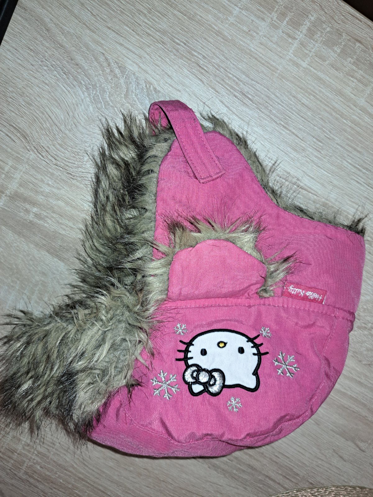 dvojvrstvova ciapka z pruznej jemnej pleteniny (55% akryl, 45% bavlna). Ciapka bola oblecena asi 1x a oprata. Kitty je sametova a vzadu je este vysity decentny 1 cm napis Hello Kitty, dlhy cca 10,5...