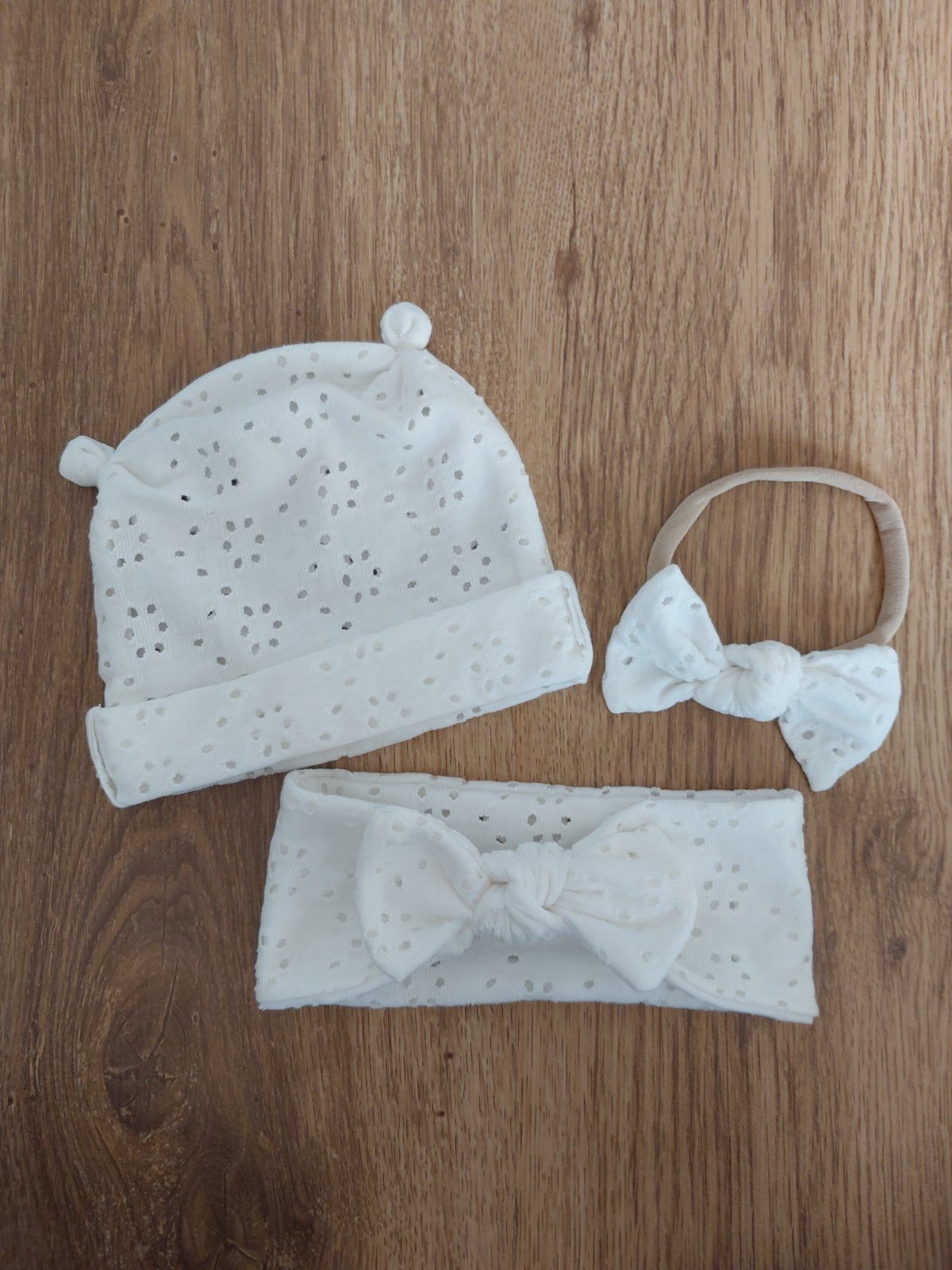 Set z madeiroveho upletu obsahuje mackovu ciapku, celenku s maslickou a gumickovu celenku s maslickou, fotene na babike s obvodom hlavky cca 34cm, este su jej volne kusok, velkostne odhadujem cca od 3 mesiacov do pol roka, mozno aj viac, elasticky prijemny material vhodny pre babatko, krasne aj ako darcek, 8 eur plus posta alebo osobny odber Trencin.