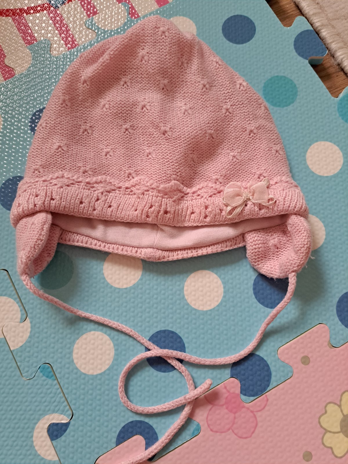 Čiapka na štýl šatky, vyzerá veľmi pekne, jemná biela potlač lístkov, na obvod hlavičky 43-45 cm, je pružná na patente cez uška, inak je zo 100% bavlny.
