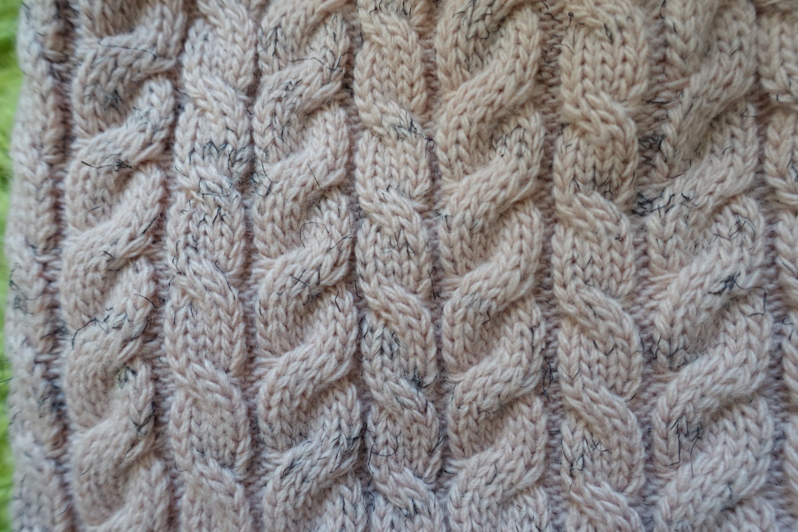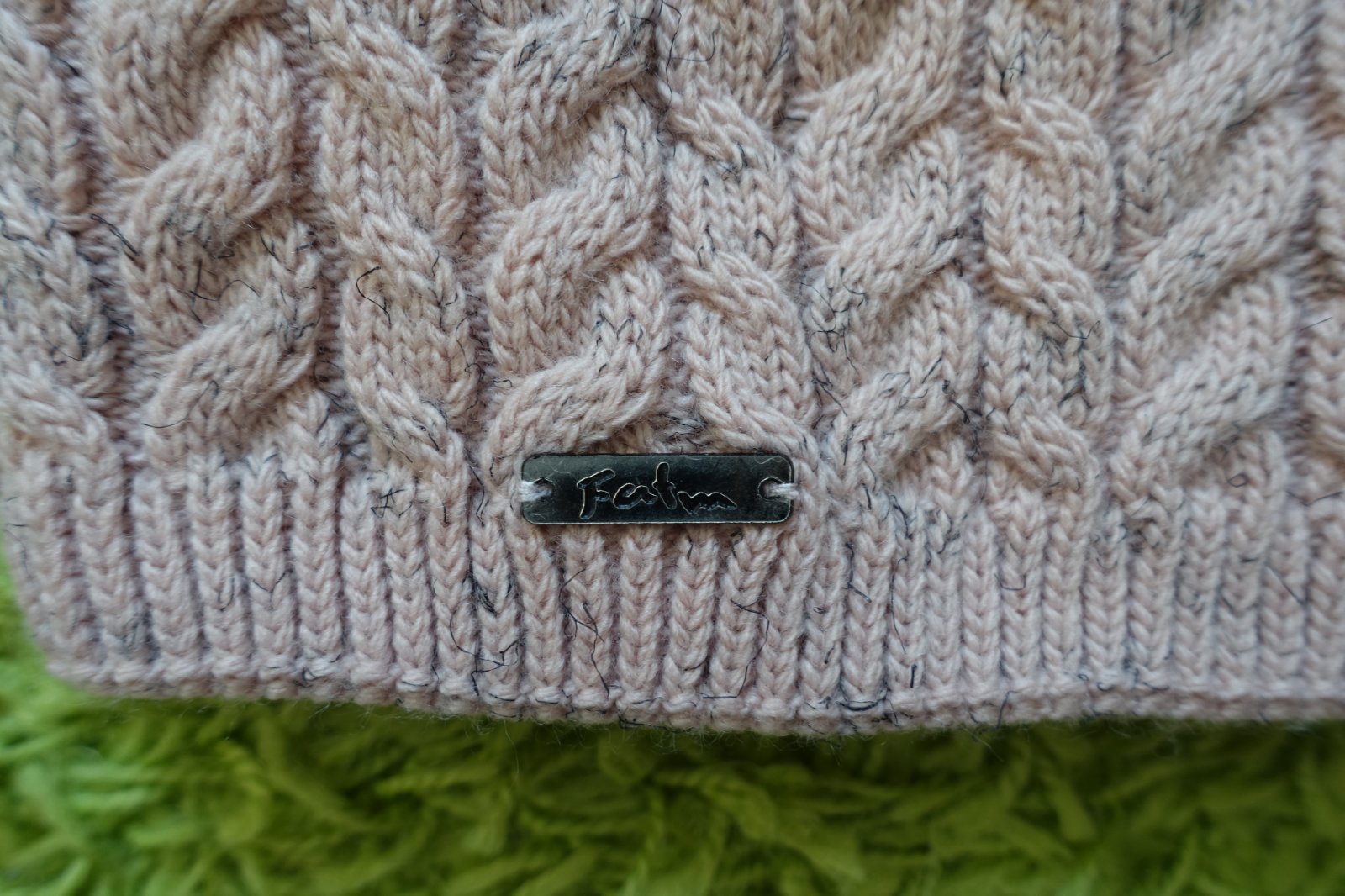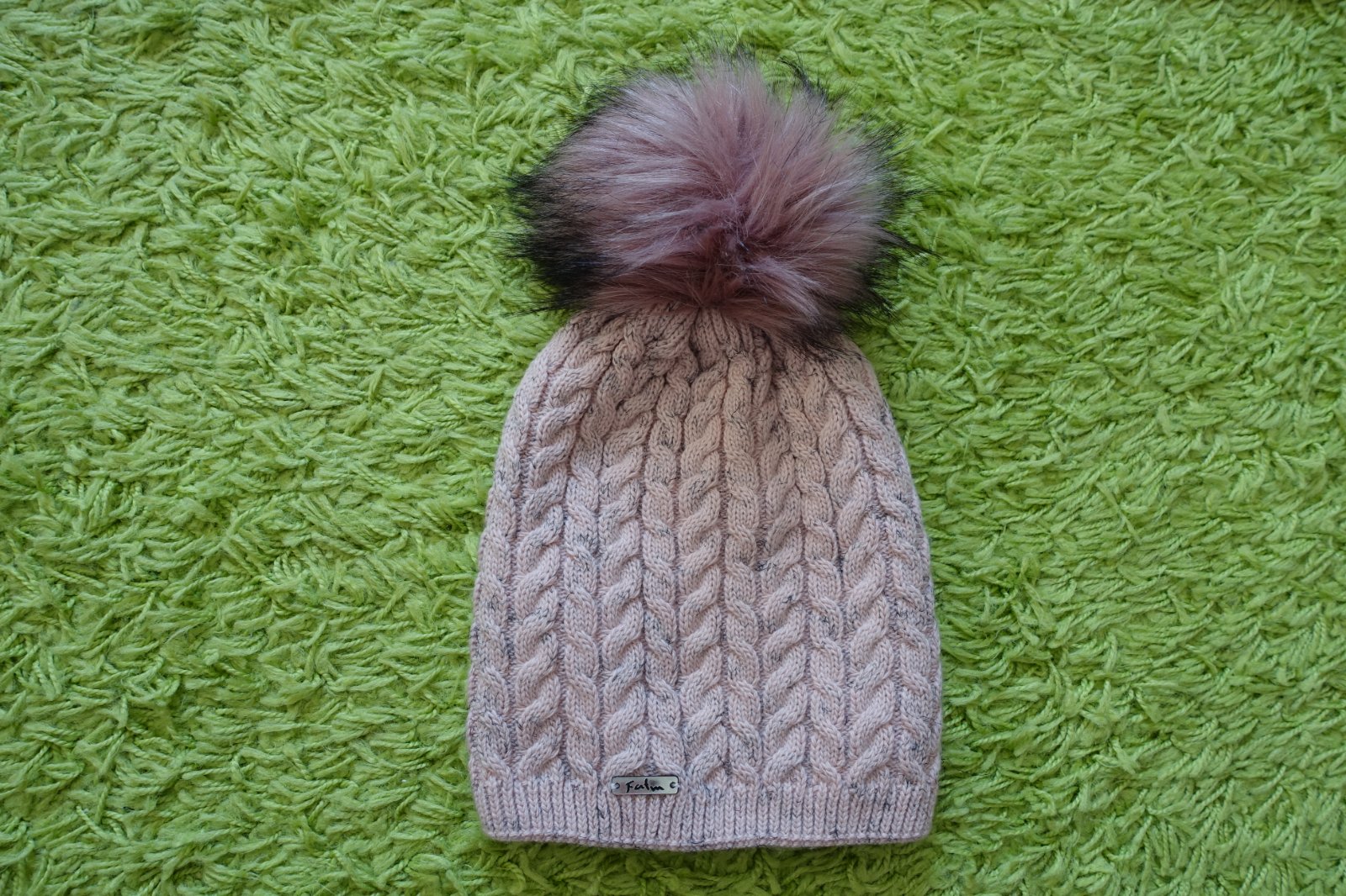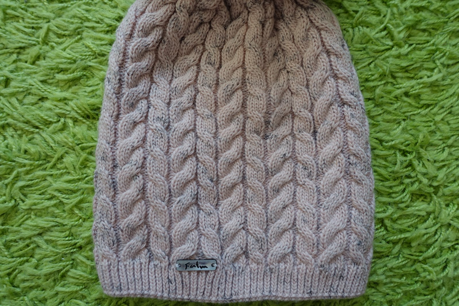 Predám krásnu pletenú čiapočku s veľmi pekným vzorom a bohatým brmbolcom. Farba je taká pastelovo staroružová s fŕkanou čiernou farbou. Je vhodná na zimšie prechodné a aj zimné obdobie. Z vnútra je čiapočka podšitá a zateplená - čiže je dvojvrstvová. Dĺžka čiapočky je 24 cm (meraná bez brmbolca) a šírka čiapočky v kľude je 19 cm, natiahne sa aj na 30 cm. (G)