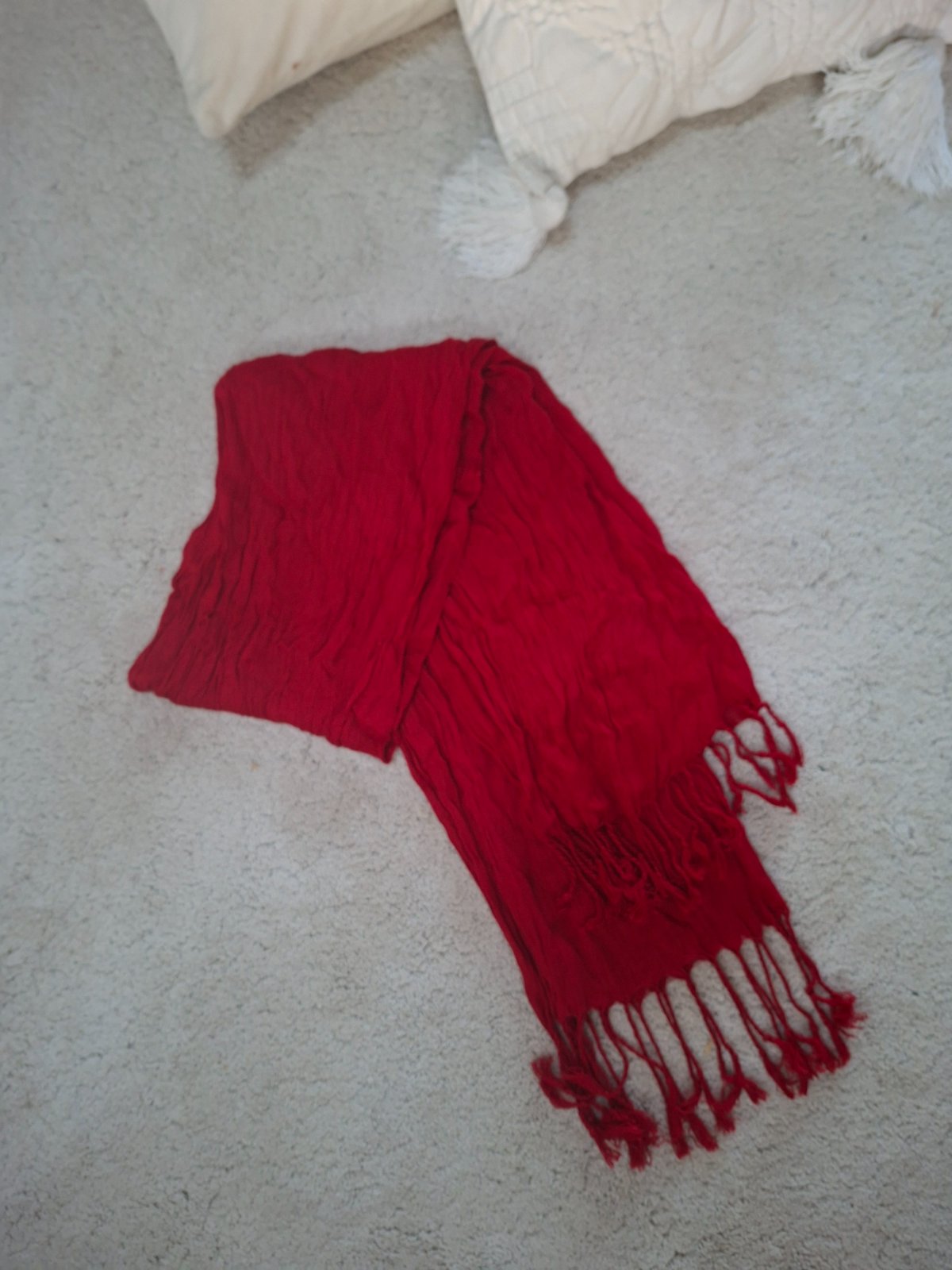 2x nosený šál, povedala by som že je mierne elastický, tá látka je veľmi príjemná jemnučká, šál je odtieňom červenej troška tmavší ako na foto, poprešívaný a zdobený čiernym mäkkým tylom/sieťovinou...