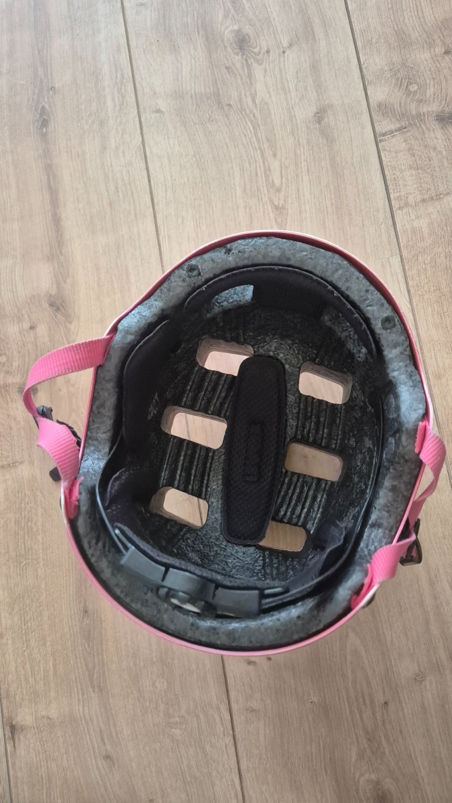 Perfektná prilba nepoškodená. Ešte veľa poslúži. Vzadu po vsadení baterky aj blikacie svetielko. Od 2-4 rokov
