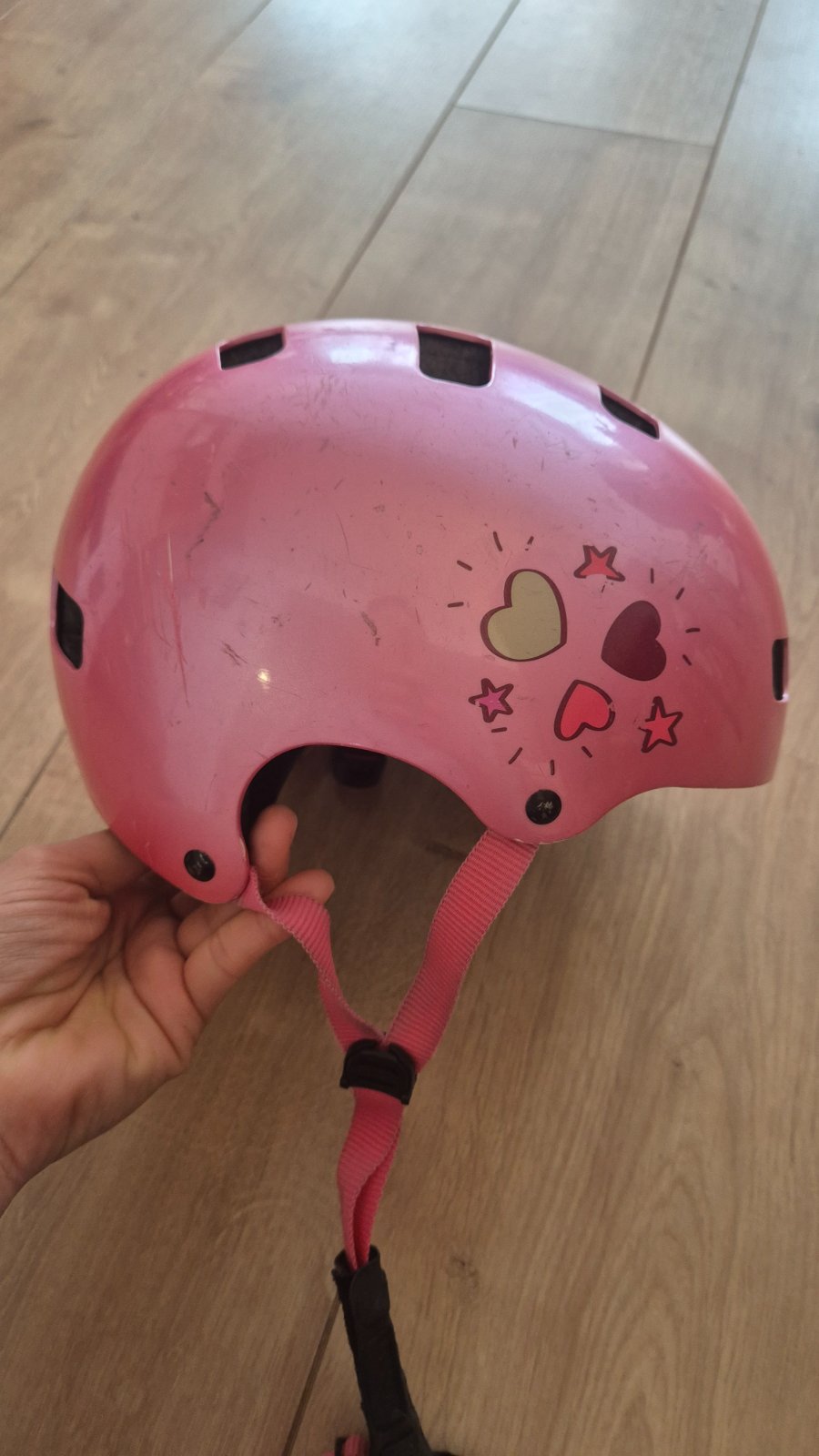 Detska prilba vo velkosti 52-56cm,vzadu sa da utiahnut potocenim kolieska.ma par skrabancov,ale urcite este posluzi