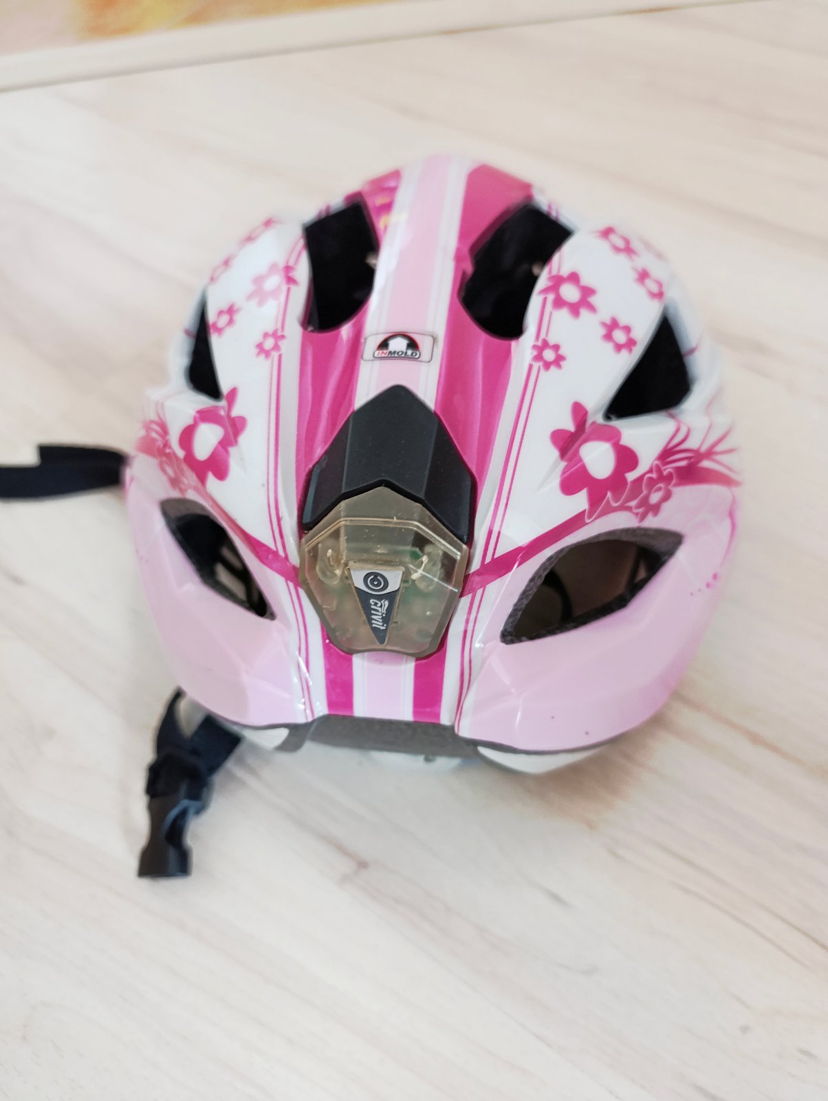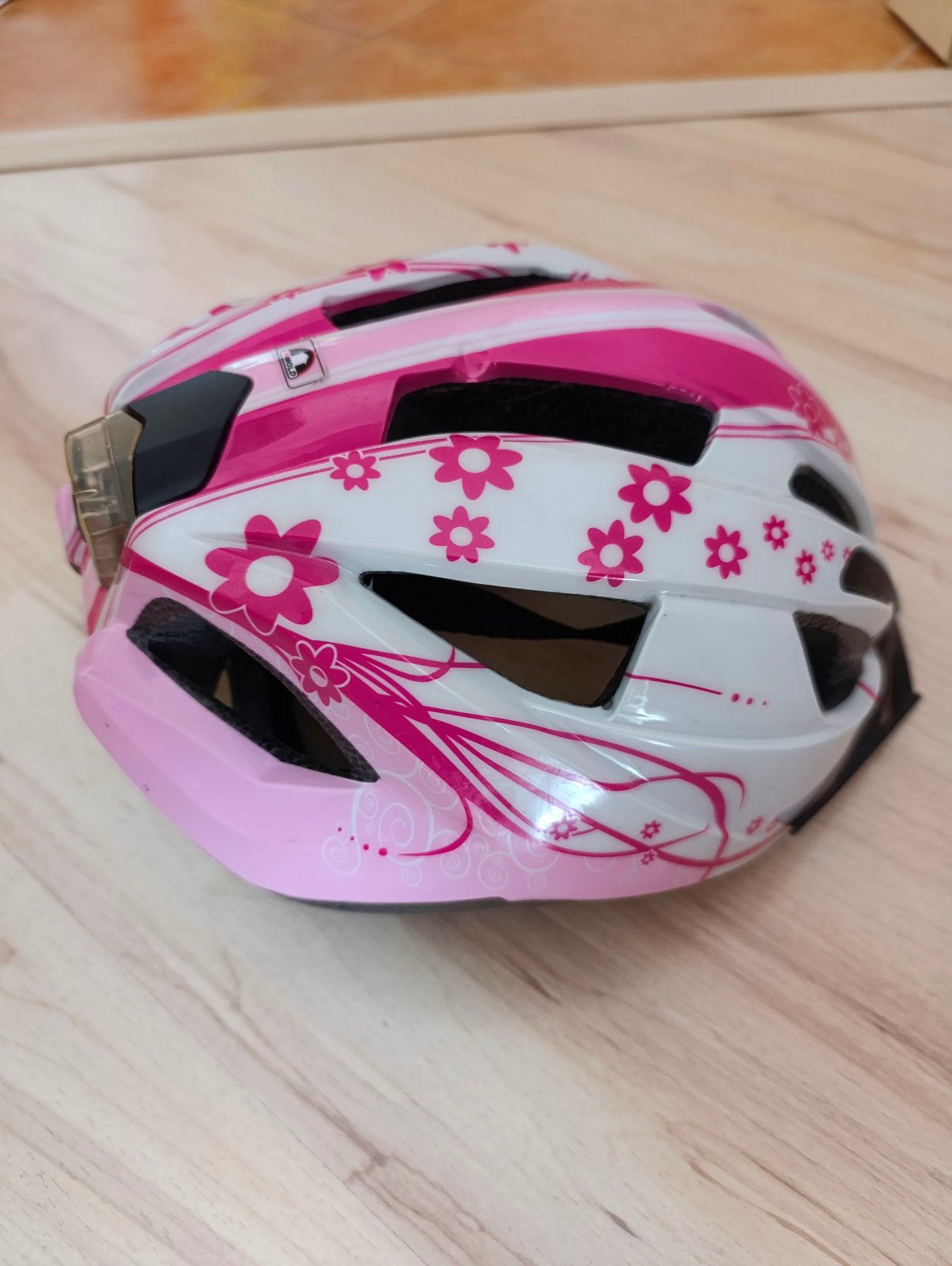 Dievčenská cyklistická prilba veľ. 49 - 54 cm. V zadnej časti je zabudované svetlo. Bez poškodení.