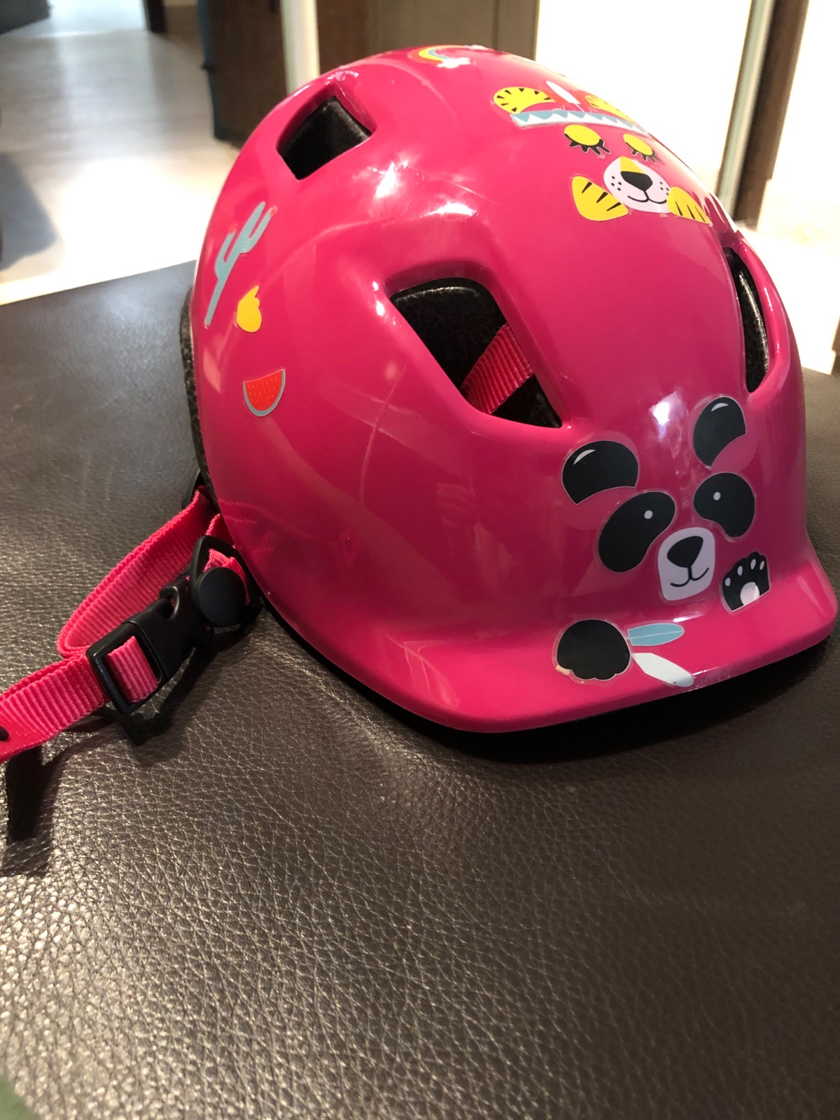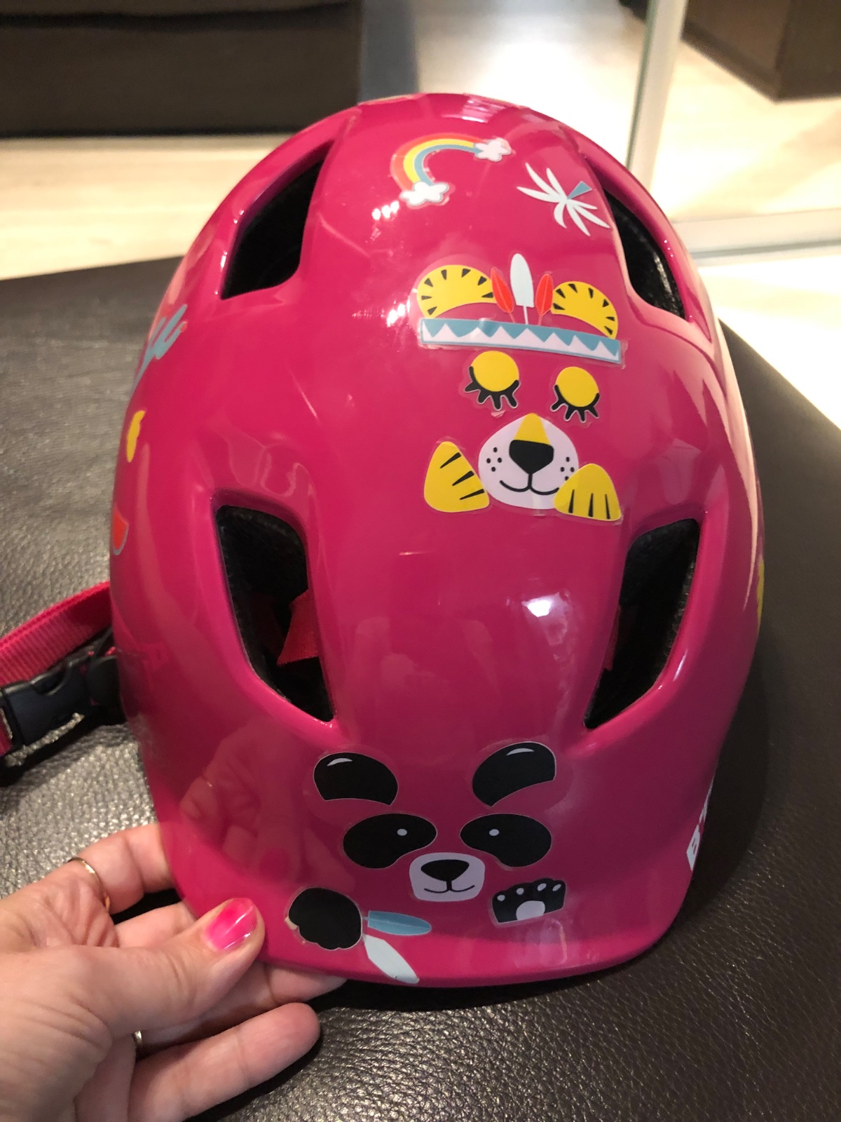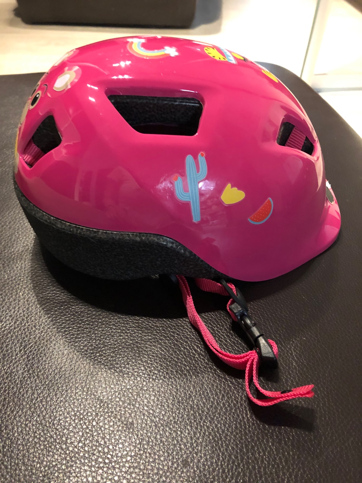 Praktická detská prilba pre dievčatká. Je sýto ružová, dcérka chcela na ňu nálepky, tak je oblepená zvieratkami. Je na vek 7-9 rokov.