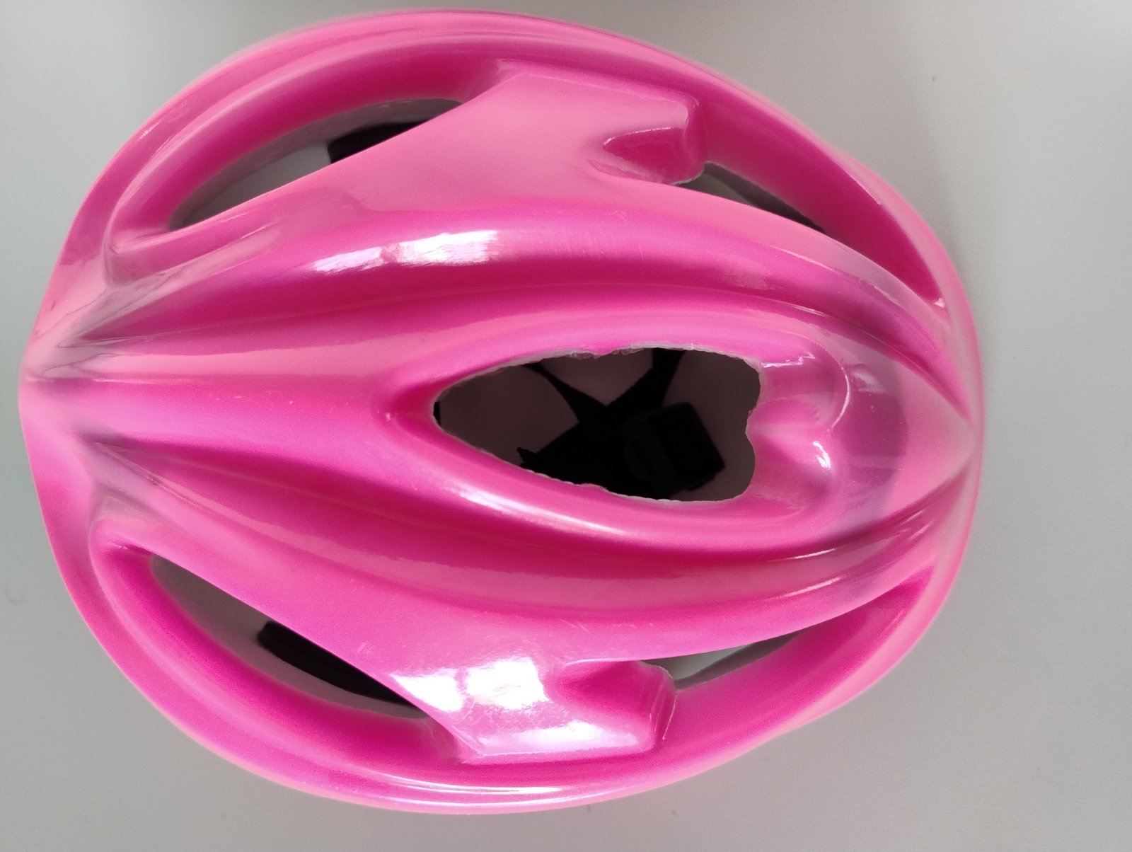 Používaná prilba značky BTWIN, veľkosť M (rozmer 52-56cm). Vpredu na pravej vnútornej strane drobný zárez čiernej polystyrénovej časti (je to vidieť na fotke), ale inak nemá poškodenia.