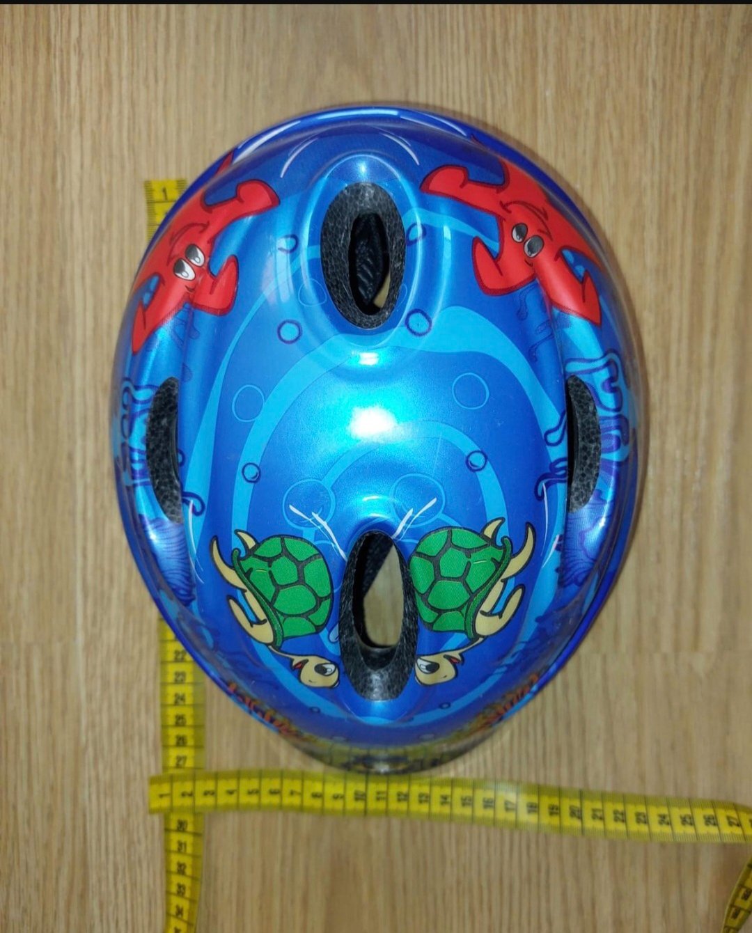 Cyklistická prilba s veselými morskými motívmi cca do 4-5 rokov. Bežné známky používania, pár škrabancov, nič hrozné, ako na foto.