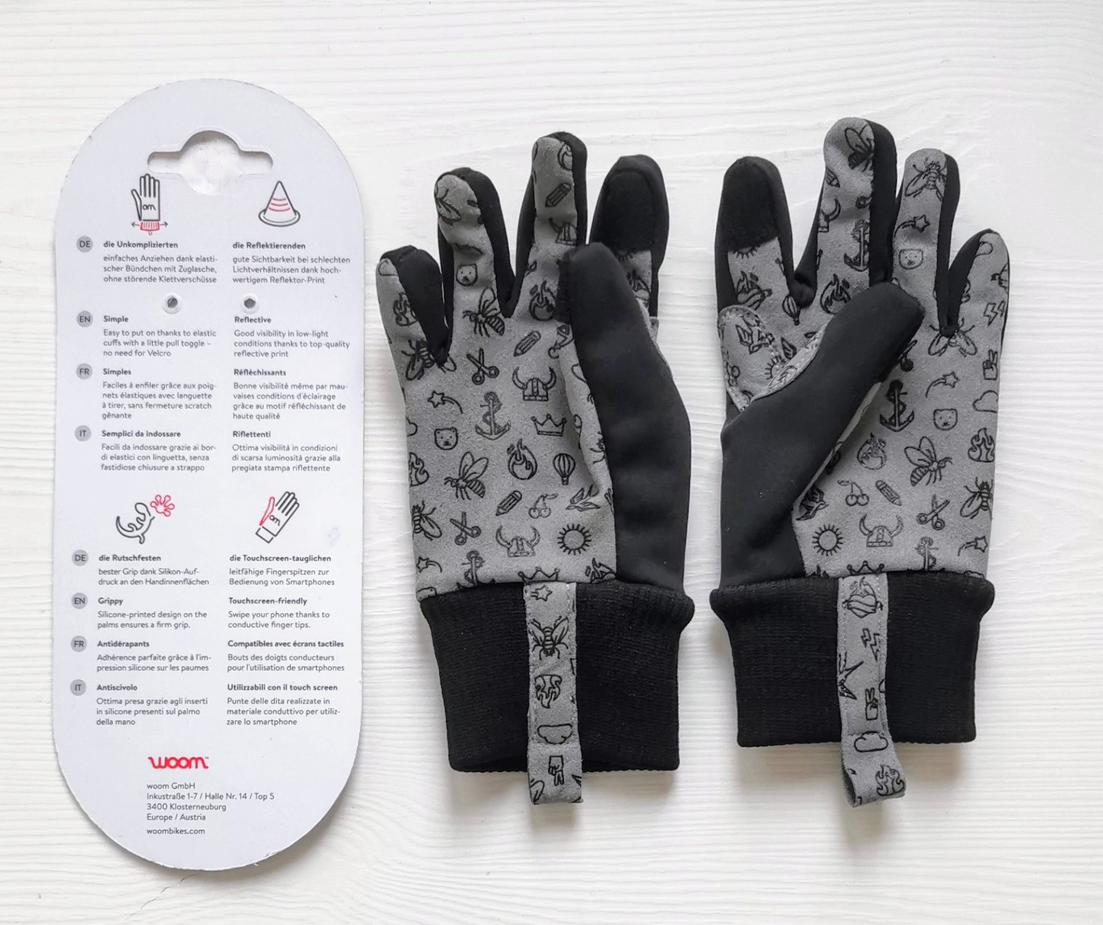 Sú vyrobené z priedušného materiálu, softshell . Majú reflexné potlače. detská potlač na dlaniach je silikónová protišmyková. Manžeta zaistí jednoduchšie nasadzovanie rukavíc.