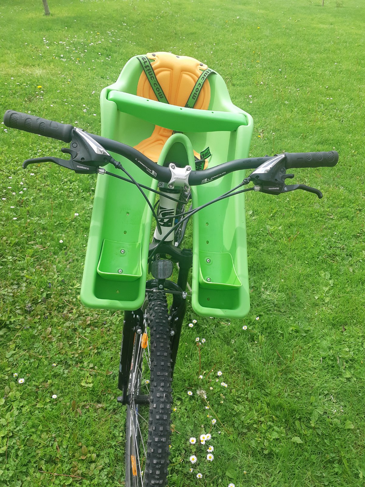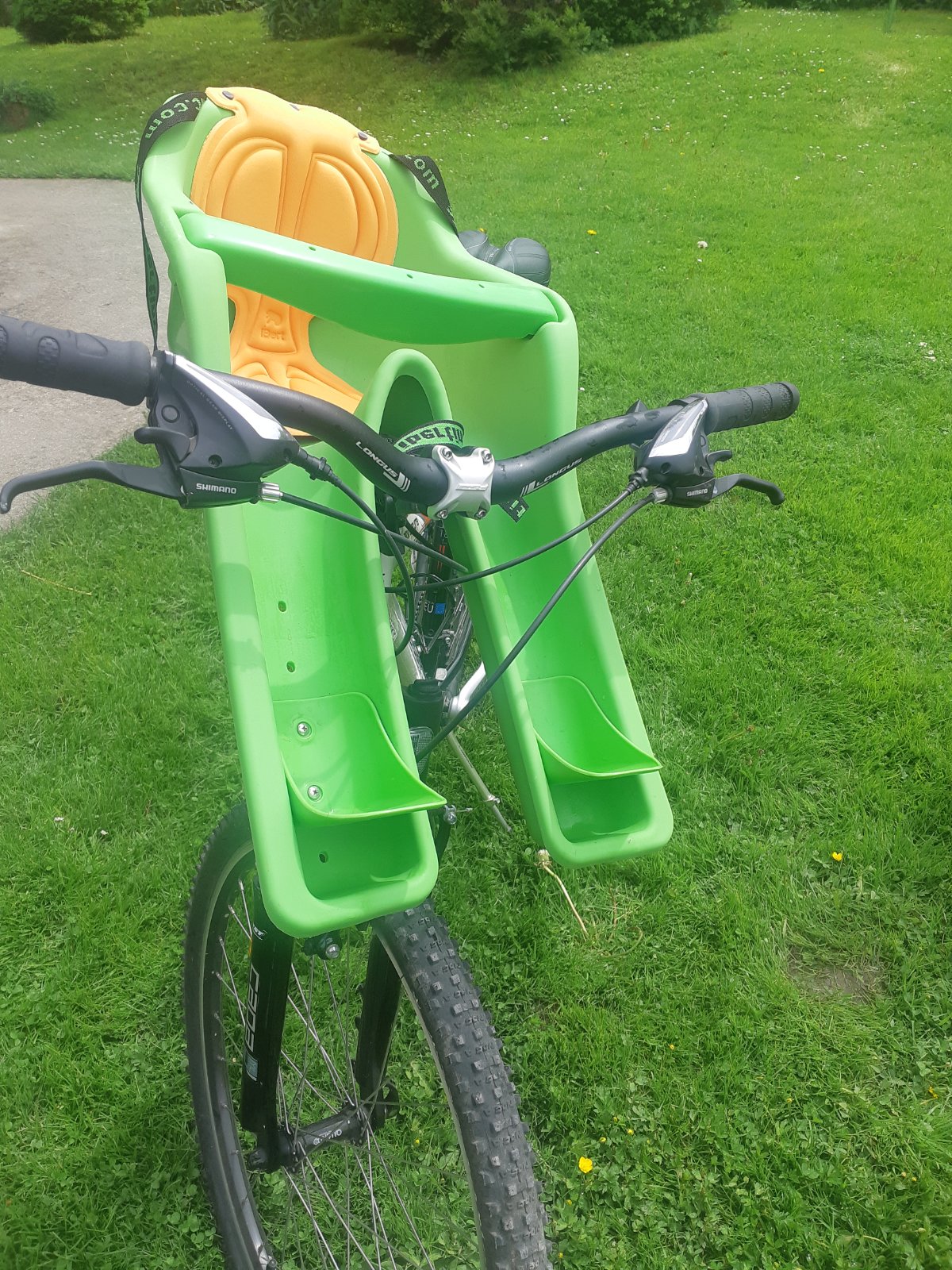 Predná sedačka pre najmenšie detičky až do 17,5kg. Všetky časti funkčné, výborný stav, jazdená máličko, využívaná hlavne do obchdu, na detské ihrisko a pod. ako alternatíva kočíka na rýchly presun :-) Dcérka v nej bola spokojná, ja tak isto, manipuluje sa s ňou oveľa ľahšie ako so zadnou. Sedačka je pripevnená na riadidlá, nie na rúru bicykla, čiže vám vôbec neprekáža a pre dieťatko je bezpečná.