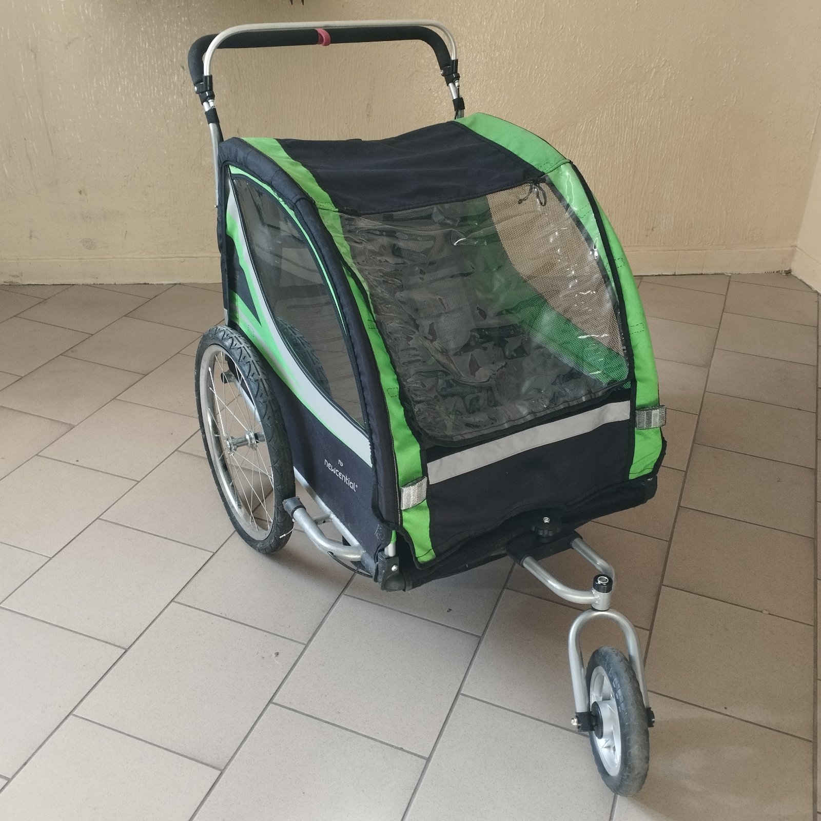 Cyklovozik pre dve deti, vzadu odkladací priestor, sieťka proti hmyzu, dorobené bočné a predné tienenie na suchý zips, viď foto, dá sa prerobiť na kočík s predným kolesom, v používanom stave, len osobný odber Trnava, prípadne Bratislava