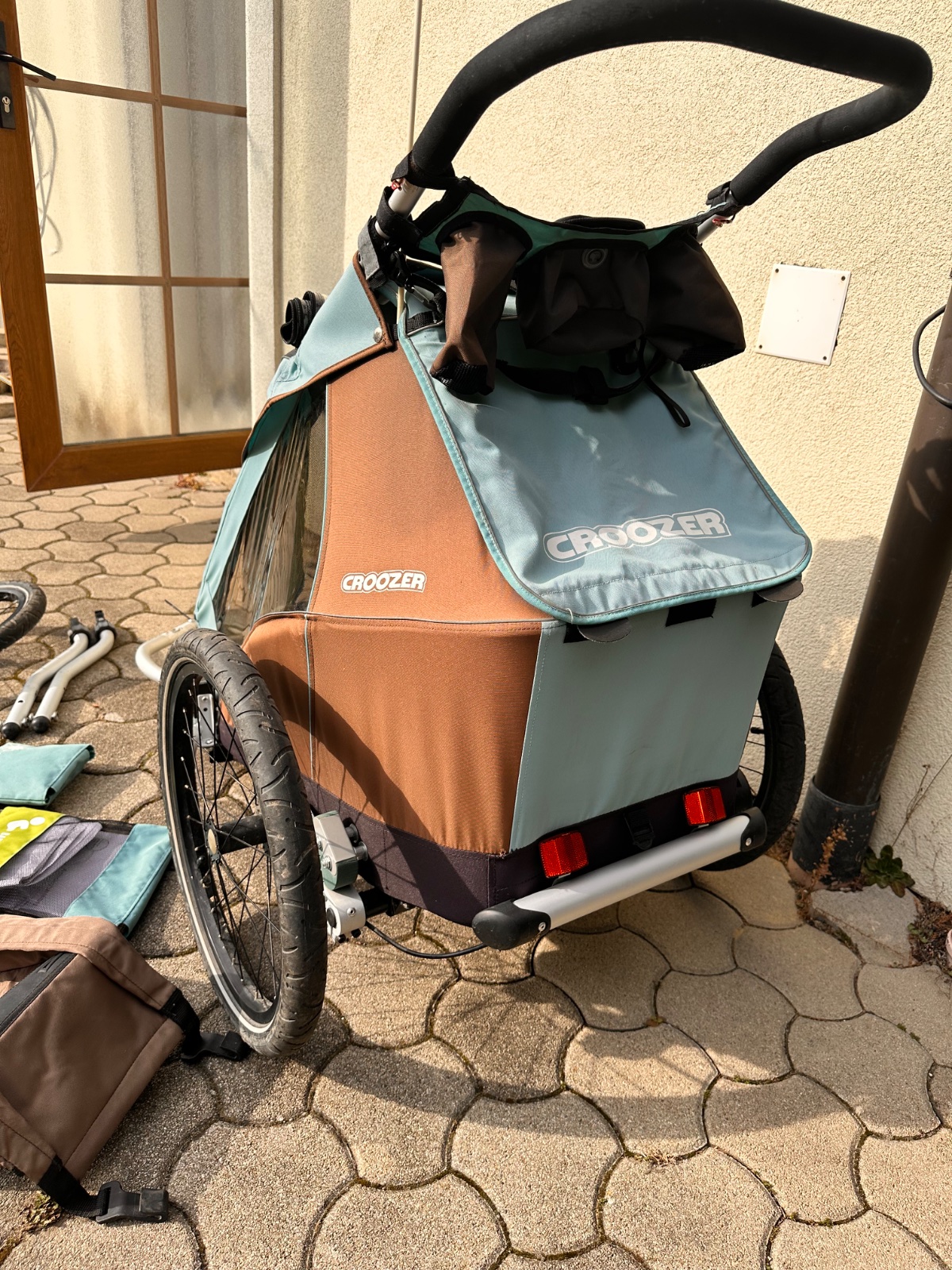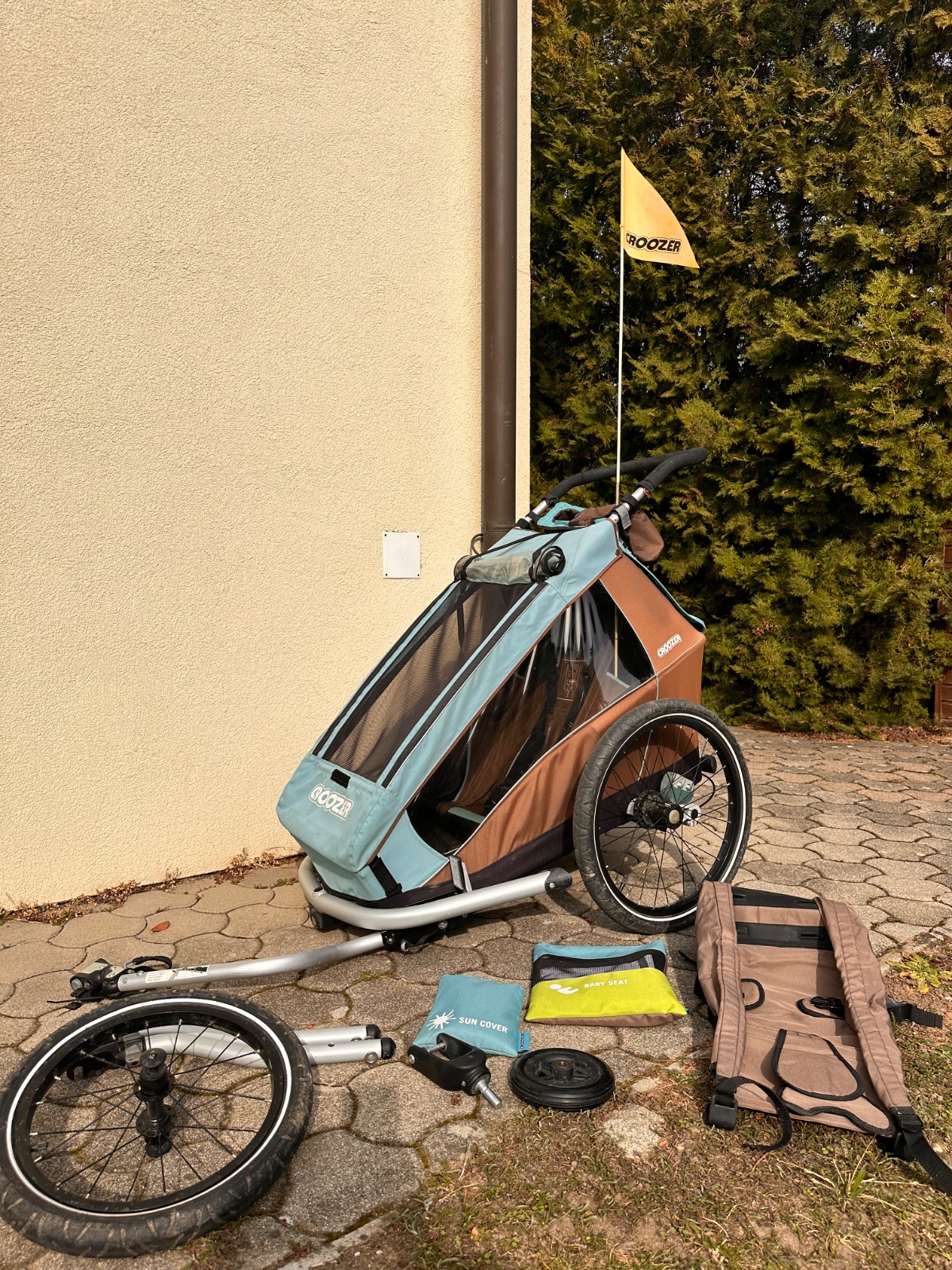 kvalitny cyklovozik zn. Croozer pre 1 dieta, s odpruzenim, vhodny od 1-6 rokov, sme druhi majitelia, vratane vlozky pre male dieta, funguje ako cyklovozik alebo s tym malym prednym kolesom, ked to chcete pouzivat s tym velkym kolesom vpredu, tak toto momentalne nefunguje, bude tam treba opravit pruzinky.