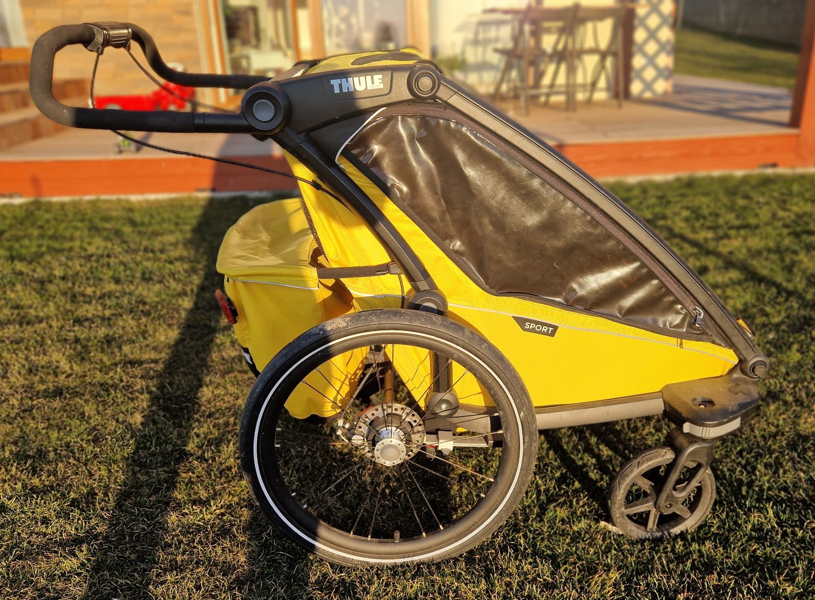 Predam cyklovozik Thule Chariot Sport 2 pre dve deti vratane prislusenstva (os na pripojenie k bicyklu, uchyt na bicykel o zadne koleso, zamok, tieniaca plachta na vozik, izolacna termo folia na celnu plachtu, vlajky)