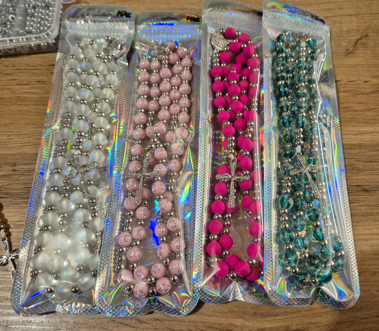 Ponúkam vám krásne ružence rôznych farieb,farba ruženca môže byť aj na želanie zákazníka a tiež tam môžem na želanie doplniť napríklad meno dieťatka,dátum narodenia,krstu ,alebo môže byť aj meno aj dátum pridávam fotku na predstavu ako by to vypadalo ružence sa pohybujú od 10 do 13€