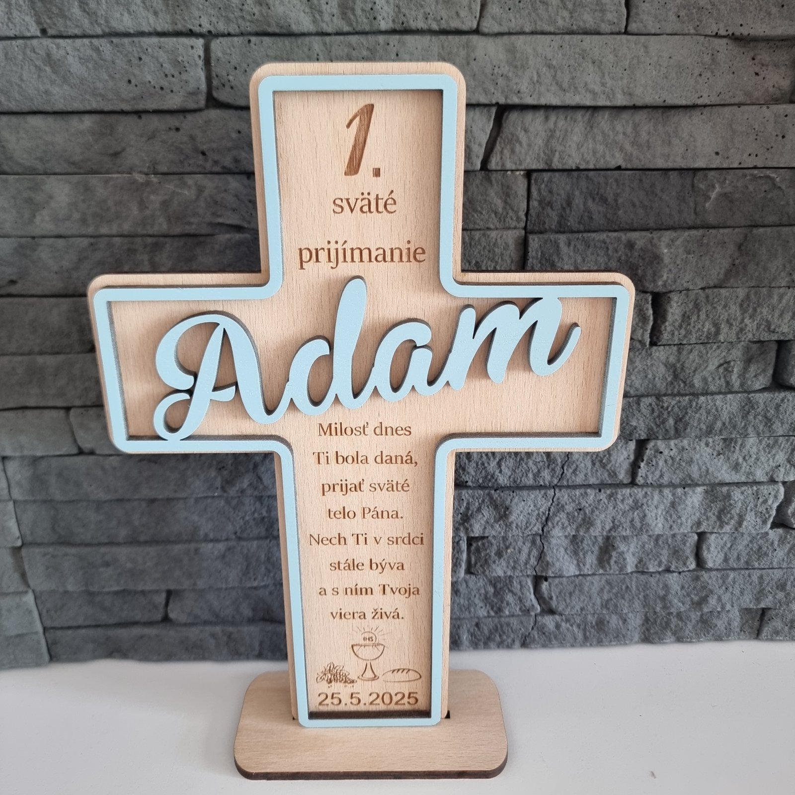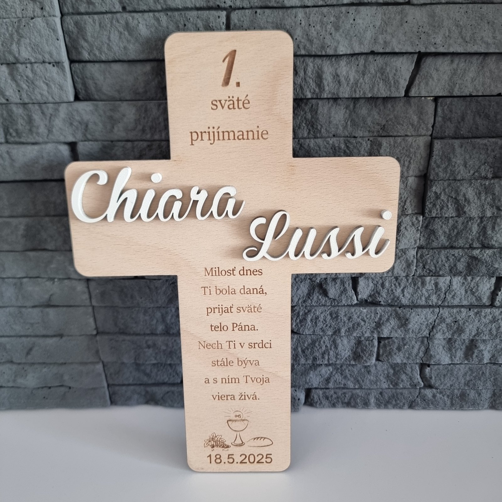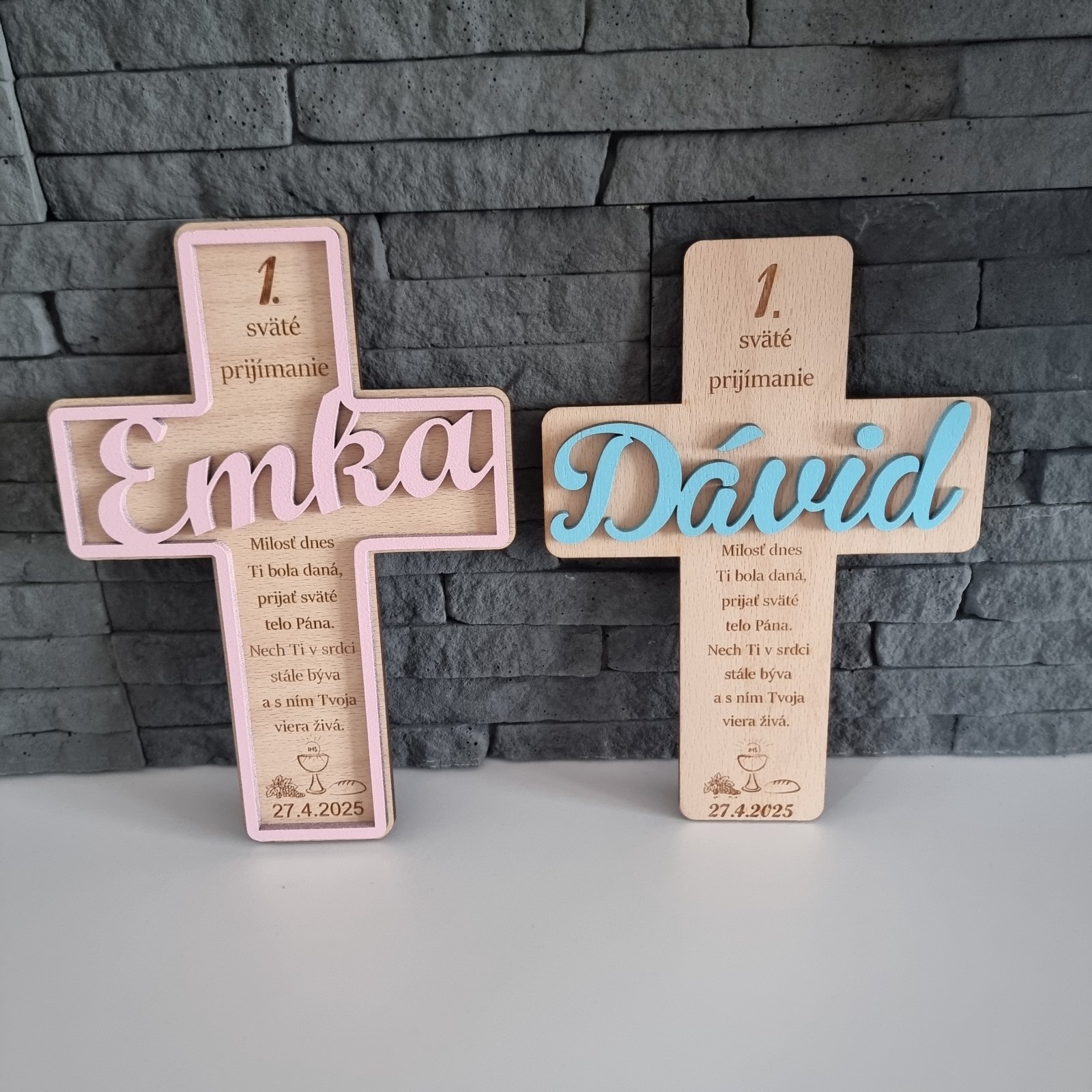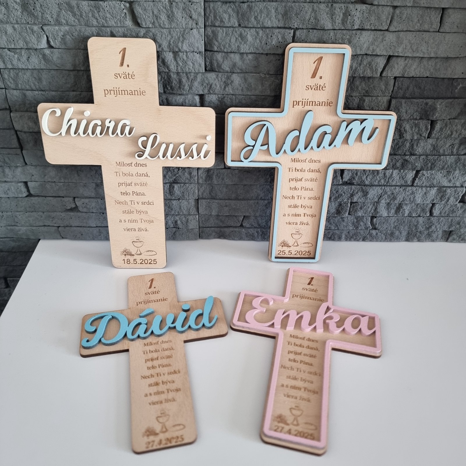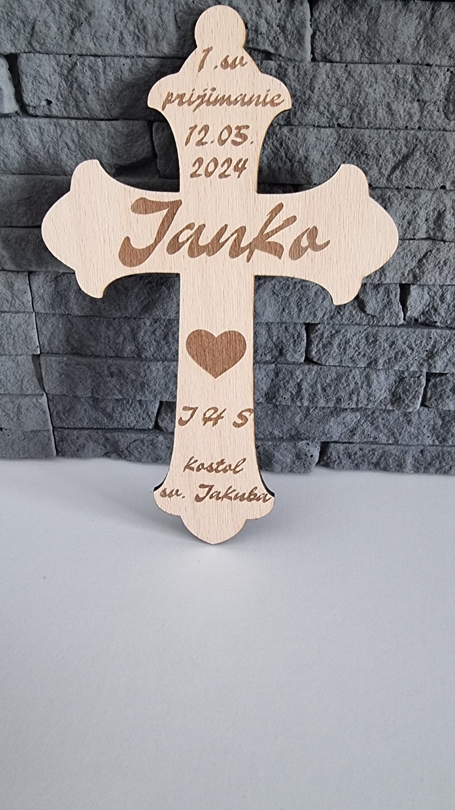 Výška krížika je 23cm, dá sa upraviť. Text aj farba podľa želania. Cena krížika záleží od druhu, 10-15€. Stojanček je za príplatok 2€. Pre viac info poprosím správu