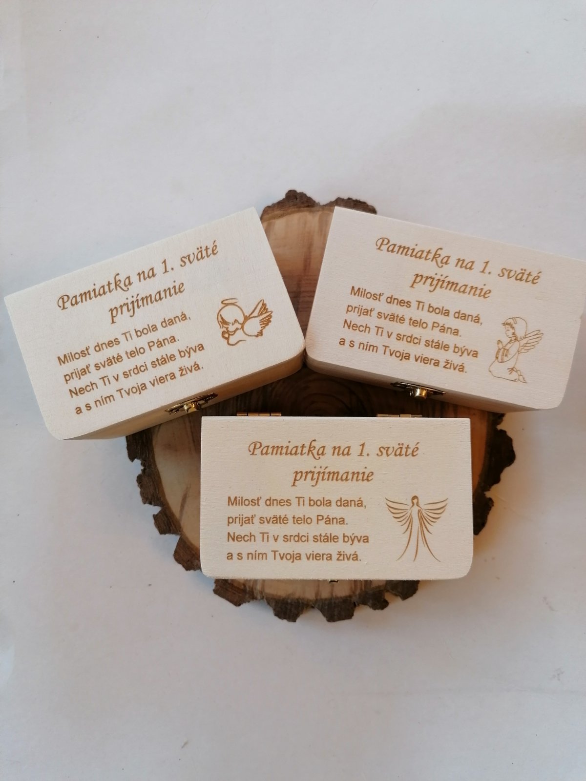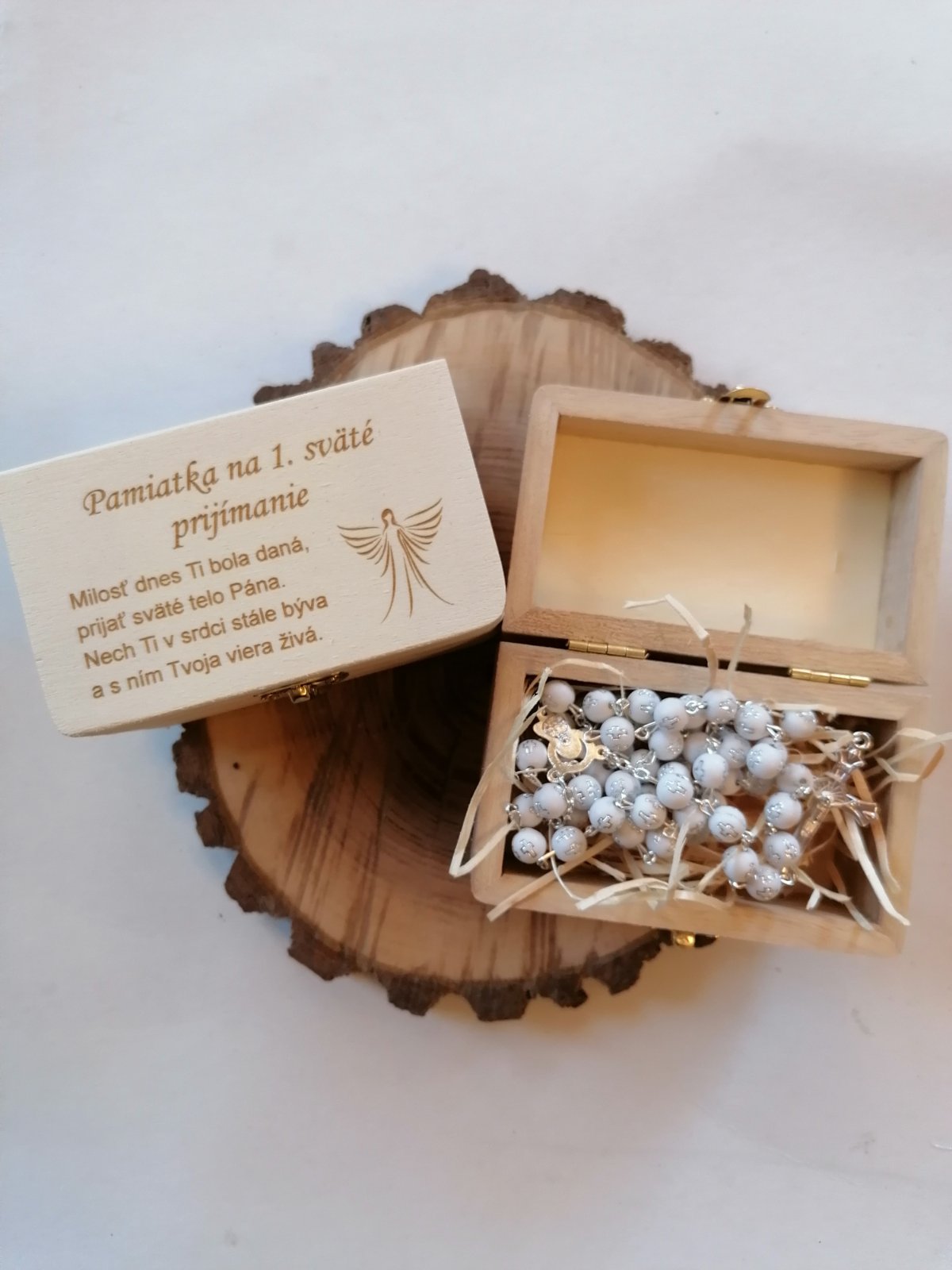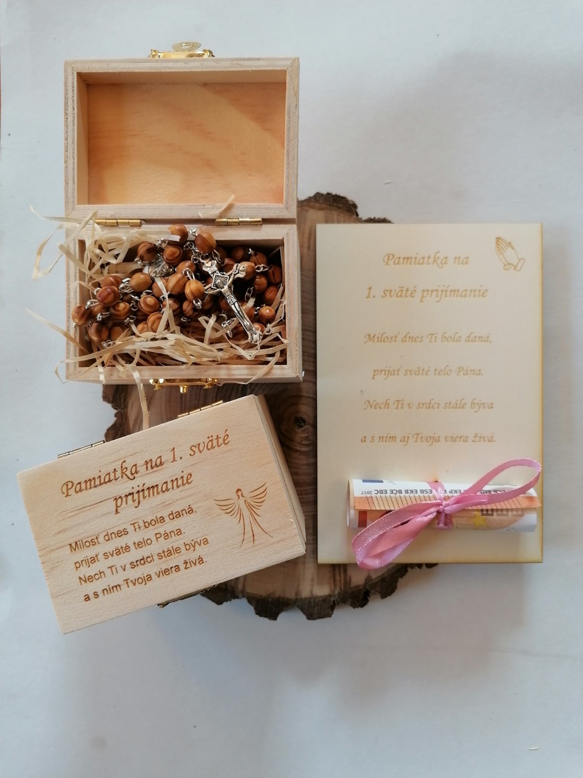 Drevena gravírovana krabicka bez ruženca 7,90 e a s ruzencom 9,90e a tabuľka na peniaze 5e