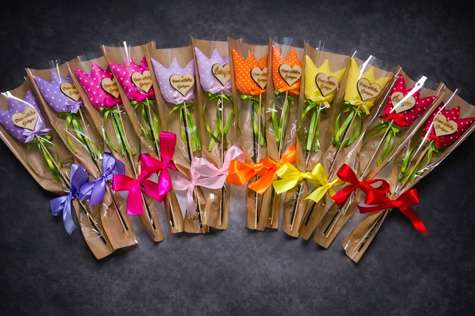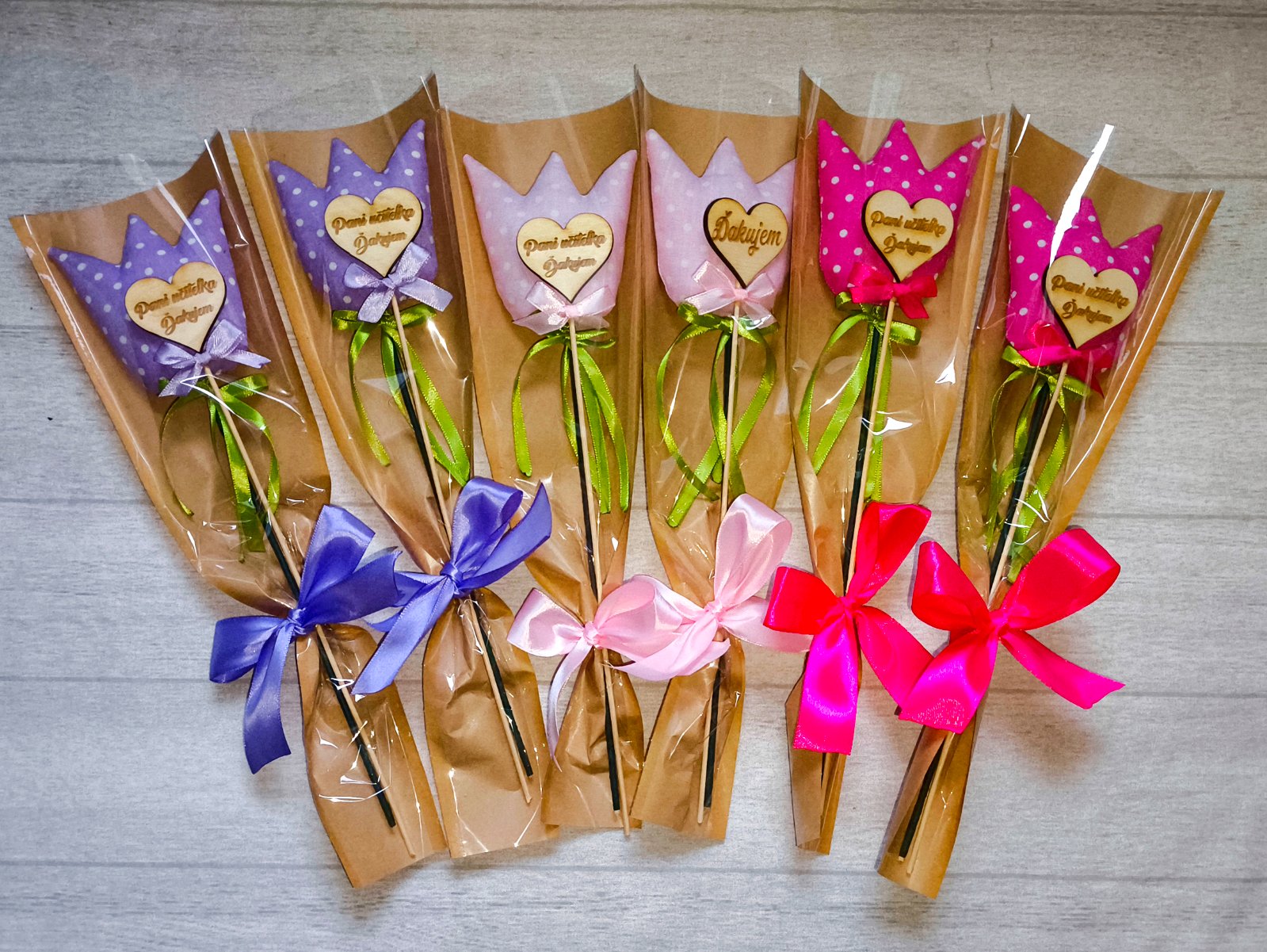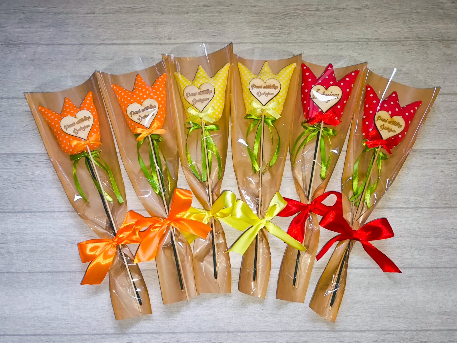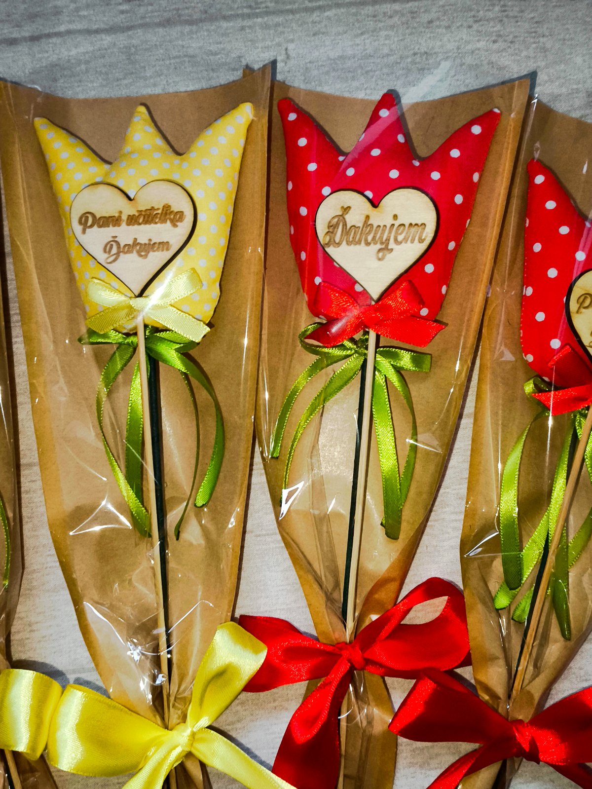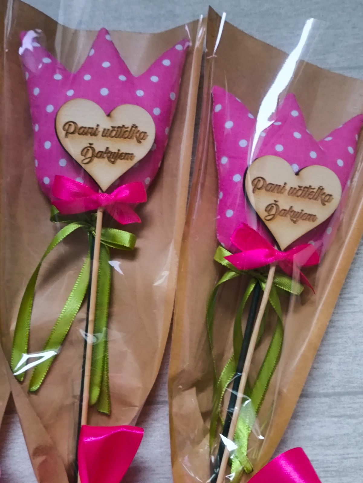 SkladomPonúkam mnou ušité tulipániky. Vhodné ako malý darček . Tulipán je zabalený s dreveným srdiečkom s nápisom Pani učiteľka Ďakujem alebo Ďakujem. Všetko pekne previazané mašľou.