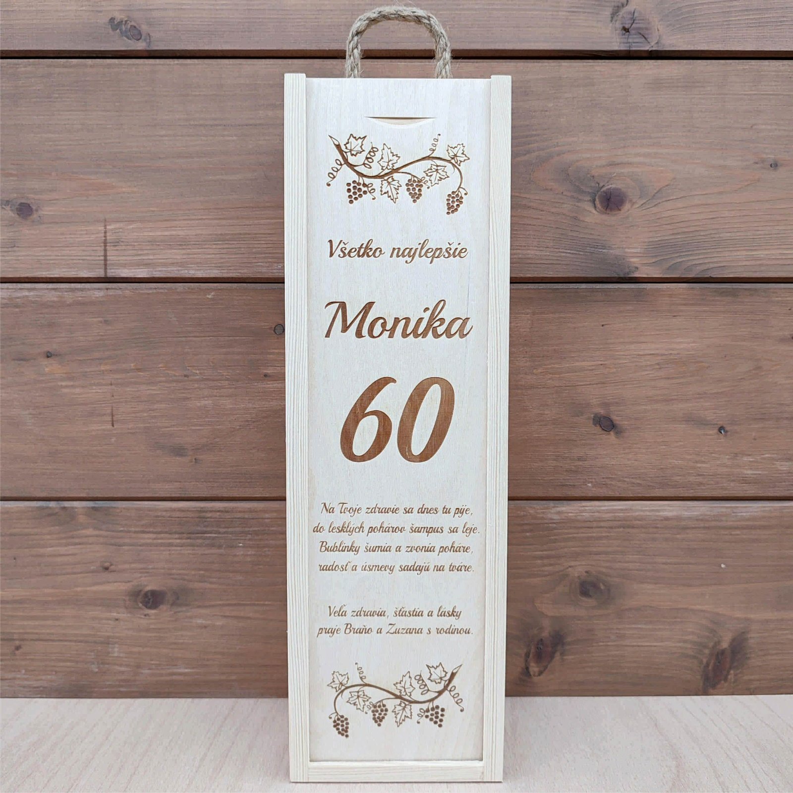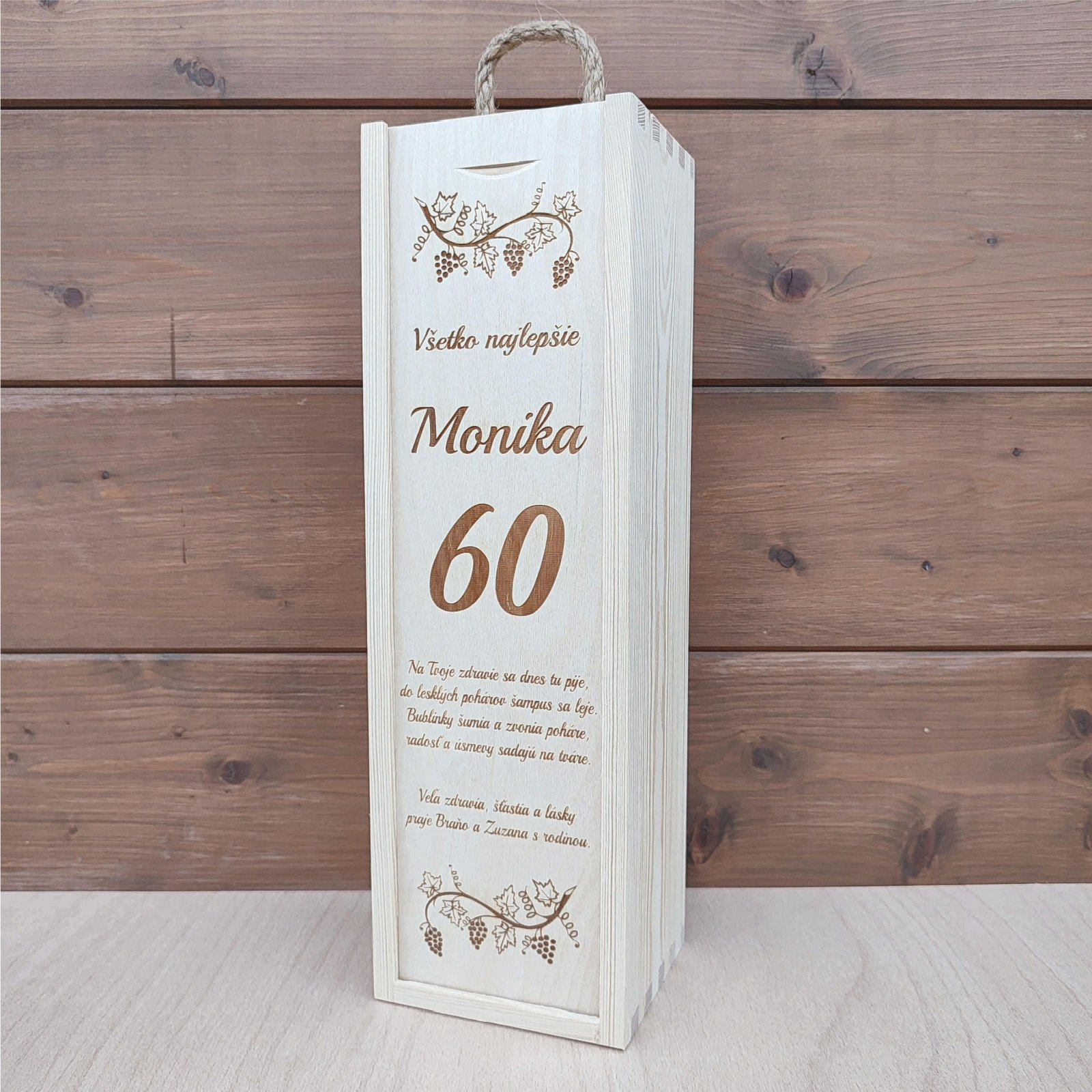 Na drevenú krabicu na víno Vám na mieru vygravírujeme text, venovanie.