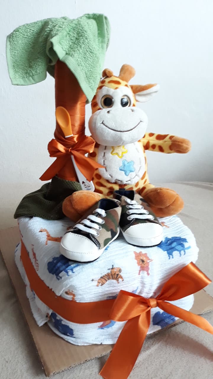 plienková torta obsahuje: 40x plienka č.3, 1x látková plienka, 1x malý uteráčik, 1x capačky 0-6 mes., 1x žirafa, 1x lyžička, 1x nákrčník, darčekové balenie