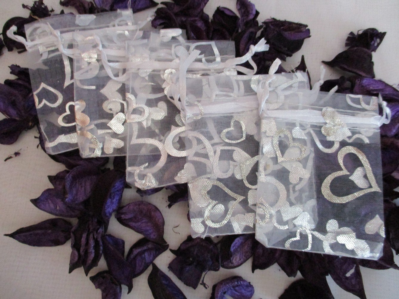 Organzové vrecúška bielej farby so striebornými srdiečkami, hore sa dajú stiahnuť stužkou. Rozmer 7x9cm. Môžete ich použiť ako obal na drobné darčeky pri rôznych príležitostiach, na mydielka, darčeky, plniť levanduľou, ai. Možné použiť ako dekoráciu na svadobný stôl, ako darček pre svadobných hostí, pri krste, oslave, rozlúčke so slobodou, zásnubách, narodeninovej párty, ai. Ak by ste potrebovali inú farbu, veľkosť, prípadne so vzorom, viem zohnať, napíšte a dohodneme sa. Cena 0,18€/ks