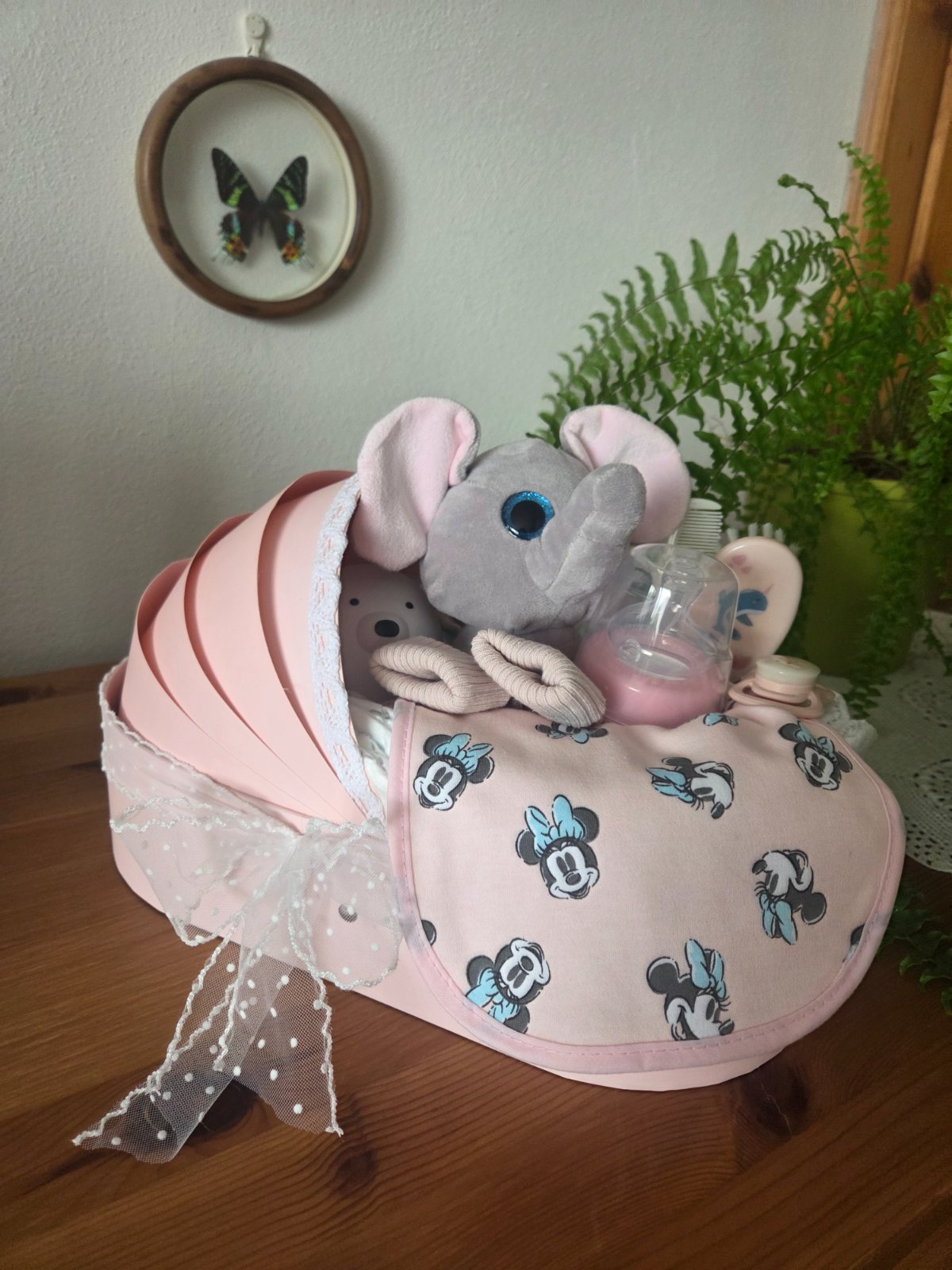 Plienkový box pre dievčatko, obsahuje 20 ks original pampers, sadu na kúpanie, fľašku, cumlík, podbradník, ponožky, kefku a hrebienok na vlásky, plyšovú hračku. Cena 42,00€