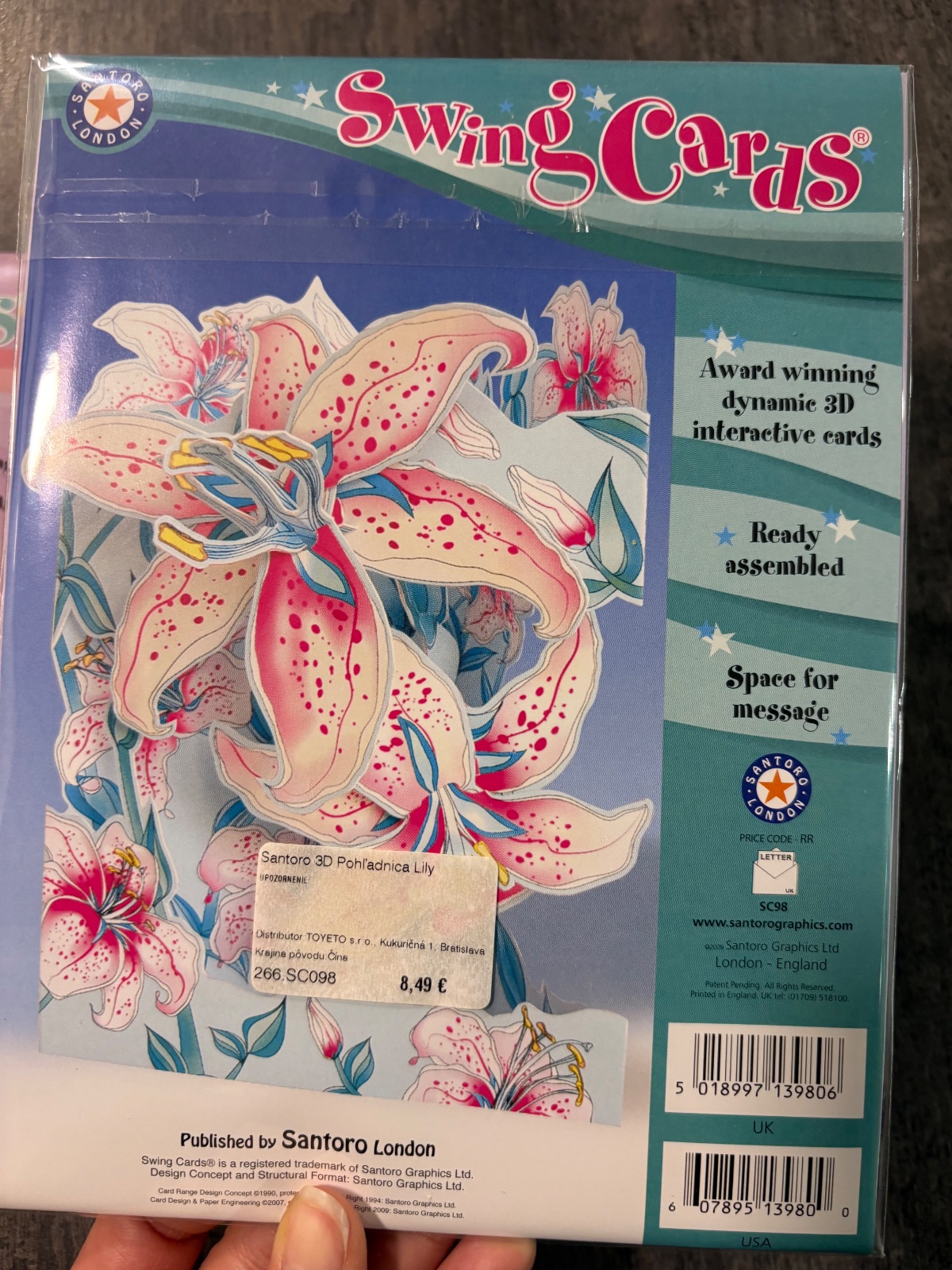 Interaktívne hojdacie 3D karty Santoro so skutočnými pohyblivými komponentmi sa stali prémiovými zberateľskými predmetmi na celom svete • toto ocenené hojdacie blahoželanie, ktoré je darčekom a pohľadnicou v jednom, je ideálne na posielanie blízkym po celý rok • dá sa zložiť naplocho, a dokonale sa tak zmestí do obálky • urobte radosť svojim blízkym a zašlite im toto originálne blahoželanie • nezabudnite pridať aj vlastnoručné prianie • balenie obsahuje 3D kartu a obálku krémovej farby • rozmery: 15 x 20 x 1 cm