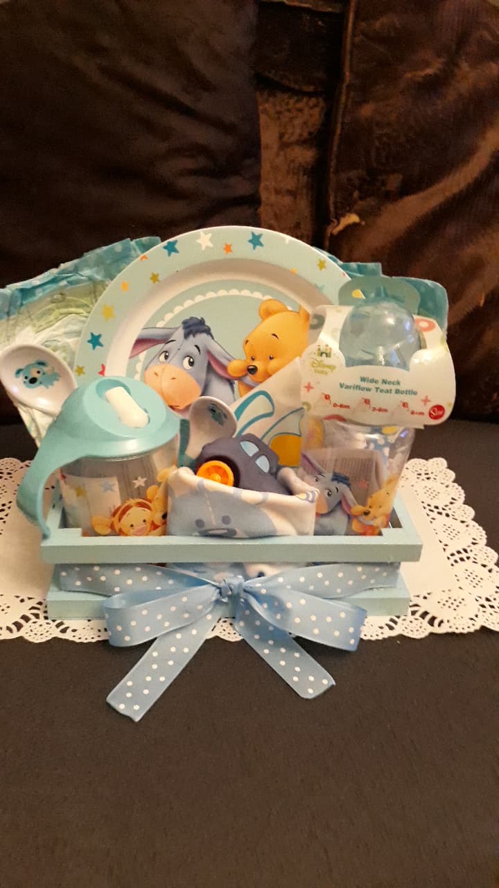 darčekový balíček, obsahuje: 10x plienka č.3, 1x tanierik, 1x fľaška s cumlíkom, 1x fľaška so sosáčikom, 2x detská lyžička ( rôzne veľkosti), 1x látkový podbradník, 1x nepremokavý podbradník, 1x šnúrka na cumlík, 1x autíčko, cena 20 €